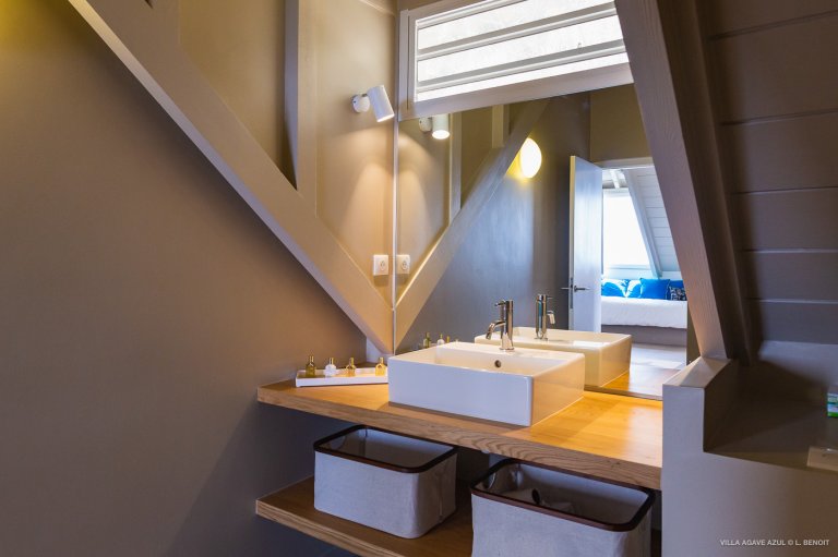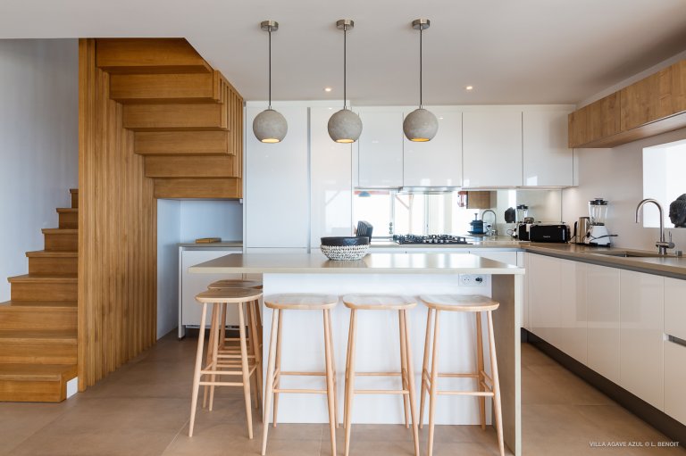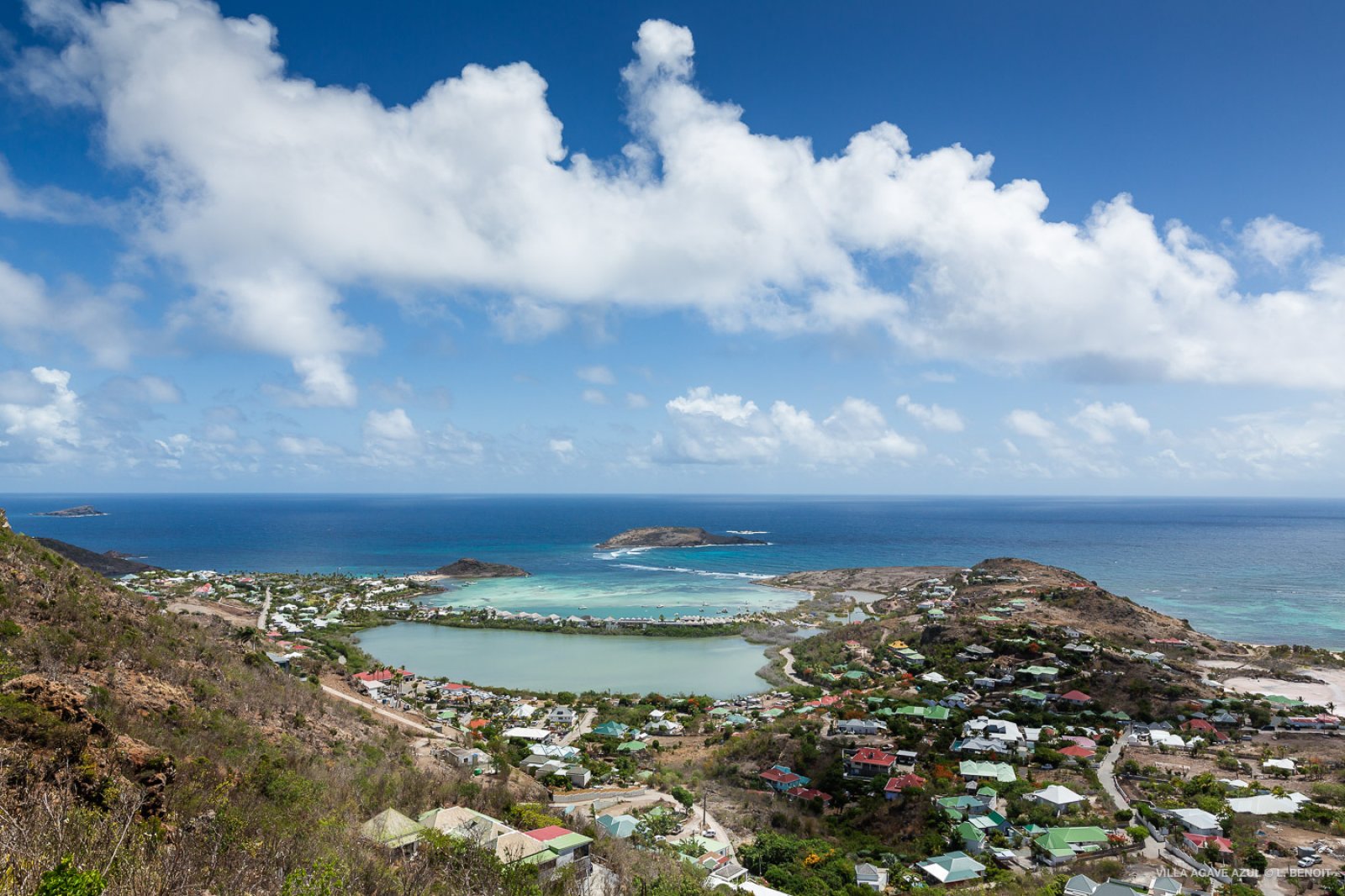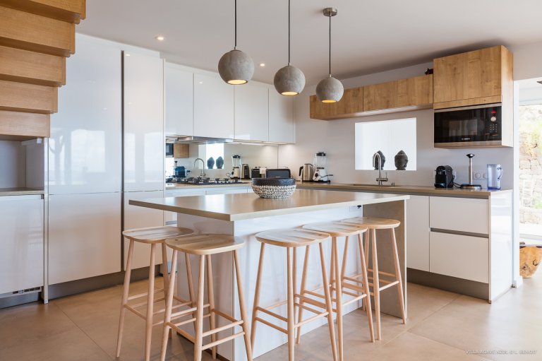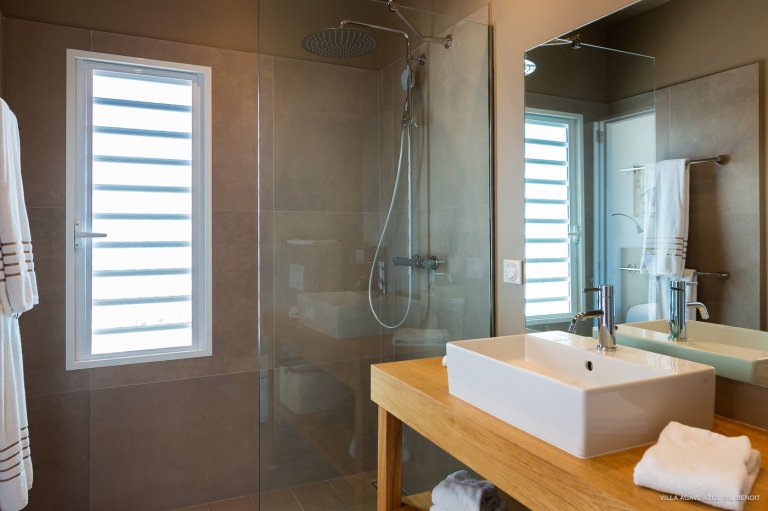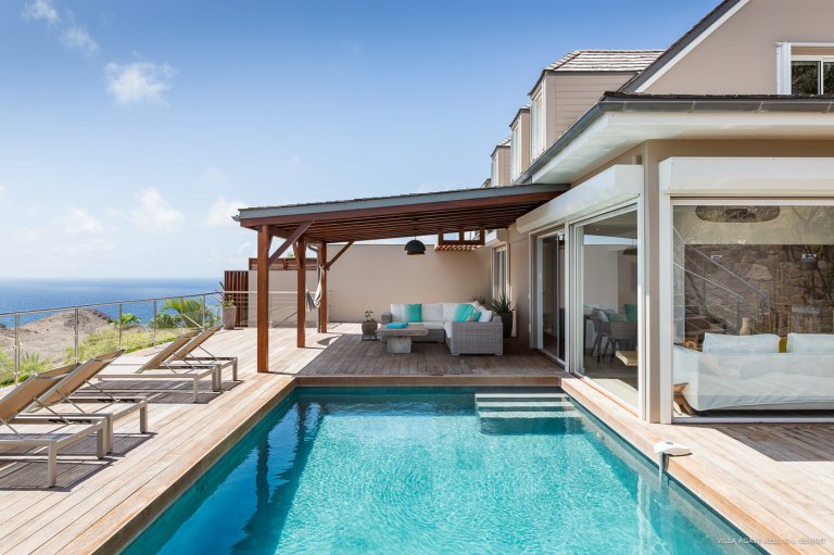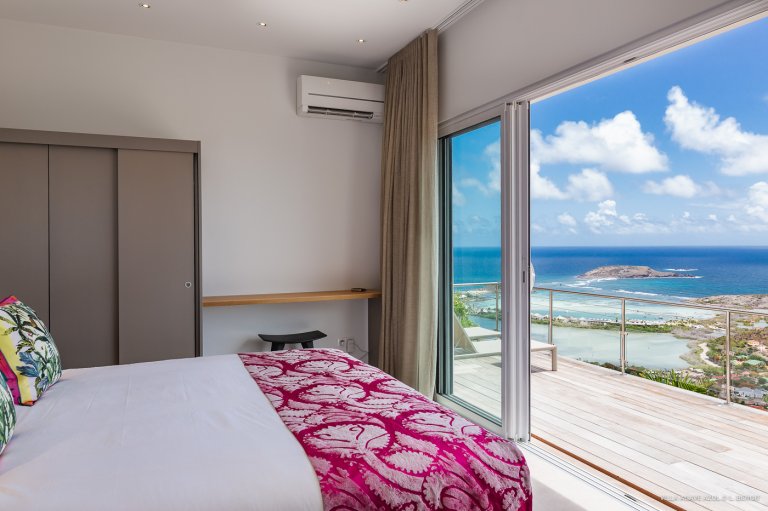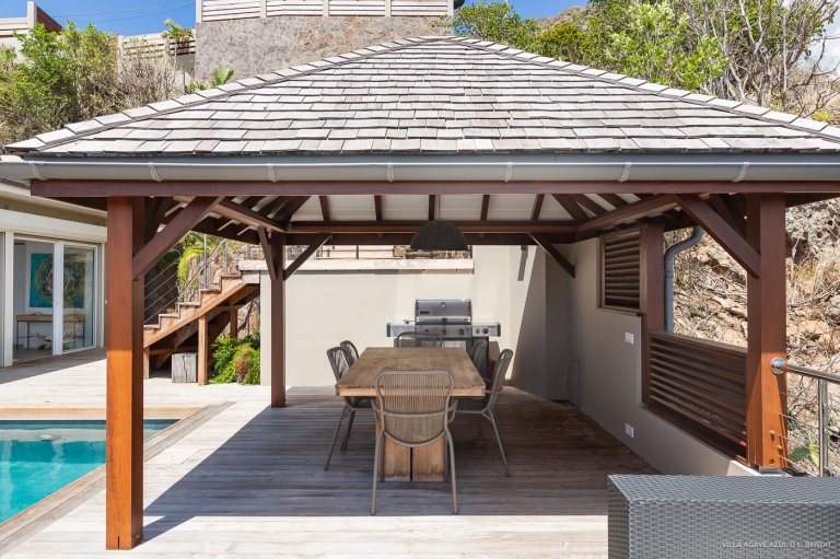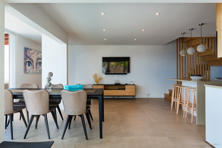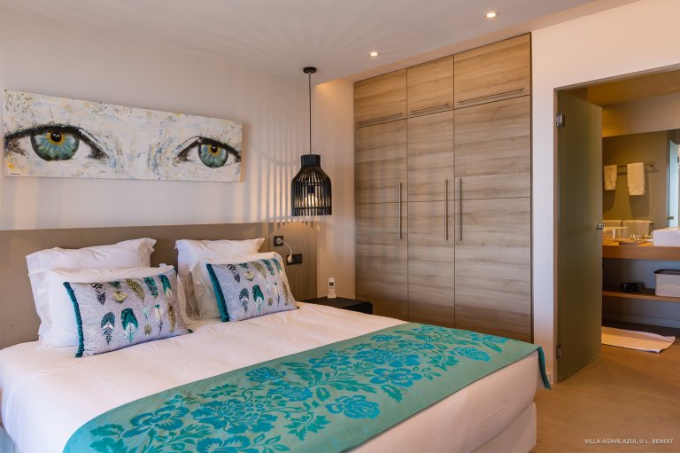 Located on the Vitet hillside high above the turquoise waters of Grand Cul de Sac, Casa Azul (ZUL) offers its guests the peace and tranquility of a very private location while also providing a stunning panoramic view out over the eastern end of the island and the Atlantic Ocean beyond. On the villa's main floor you will find the integrated kitchen, dining and living areas, furnished in dark wood and white fabric, for a clean, contemporary look. Wide sliding glass doors ensure an ocean view from practically every vantage point in the room and also allow easy access to the teak terrace, plentiful and comfortable outdoor seating, and the pool. On this level you will also find Villa Casa Azul's first master bedroom, with an ensuite bath and a view.