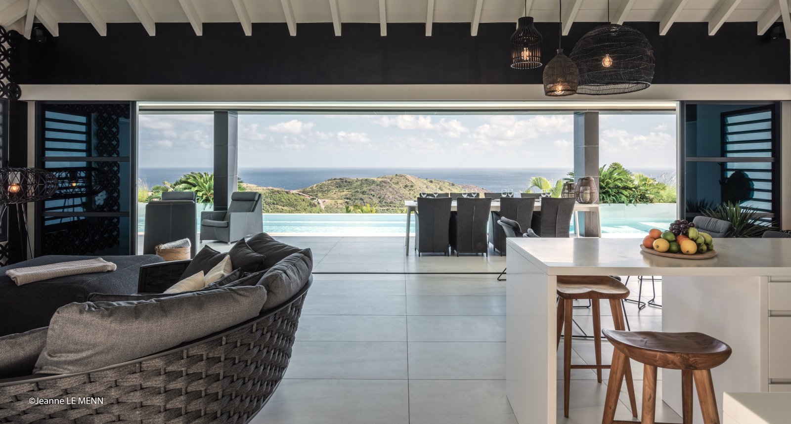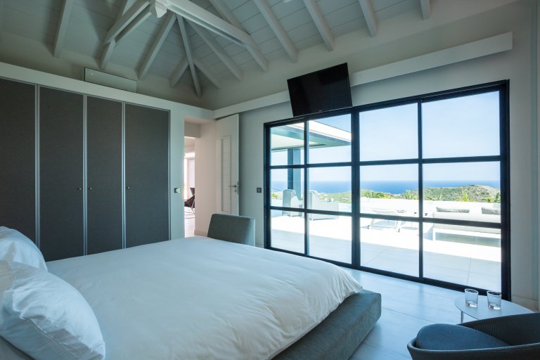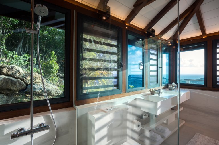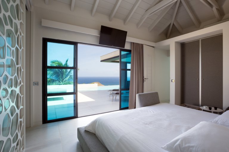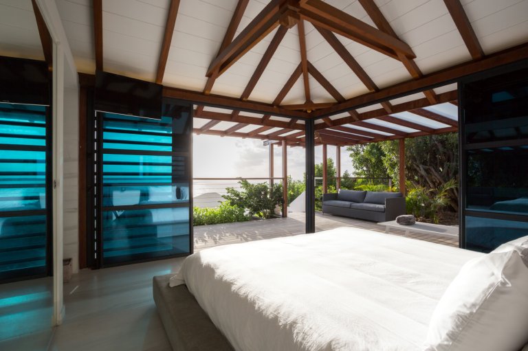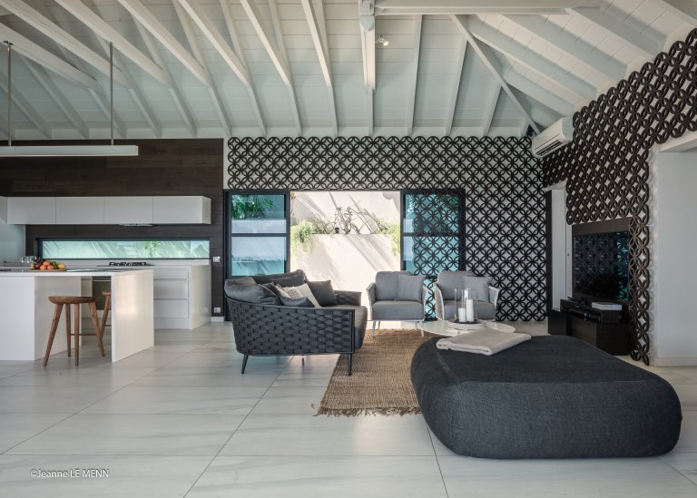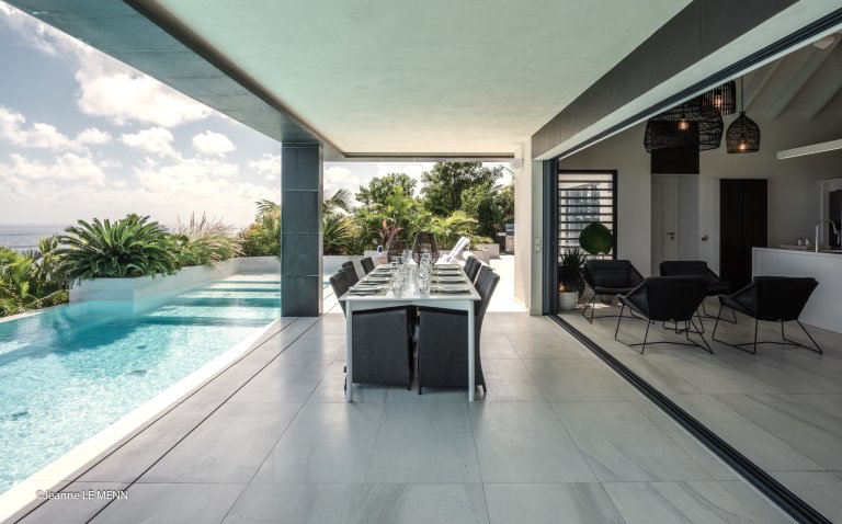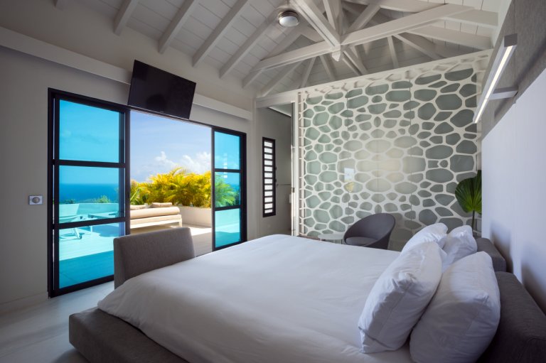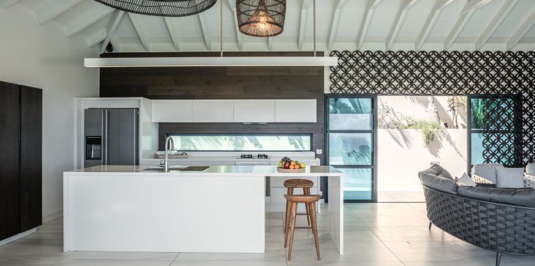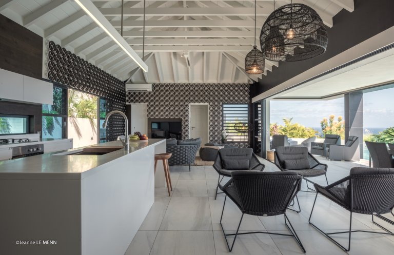 Yet for all the chic design, the real star of Villa Rose Dog (RDG) is the spectacular views of over the Caribbean Sea from Petit Cul de Sac to Toiny Bay, as seen from the quiet hillside of Dévé. That’s what greets you when you first enter the villa, when you cook in the modern galley kitchen—or watch excellent private chefs cook for you—when you dine at the long table, when you wake up in three of the bedrooms and when you relax in the open-air living area, and what’s going to captivate your eye during a stay here. Inside and outside mesh seamlessly in the living area, which is well suited to entertaining, and there are several levels of shaded and unshaded terraces for soaking up sun and cool ocean breezes.