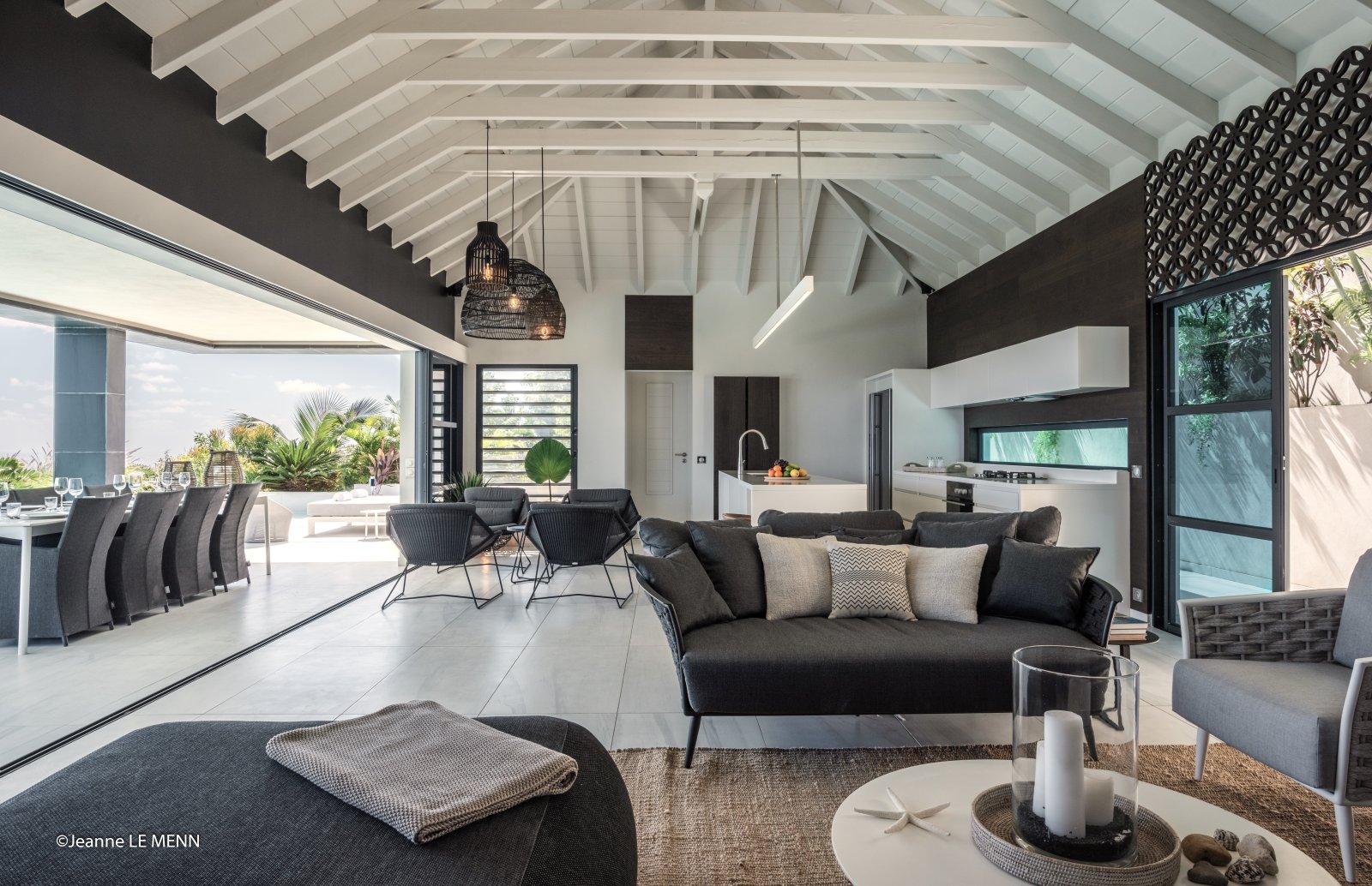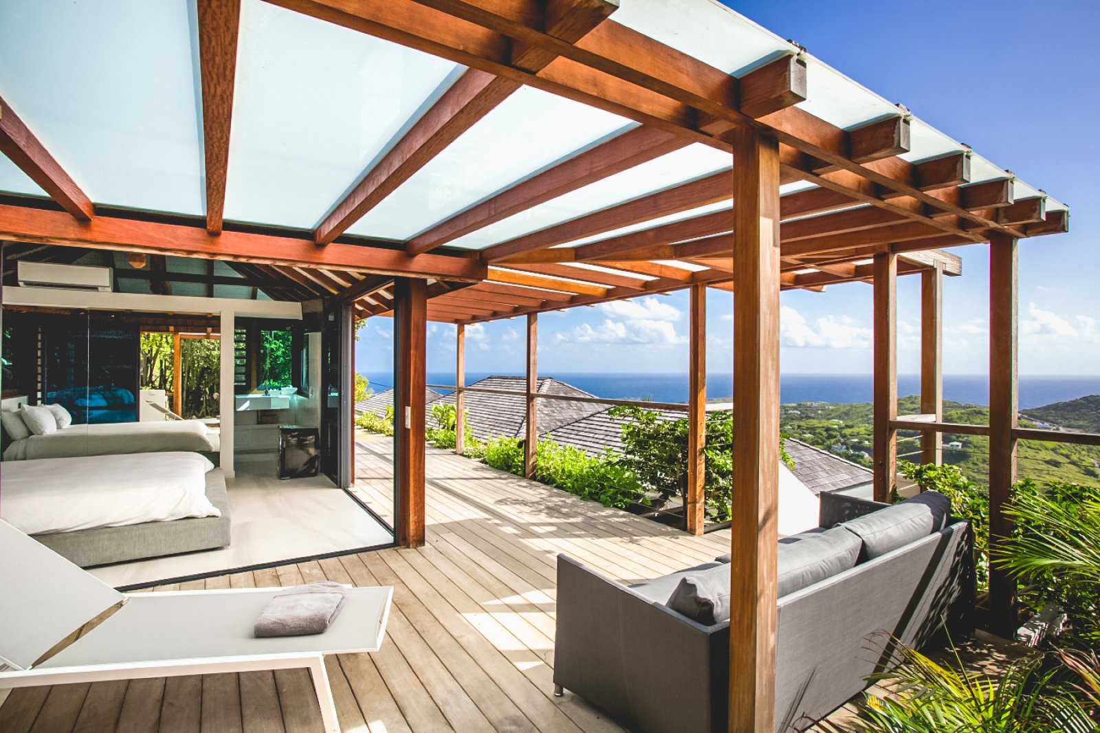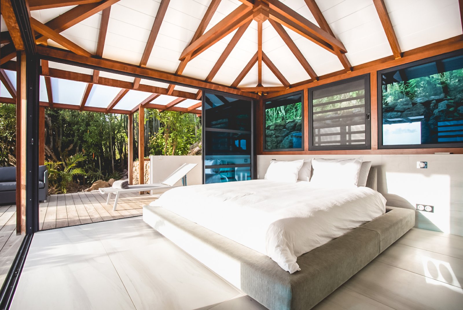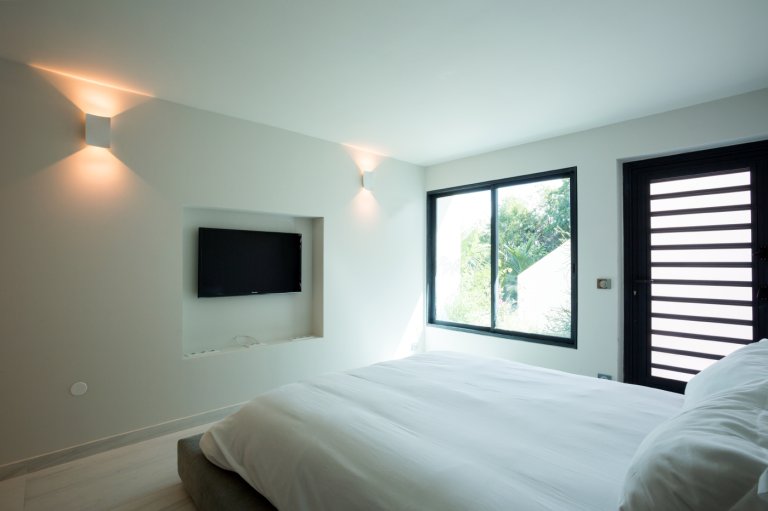Yet for all the chic design, the real star of Villa Rose Dog (RDG) is the spectacular views of over the Caribbean Sea from Petit Cul de Sac to Toiny Bay, as seen from the quiet hillside of Dévé. That’s what greets you when you first enter the villa, when you cook in the modern galley kitchen—or watch excellent private chefs cook for you—when you dine at the long table, when you wake up in three of the bedrooms and when you relax in the open-air living area, and what’s going to captivate your eye during a stay here. Inside and outside mesh seamlessly in the living area, which is well suited to entertaining, and there are several levels of shaded and unshaded terraces for soaking up sun and cool ocean breezes.