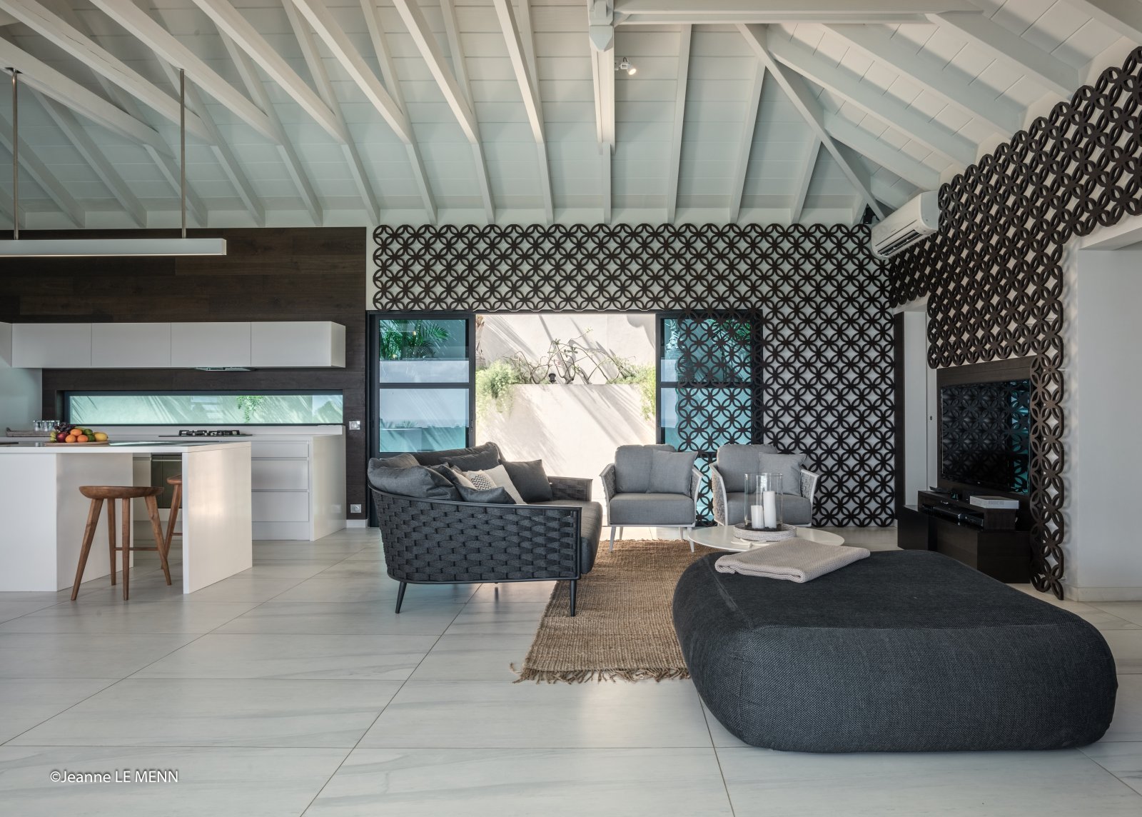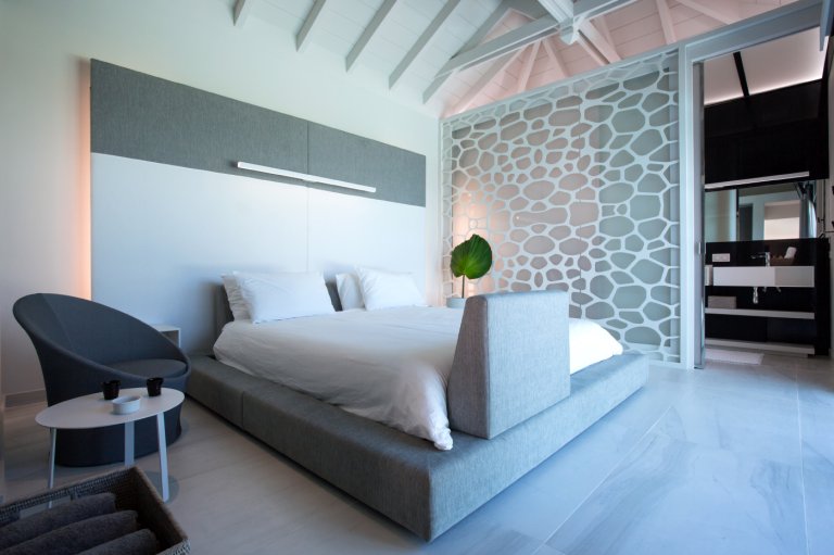 A study in soothing cool grays, white and black, the newly constructed Villa Rose Dog (RDG) exudes a quiet luxury. But the property also has a St. Barth–style spirit of play, as seen by graphic black-and-white wall coverings in the living area and the stylized pink terriers placed throughout, such as inside the sleek back lampshade hanging over the dining table and on the walls of the open-air living area. It’s a comfortable, welcoming sanctuary with a flexible configuration that makes it suited to couples on their honeymoon and larger families on vacation alike.