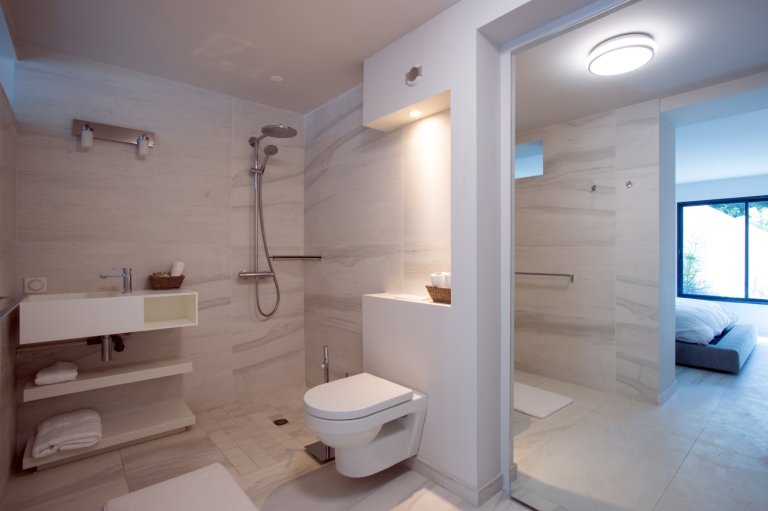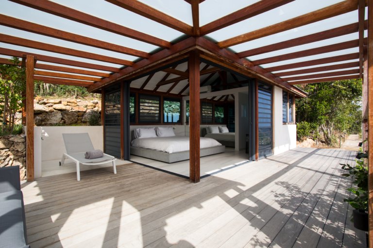 Villa Rose Dog (RDG) has two master bedrooms that are connected to the main living area and open through sliding doors onto the pool deck. A third full bedroom is in a separate bungalow on a higher level with its own private entrance, terrace, kitchenette and bar, making it ideal for a casual alfresco breakfast or cocktails. All three have an understated elegance, with gray pebbled walls, light-colored floors and peaked ceilings, and crisp white linens on their queen platform beds, as well as those alluring vistas outside their large windows. There’s a fourth, simpler bedroom, which is suitable for teenagers or staff, in a bungalow on a lower level.