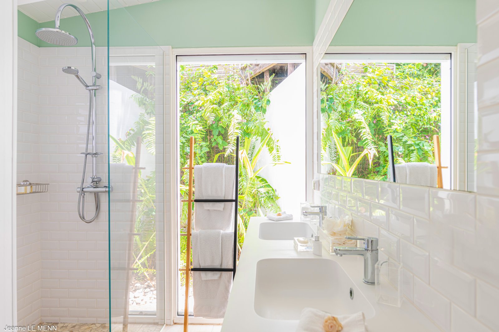 The lower level also has the swimming pool, spacious deck, and a Jacuzzi, all of which have partial views over Flamands Bay and Bonhomme Island. A fitness room occupies its own bungalow next to the main level at the rear of the property. The villa offers two parking spots.