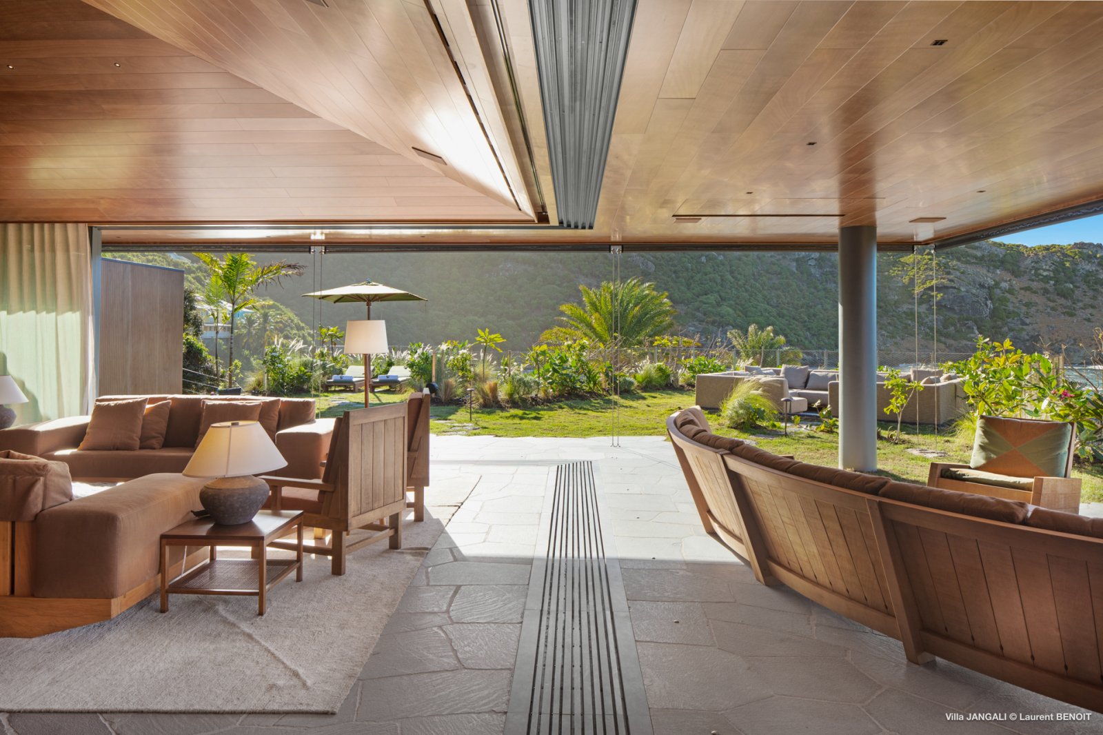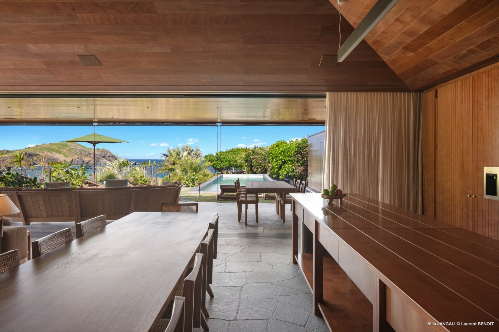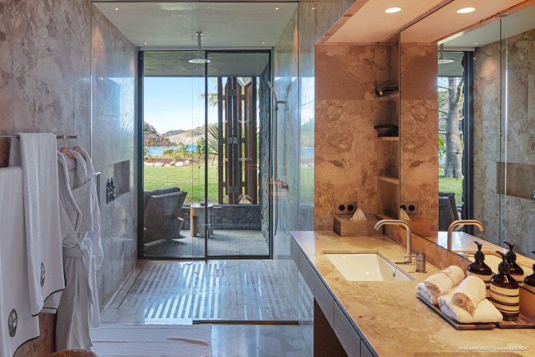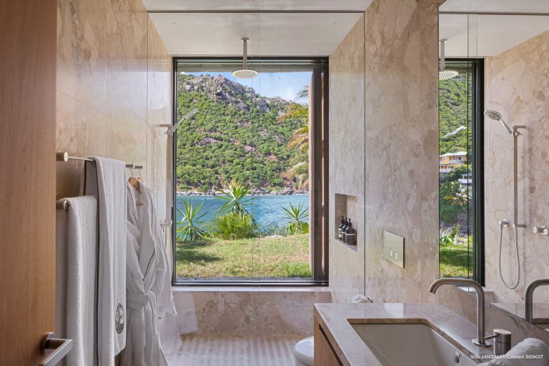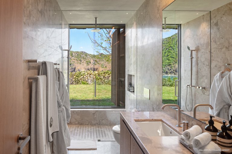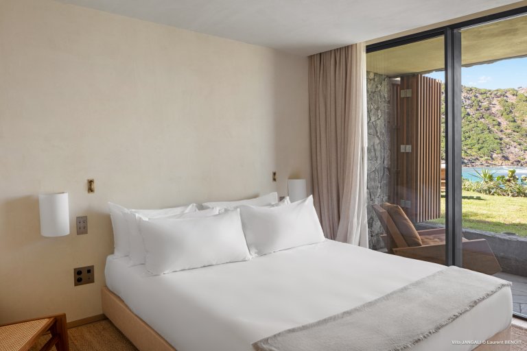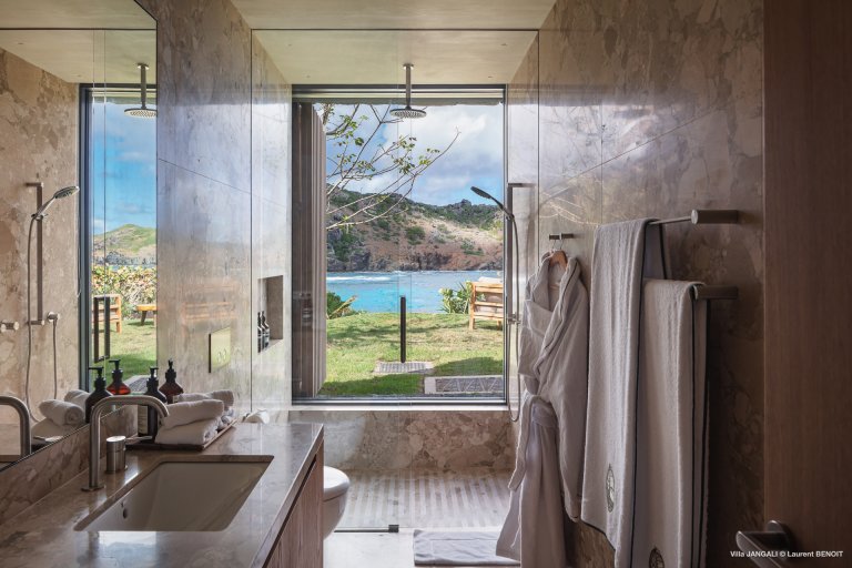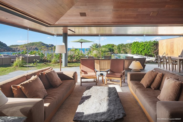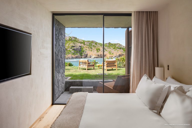 Villa Jangali stands in a category of its own, both for its refined design and its rare location at the tip of Flamands, overlooking the tranquil waters of Petite Anse. Conceived by renowned Brazilian architect Isay Weinfeld, the home is spread over a large private estate and seamlessly integrated into its natural surroundings. Warm earthy tones, wood, and natural stone create an enveloping atmosphere that feels both understated and elegant. Vast gardens planted with island flora add to the sense of space and seclusion, while the heated infinity pool offers a spectacular focal point with views stretching toward the sea.