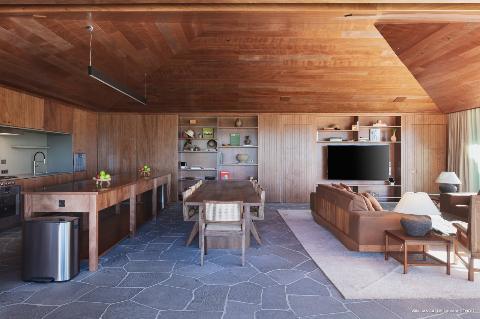 Generous living areas flow between interior and covered outdoor spaces. The main salon and kitchen can be fully air-conditioned for comfort or opened entirely to let the outdoors in. The kitchen itself is exceptionally well equipped, designed to blend organically with the interior spaces.