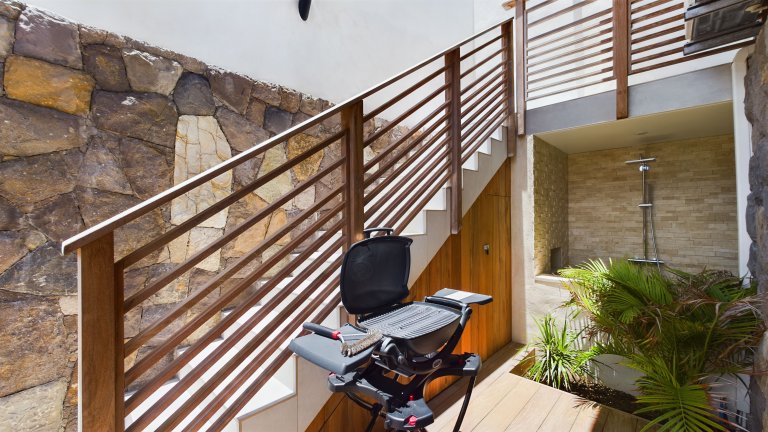 The bedroom, which has a king-size bed, is on the main level and opens up to the pool and sundeck. It also has an outdoor shower. The living area and kitchen are upstairs. The villa is fully air-conditioned and has televisions in the living room and bedroom with Dish Network.