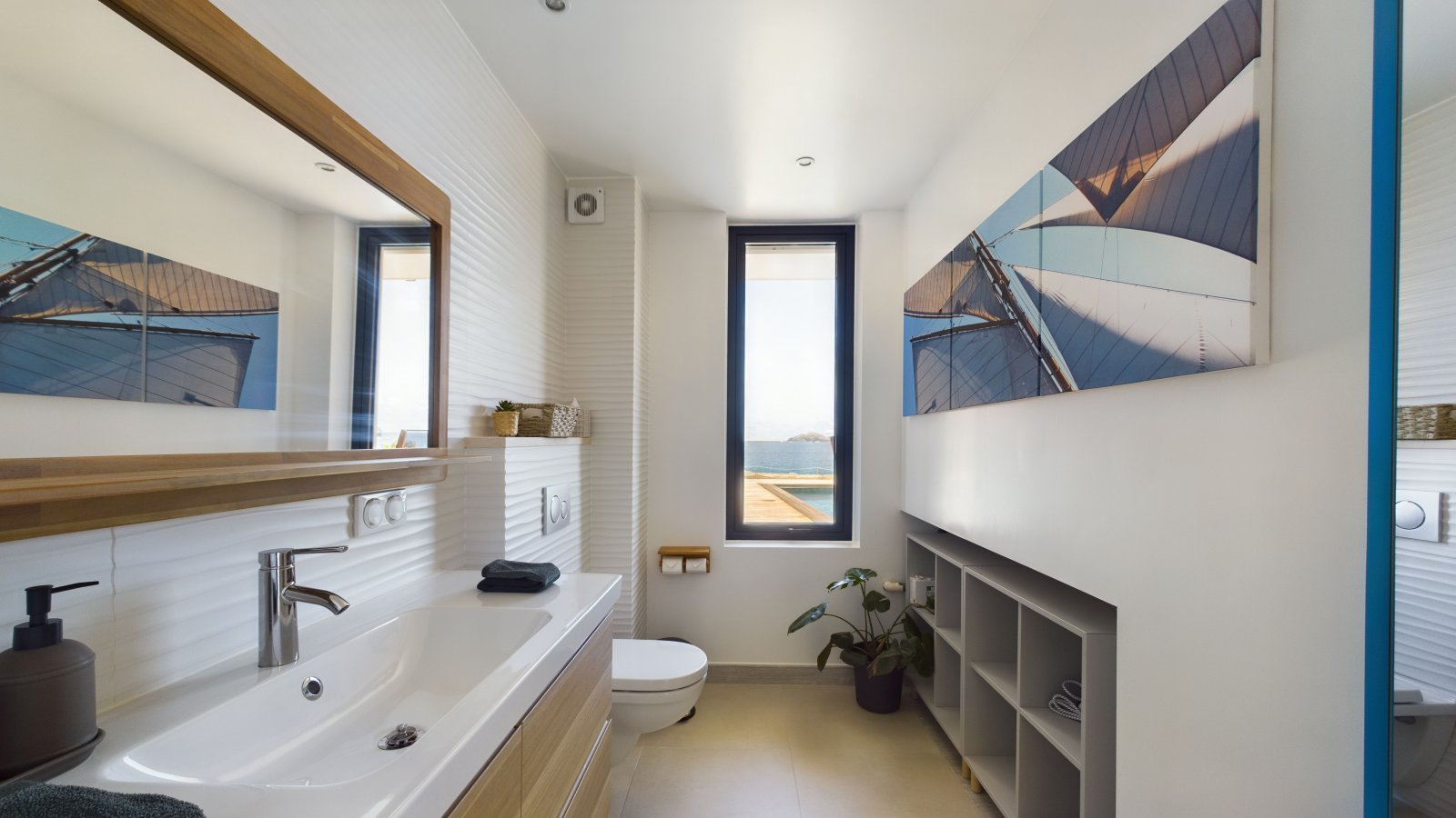 The design is minimalist but comfortable, making for an easy-living ambience. The walls are white, the fabrics are neutral, and the windows are large. There are sea views from every corner. Outside, a long, heated pool takes center stage on a large sundeck with different areas for sitting, lounging, and alfresco dining—perhaps something seared on the outdoor grill.