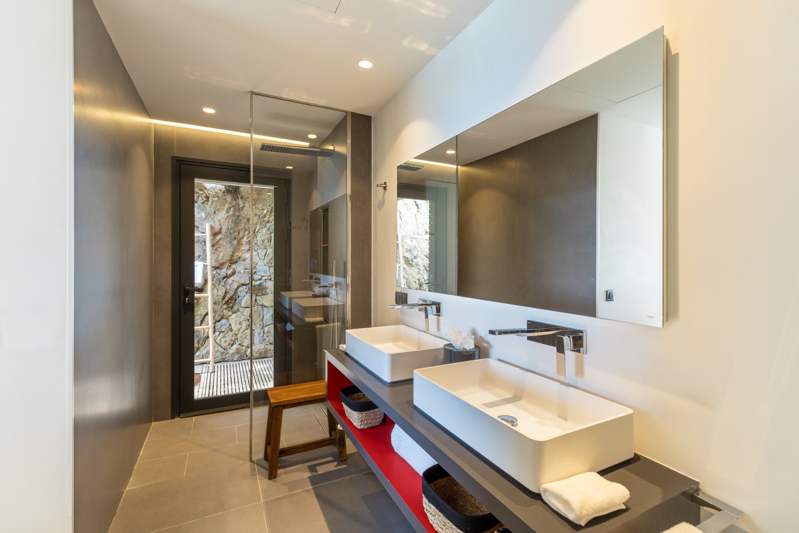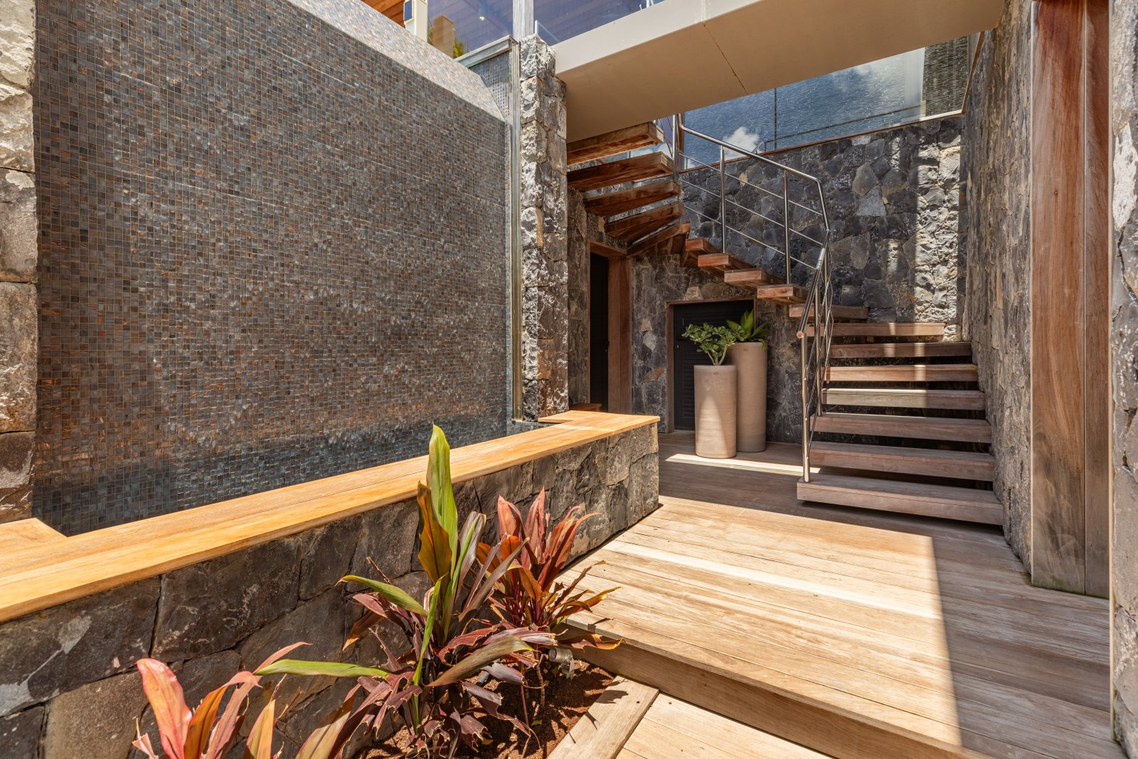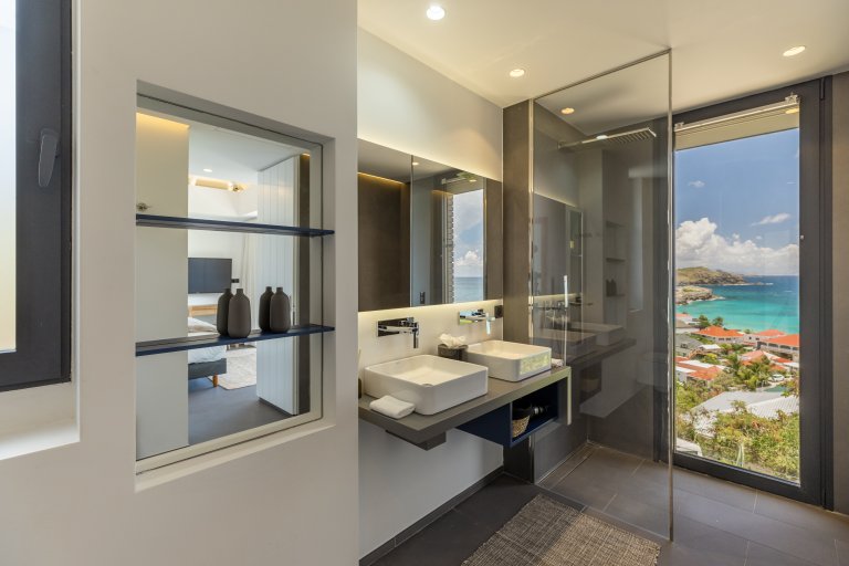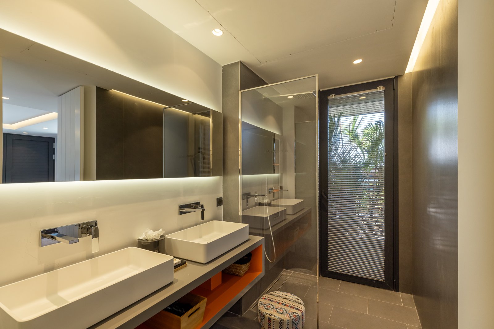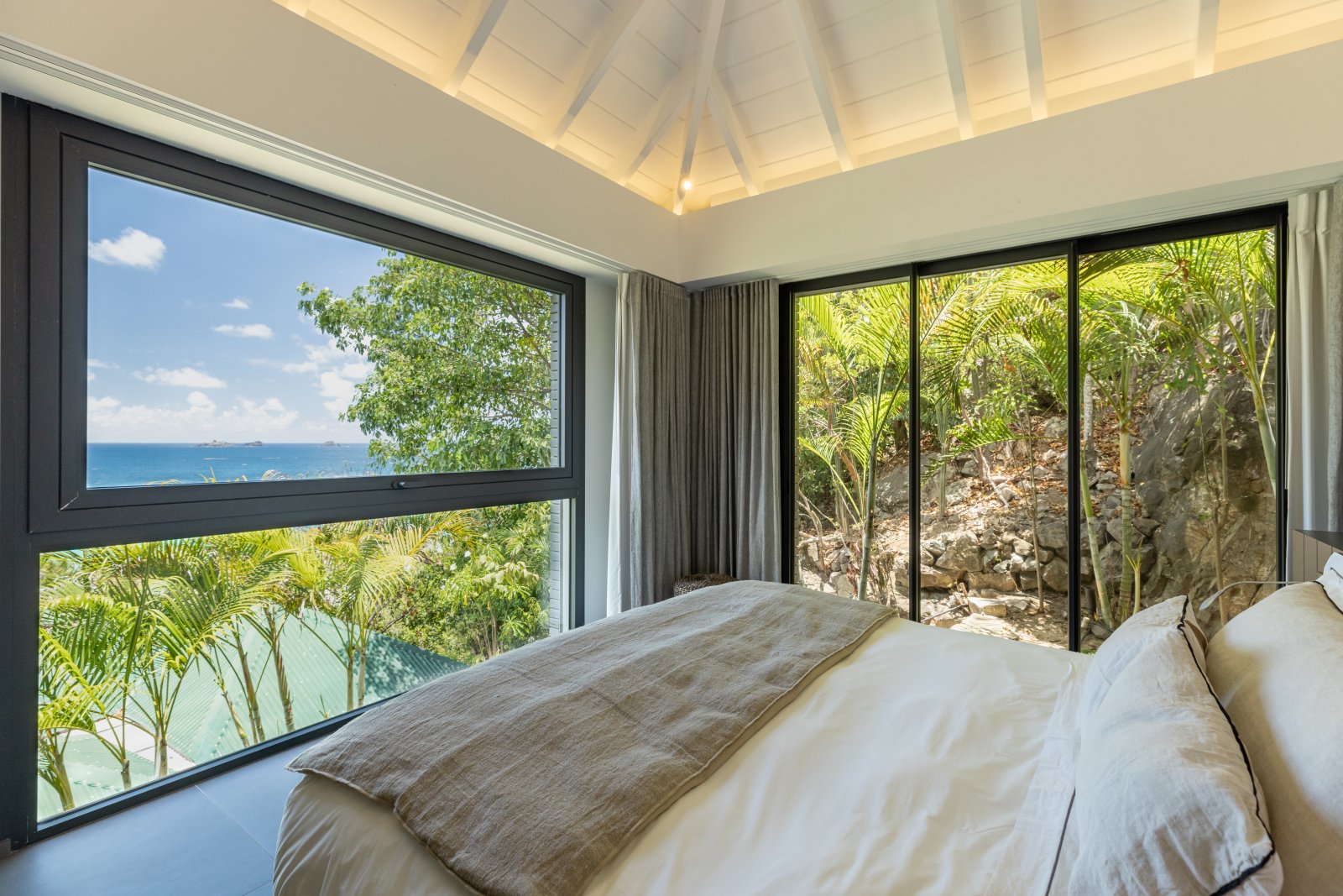Terrific location and authentic design are one of the hallmarks of the newly built Villa Santa Alicia (SAN) in Flamands. The living room and kitchen are wide open to the weathered-wood deck, and each of the two bedrooms on the main level has captivating watery vista. Sumptuous, organic-feeling materials are used throughout. The living area, open-air kitchen connected-to-nature feeling of Villa Santa Alicia and leafy plants add life to many corners of the luxury rental property.