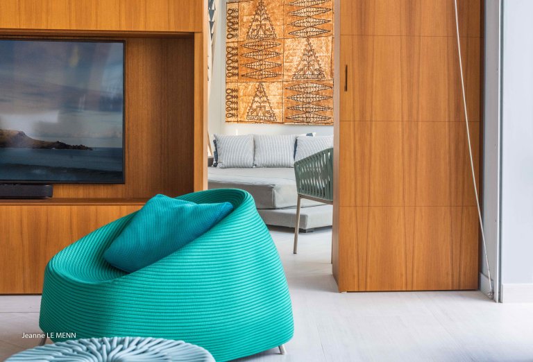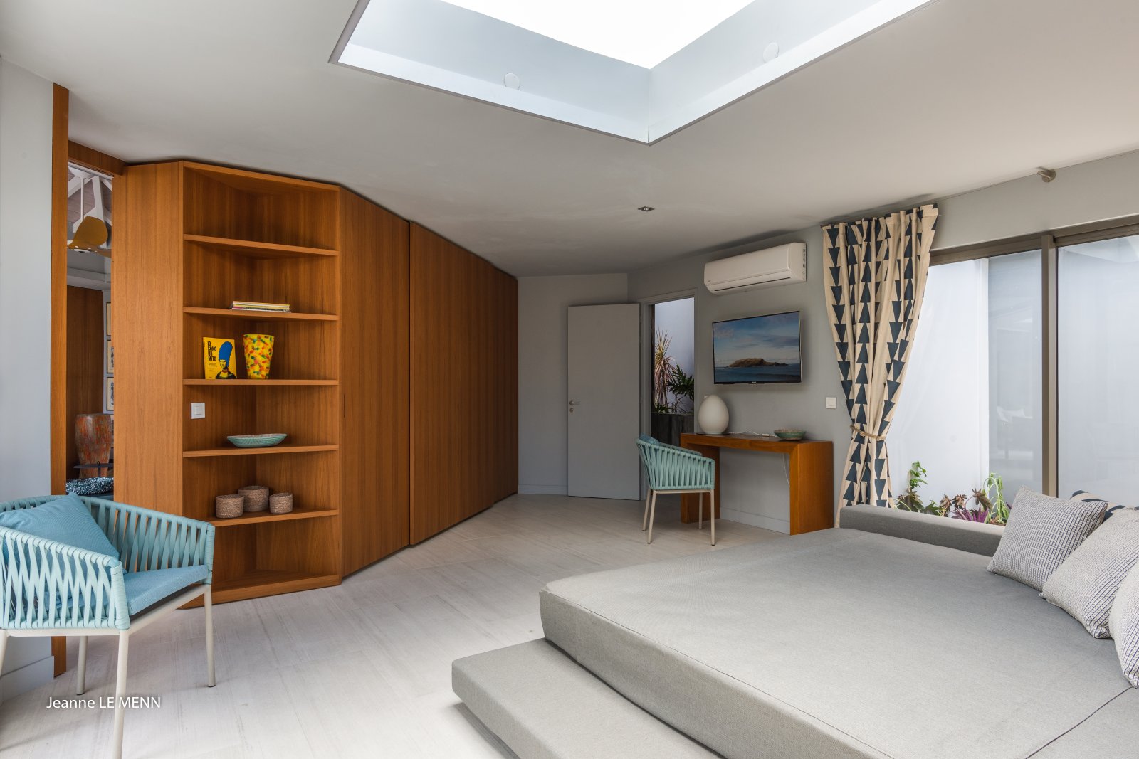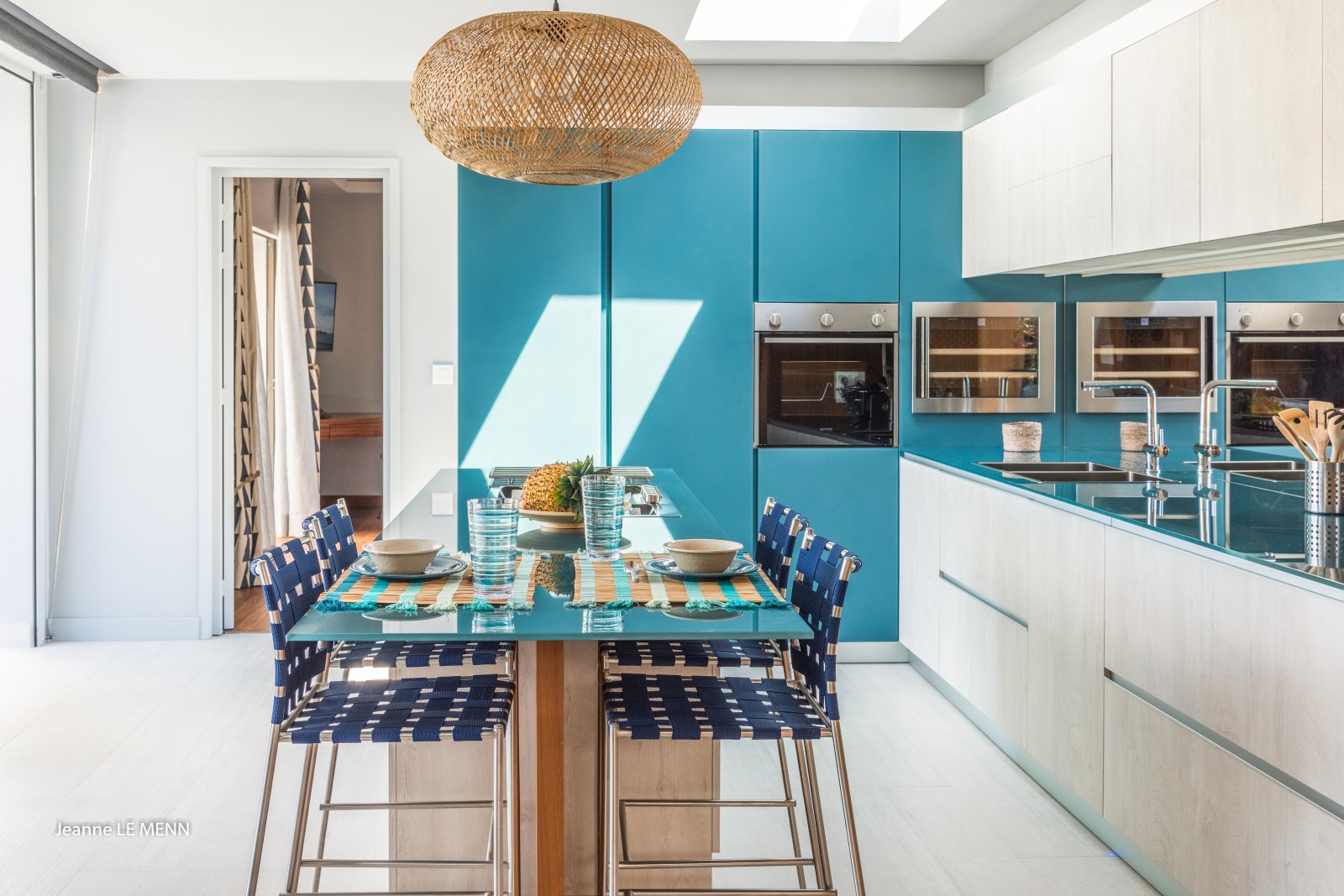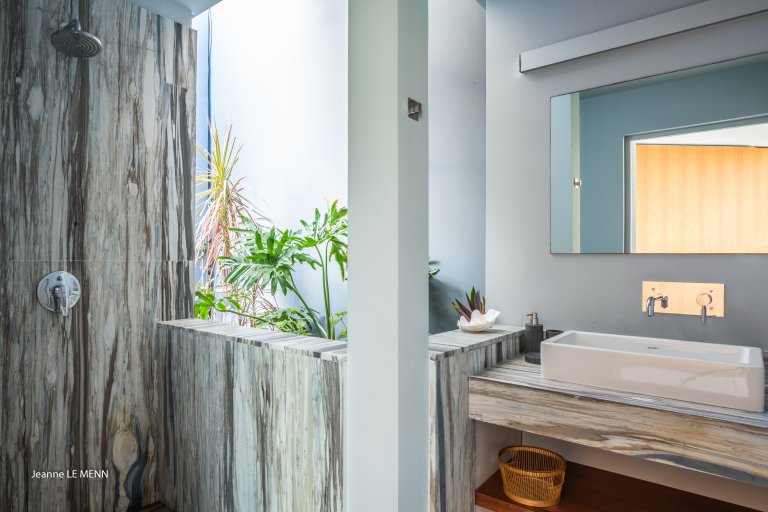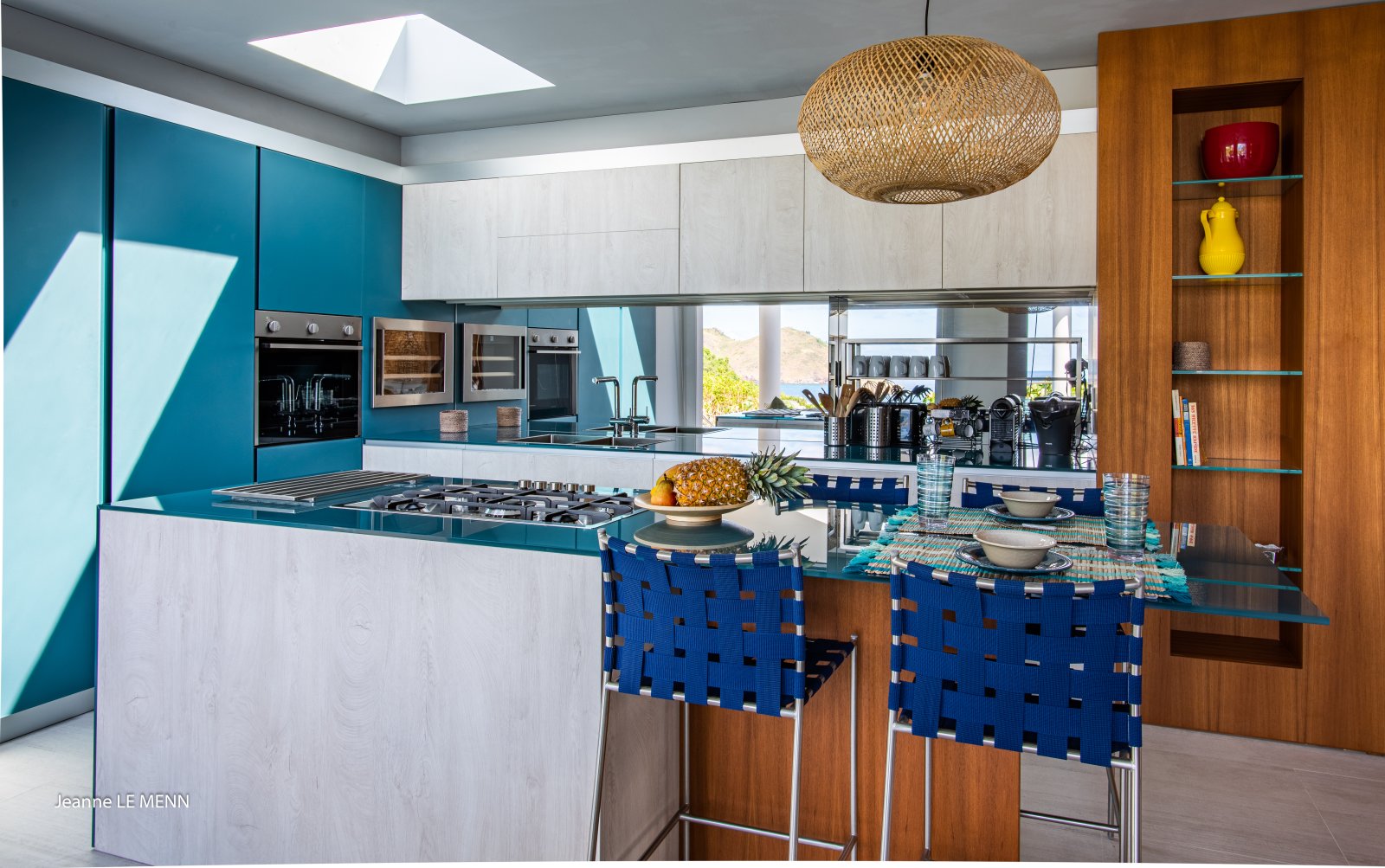 The property is cleverly designed to maximize sunlight, and the open floor plan helps to maximize family interaction and shared moments and memories. The large living area is open to the elements on both sides and close to the heated pool. It has plush, comfy couches as well as a chic Le Corbusier chaise. The dining table is in the middle of the free-flowing living space and the kitchen is off to one corner.