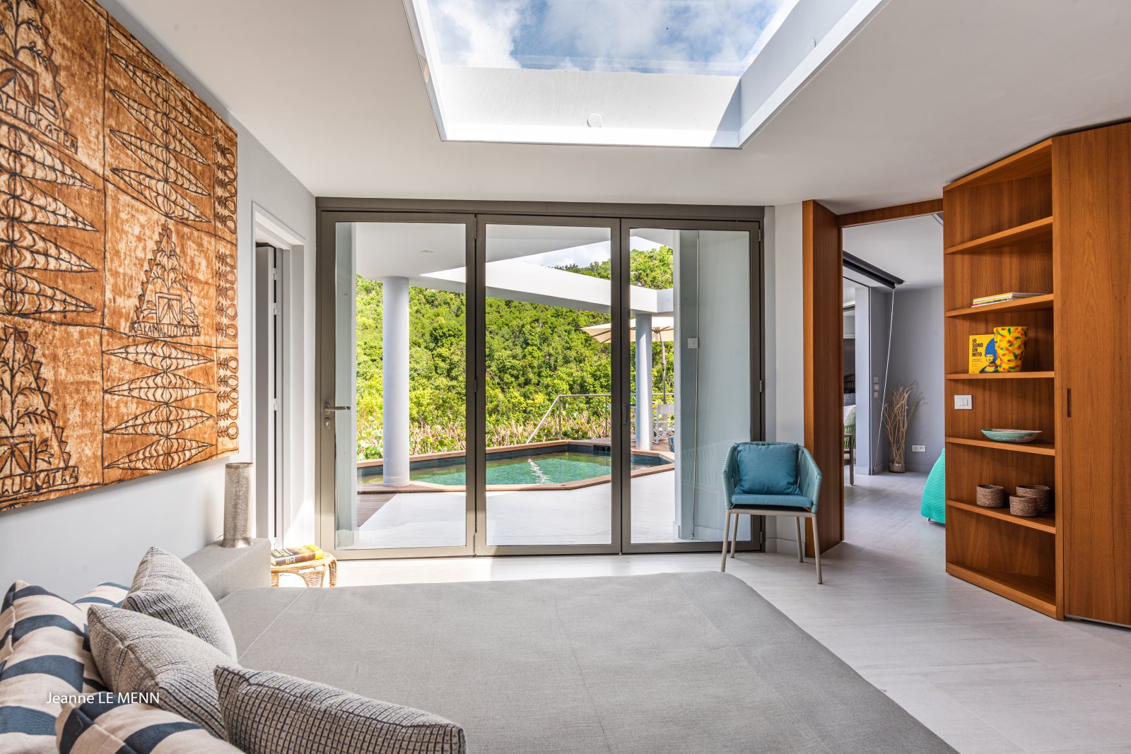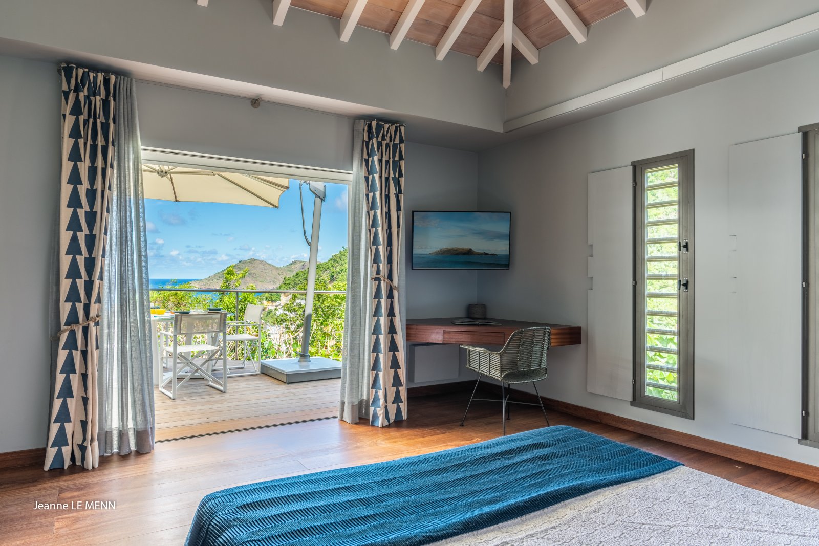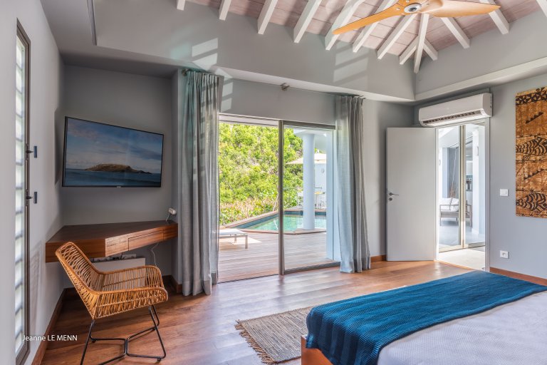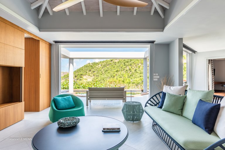 When you picture a classic St. Barth villa, you probably picture something like Villa Triagoz (TRI). The luxury rental home is very well appointed but traditional in design, with high vaulted ceilings, a lot of white furniture, an indoor-outdoor layout, and an infinity-edge pool with beautiful views. In fact, there are many pleasing views to be seen from within Villa Triagoz, both over nearby Flamands Beach and over the green countryside.