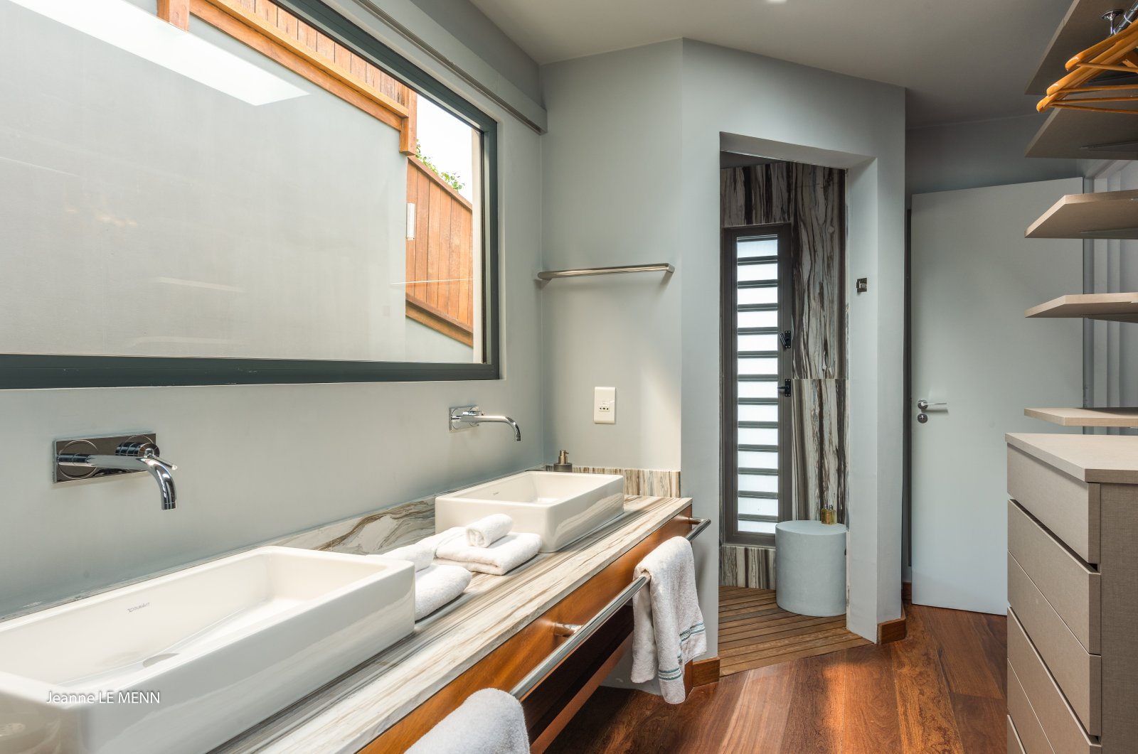 There are two master bedrooms, one on each side of this common area. Each has a European king-size bed and an ensuite bathroom with a shower. The smaller third bedroom is connected to one of these master bedrooms and has a queen-size bed.