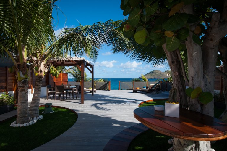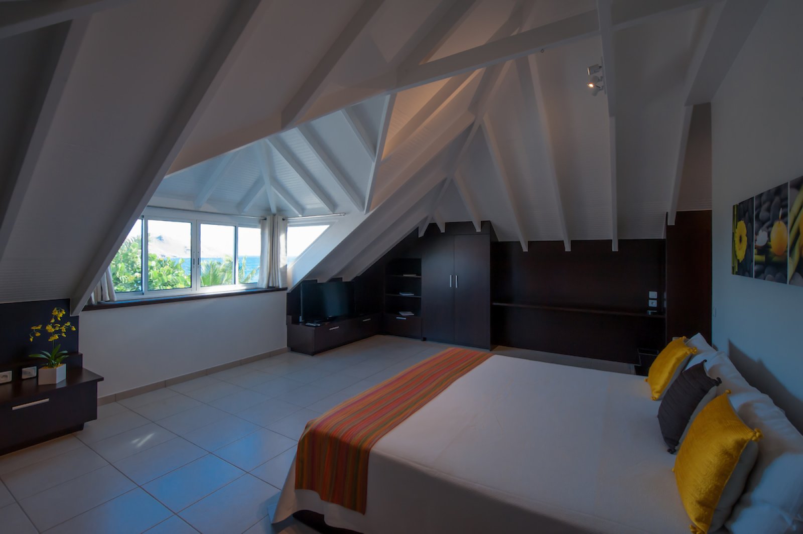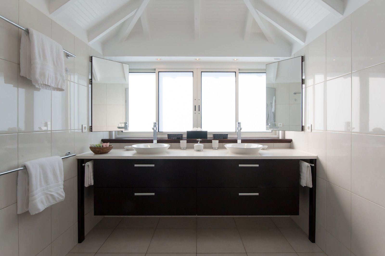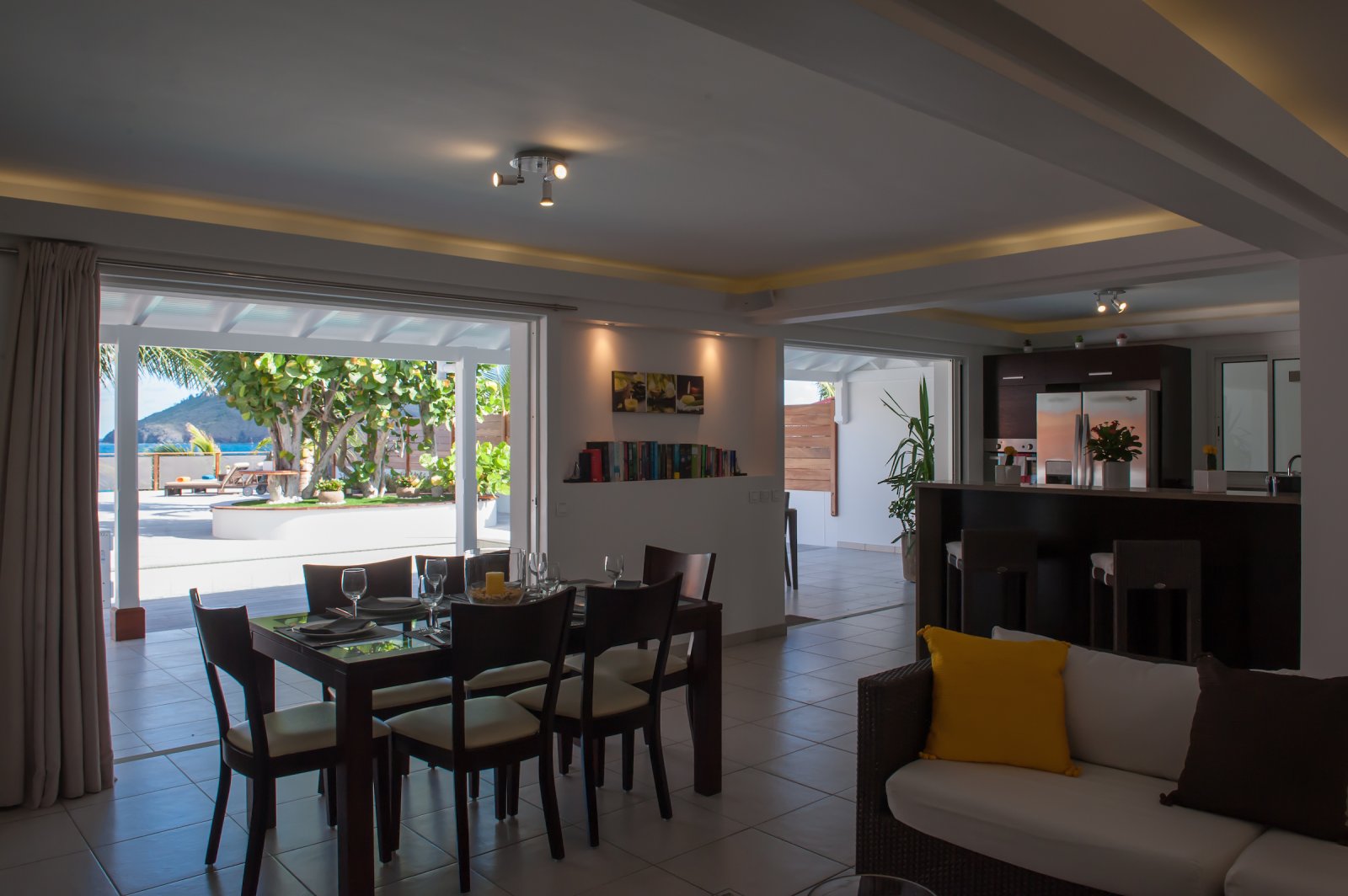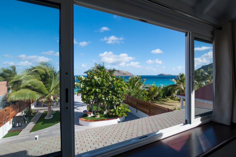 Villa Micela master bedroom and ensuite bathroom are located on the second floor, providing a gorgeous view of the ocean with the islet of Bonhomme in the distance. The second bedroom is on the garden side of the ground floor, with its own ensuite bath and two twin beds the can be converted to a king. The home is decorated throughout in a simple, modern fashion that fits well with the beachfront lifestyle. Dark wood and accents of pale colors create a relaxing atmosphere. The well-equipped kitchen has plentiful counter space and is laid out to make cooking fun and social.