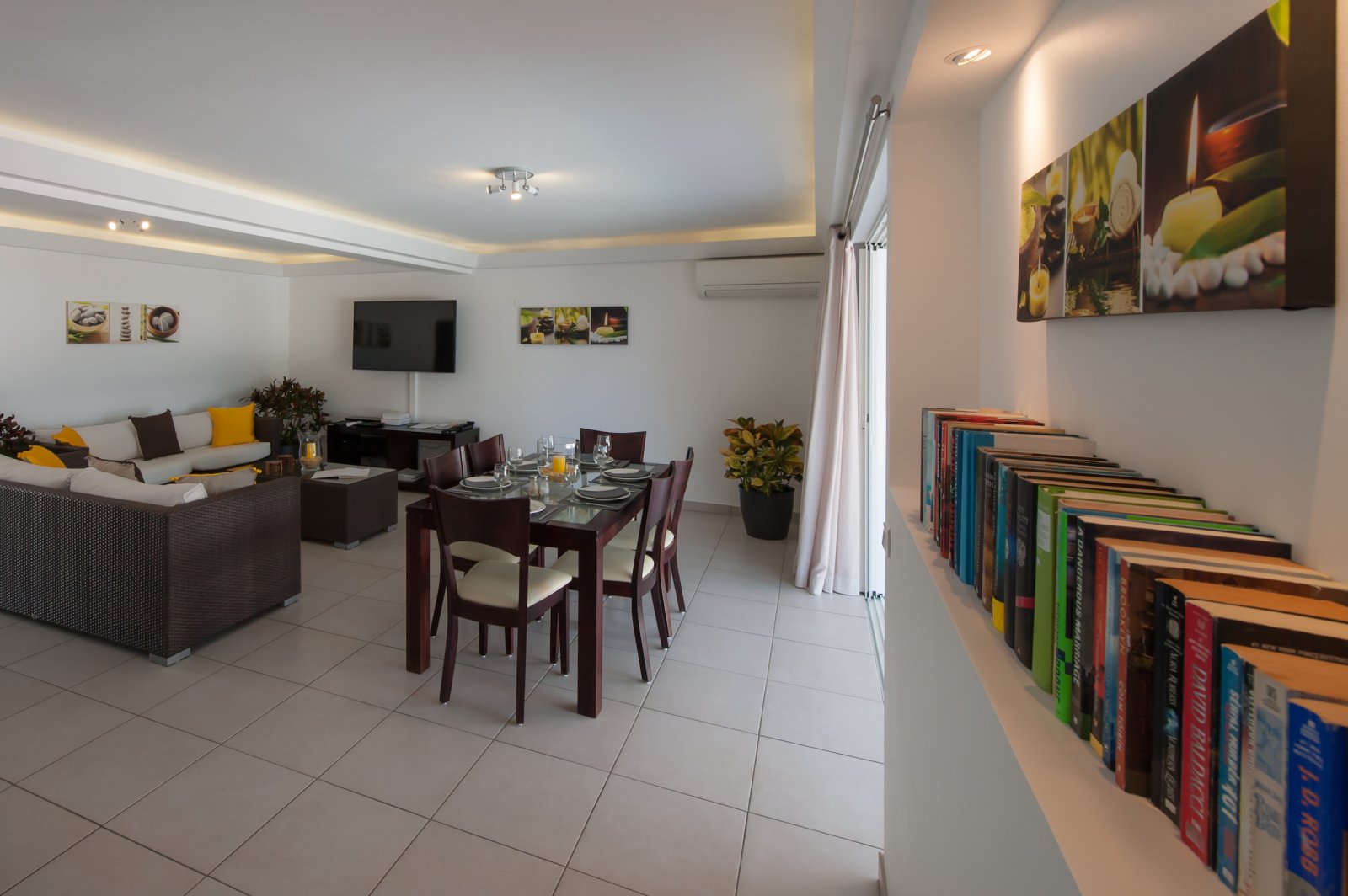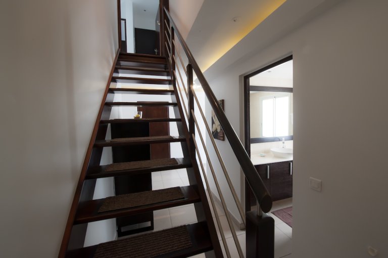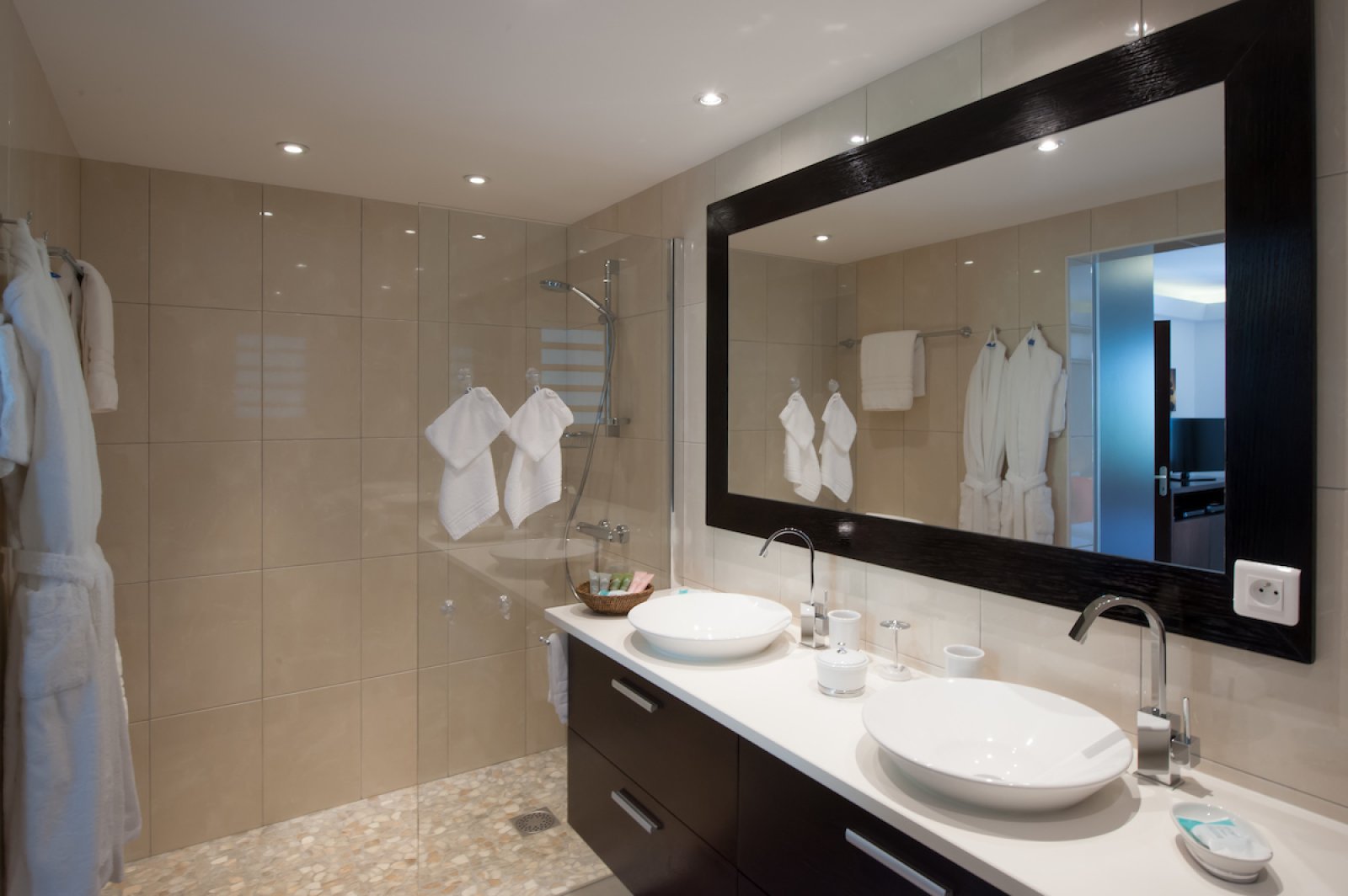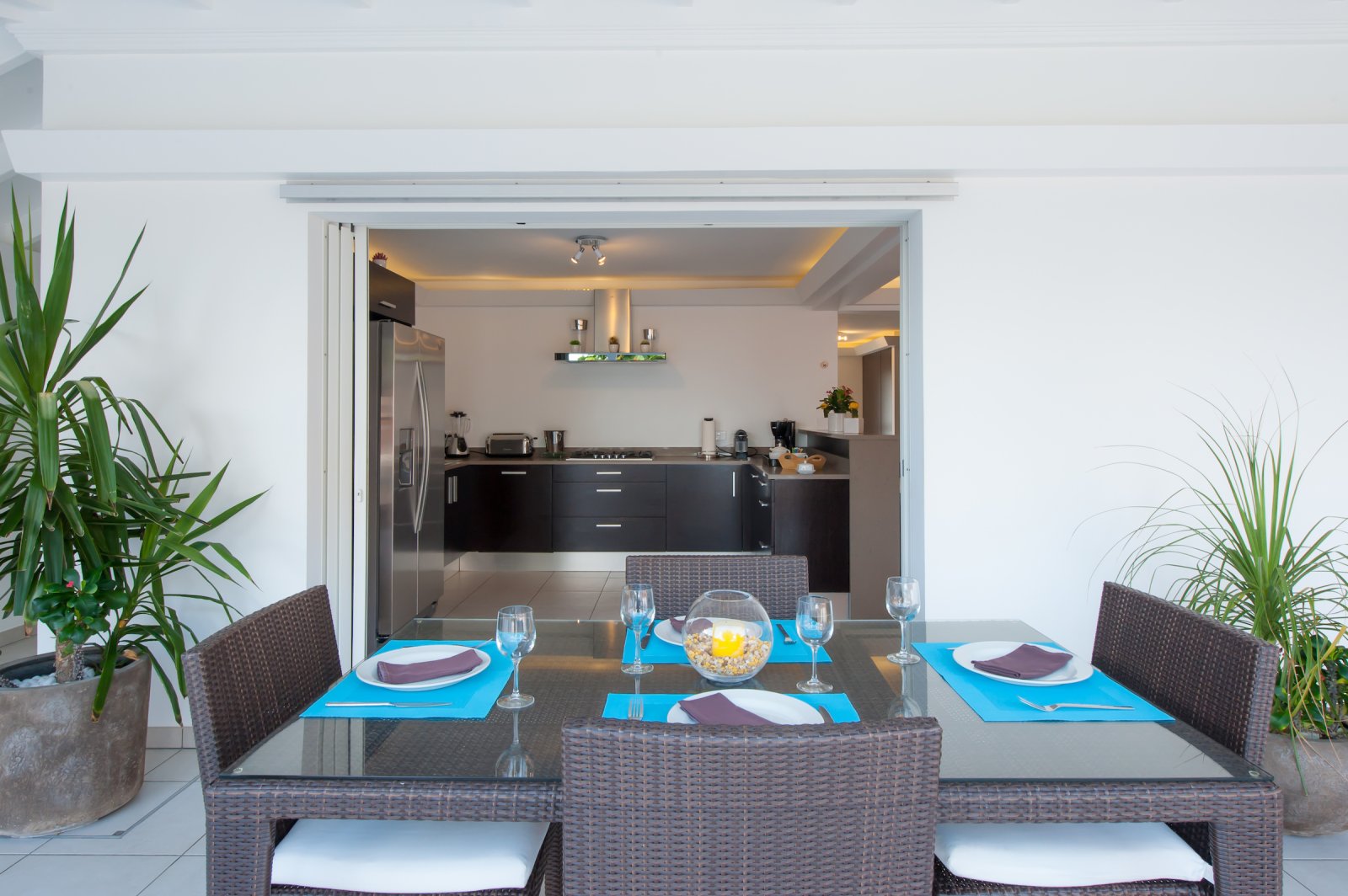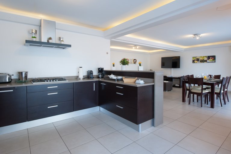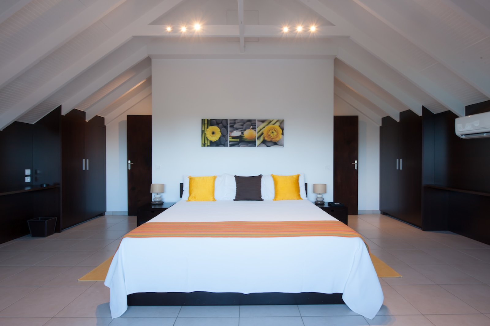 Villa Micela master bedroom and ensuite bathroom are located on the second floor, providing a gorgeous view of the ocean with the islet of Bonhomme in the distance. The second bedroom is on the garden side of the ground floor, with its own ensuite bath and two twin beds the can be converted to a king. The home is decorated throughout in a simple, modern fashion that fits well with the beachfront lifestyle. Dark wood and accents of pale colors create a relaxing atmosphere. The well-equipped kitchen has plentiful counter space and is laid out to make cooking fun and social.