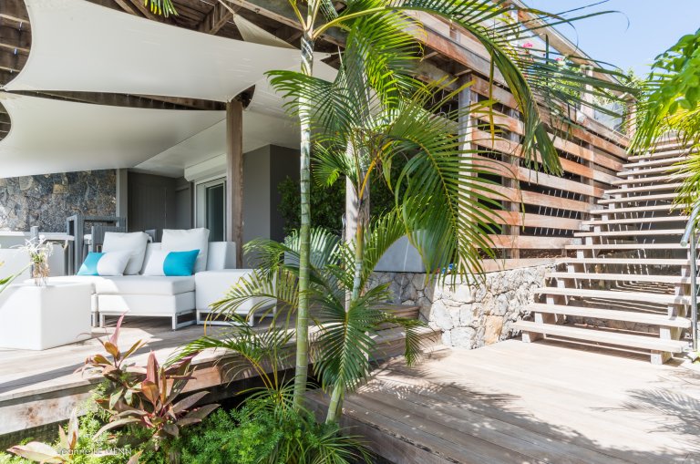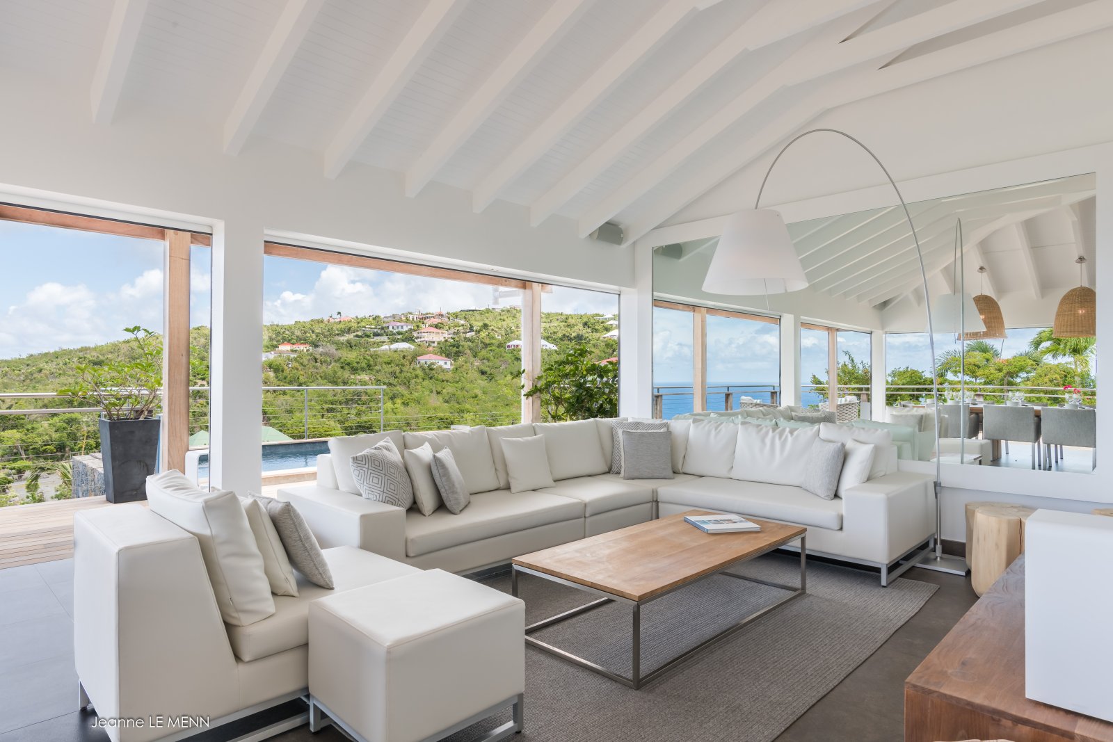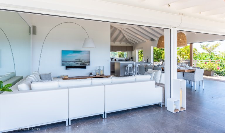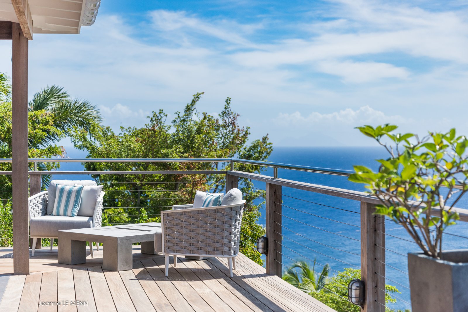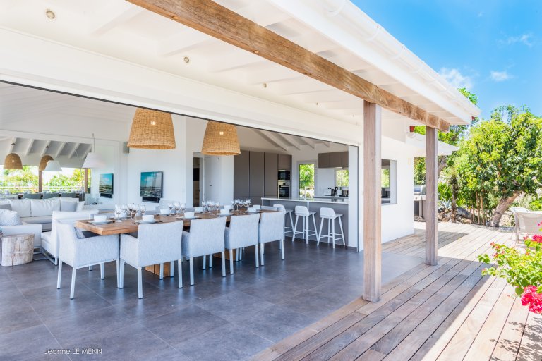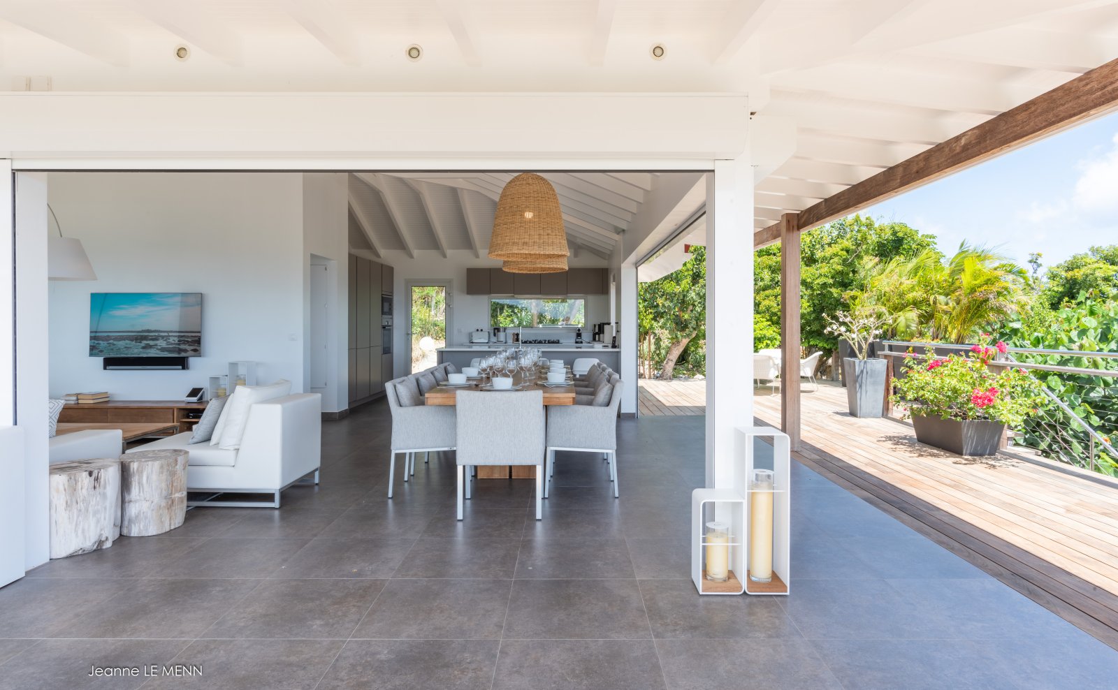 The main level of the vacation home includes a living area and a well-equipped kitchen for guests who like to cook (and for those who prefer to ask the concierge to organize the services of a private chef who specializes in local or French cuisine). Outside, there is an open-air dining table that is cooled by Caribbean breezes.
