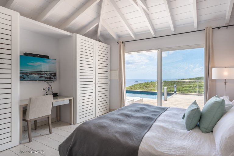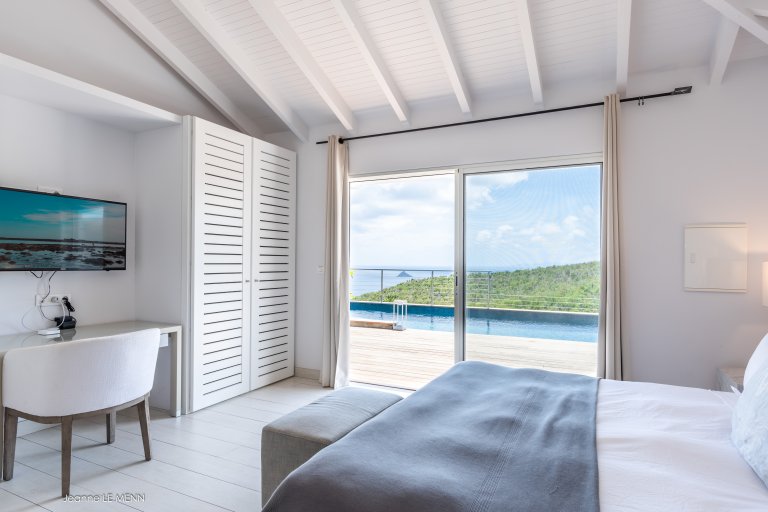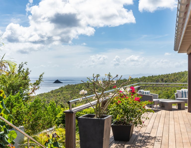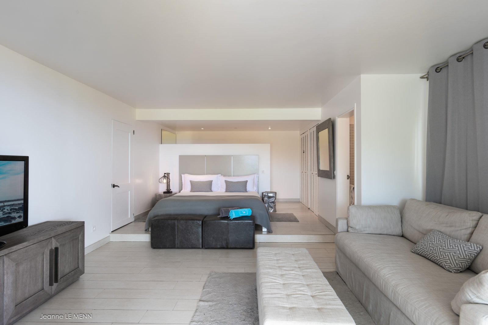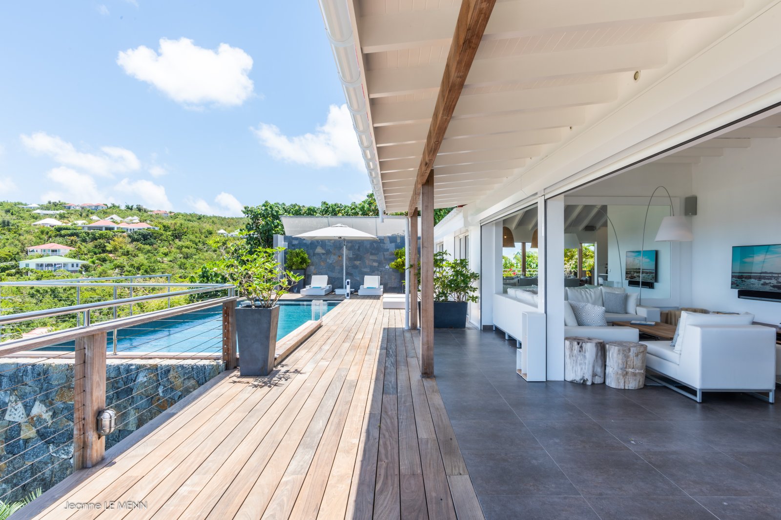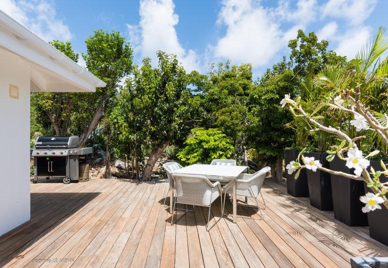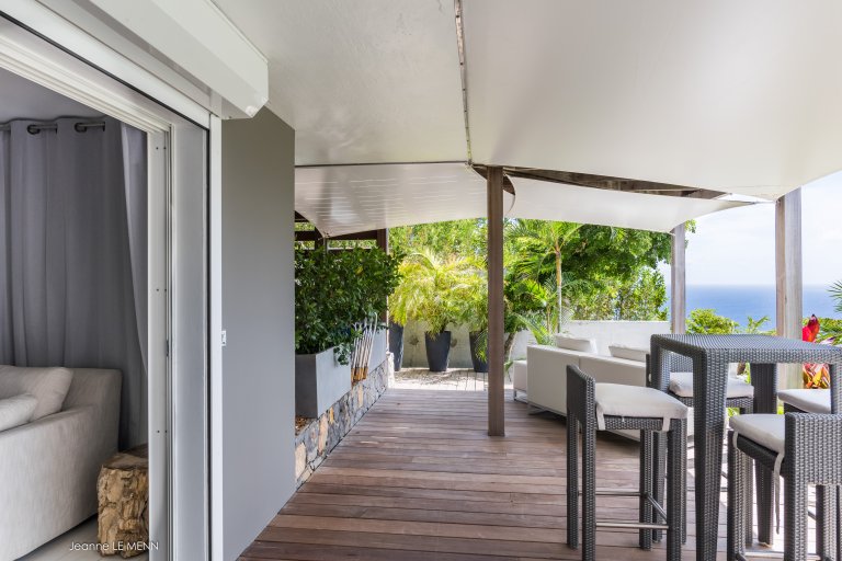 The main level of the vacation home includes a living area and a well-equipped kitchen for guests who like to cook (and for those who prefer to ask the concierge to organize the services of a private chef who specializes in local or French cuisine). Outside, there is an open-air dining table that is cooled by Caribbean breezes.