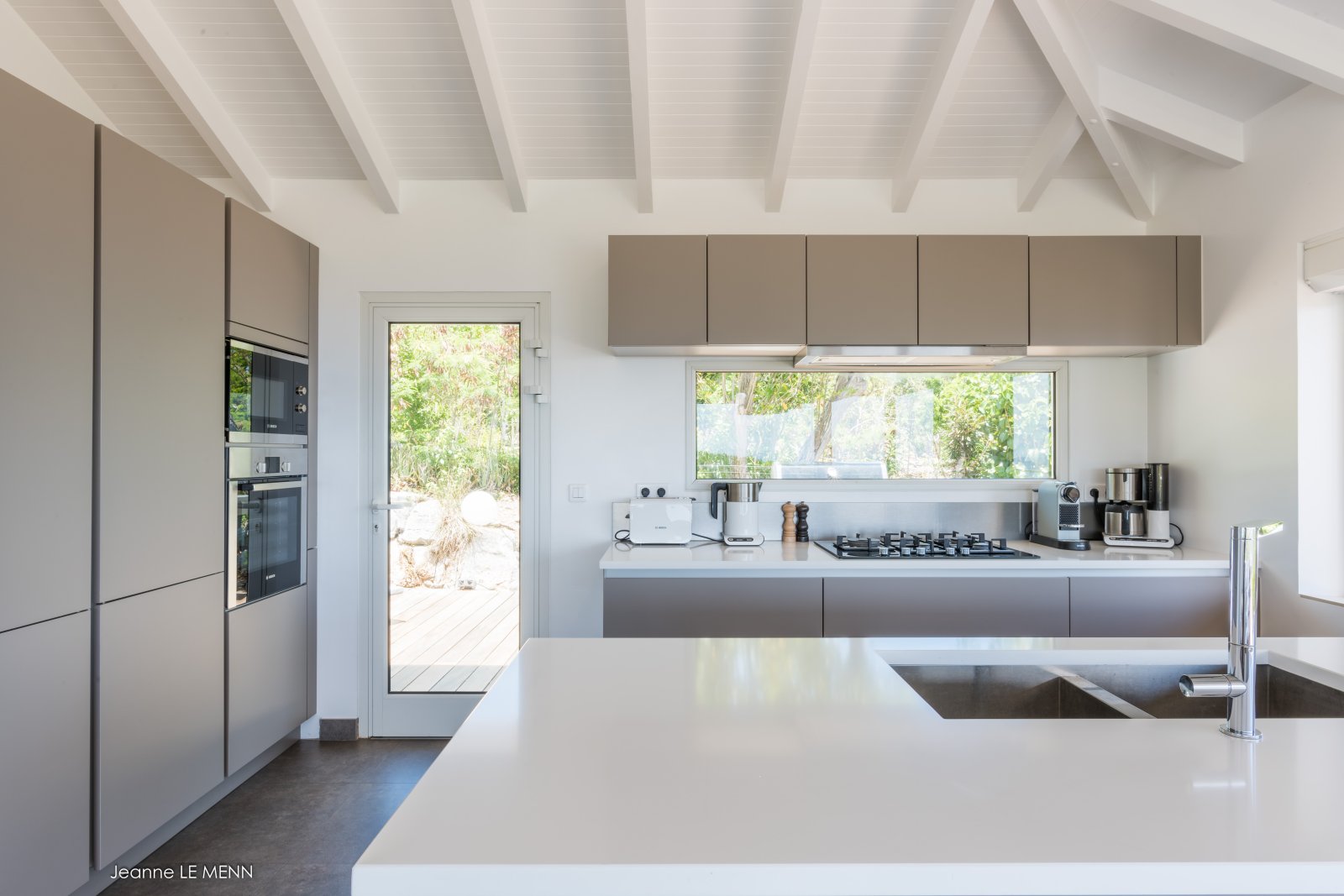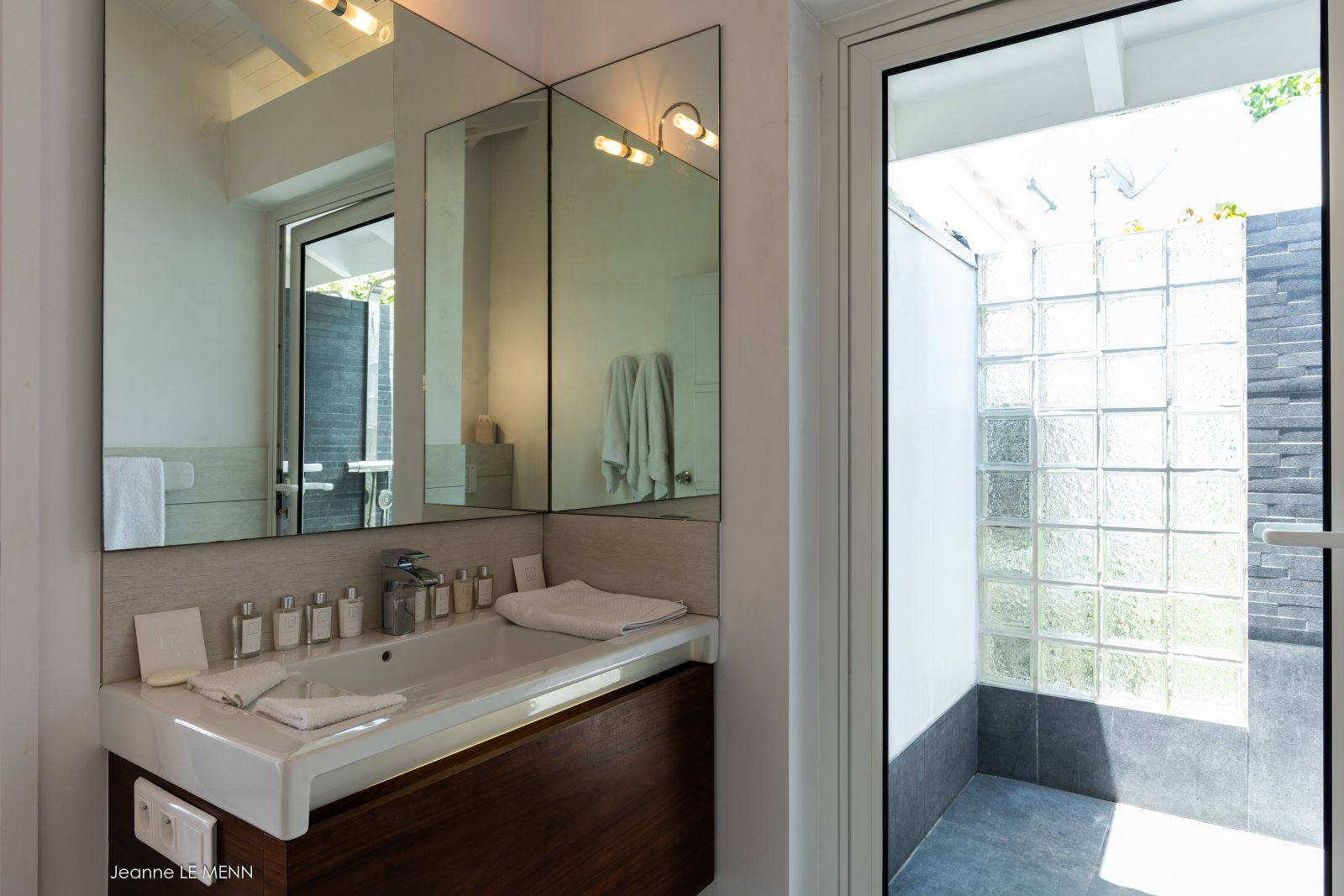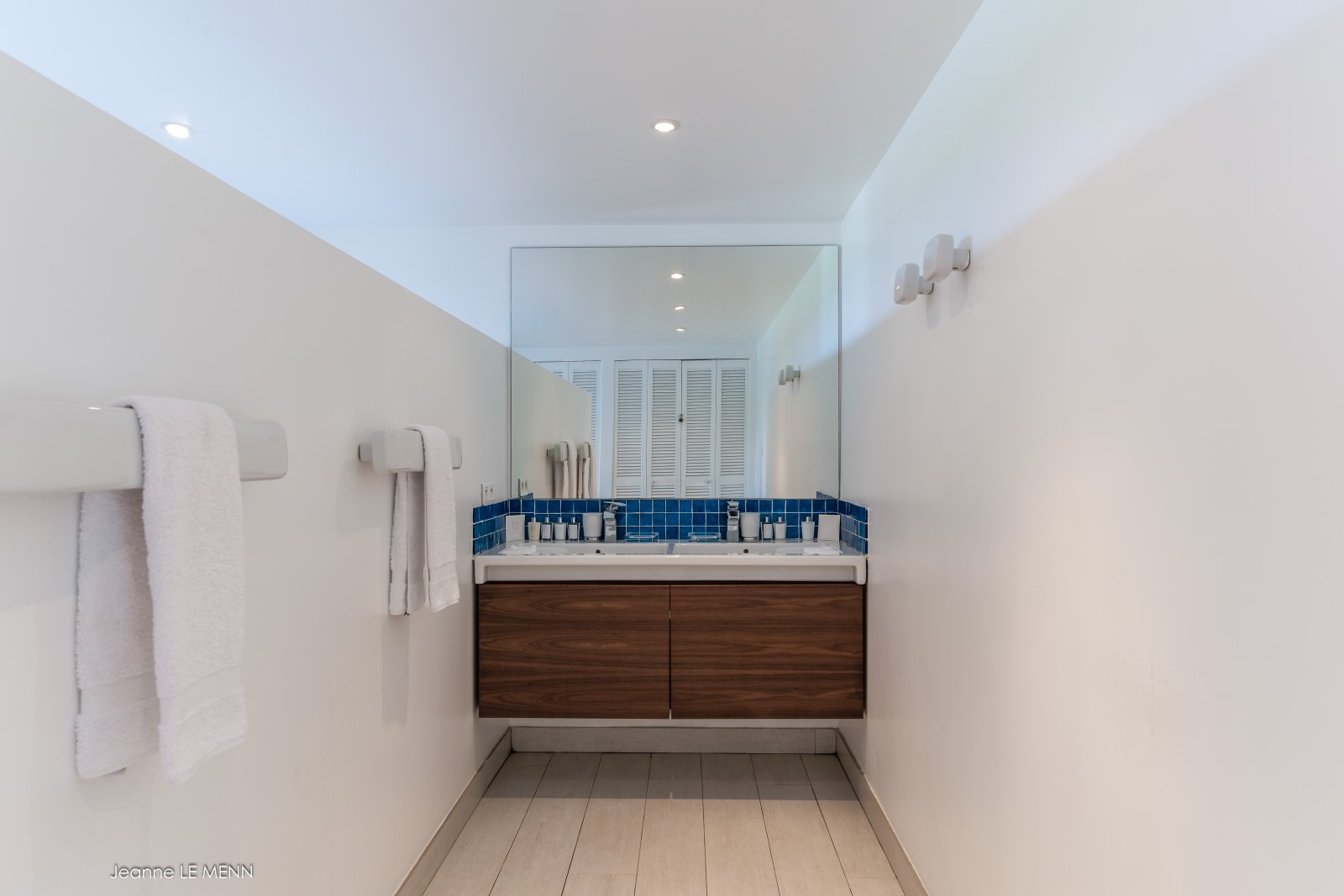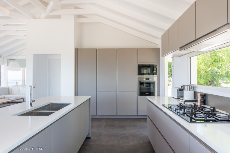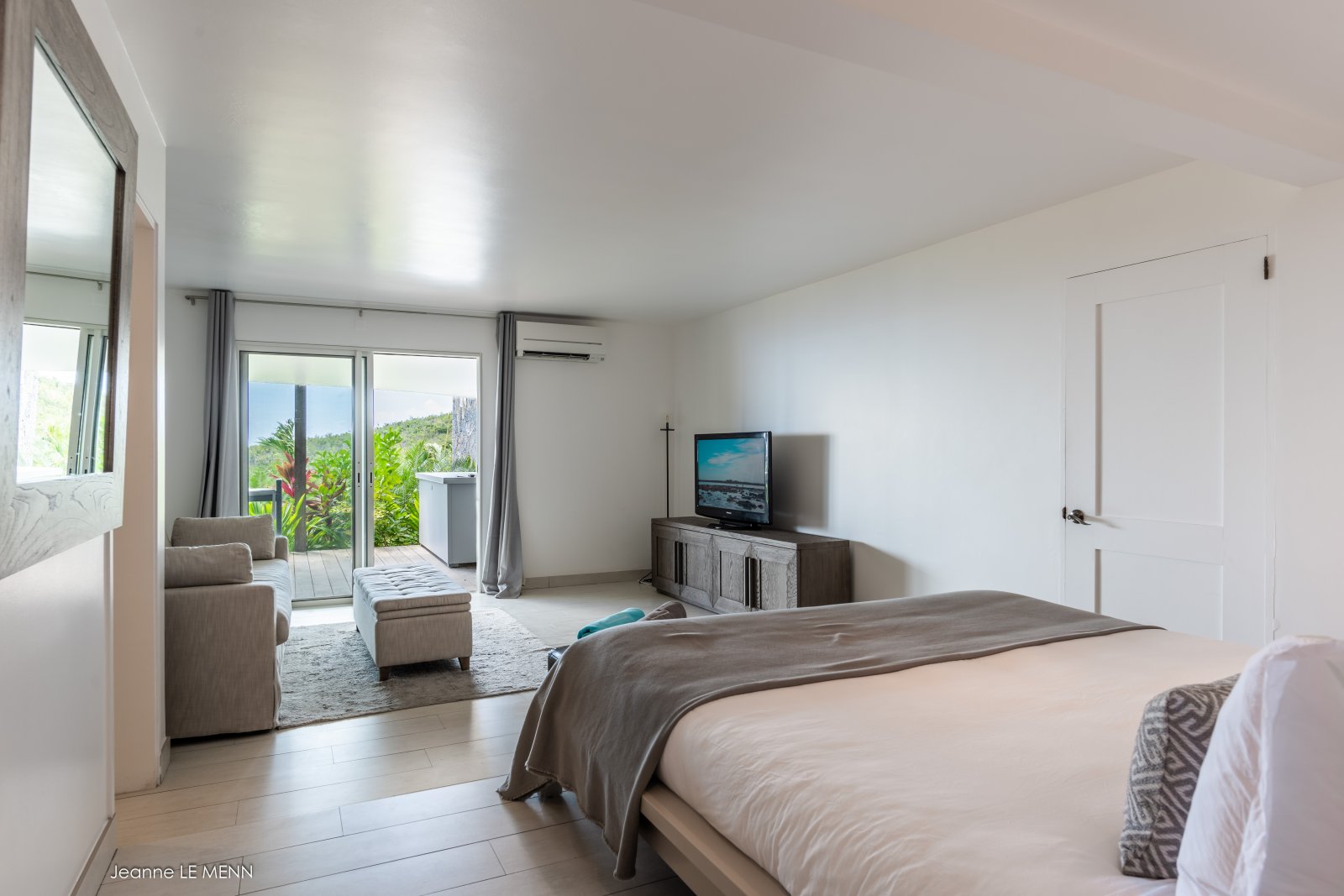 The main level of the vacation home includes a living area and a well-equipped kitchen for guests who like to cook (and for those who prefer to ask the concierge to organize the services of a private chef who specializes in local or French cuisine). Outside, there is an open-air dining table that is cooled by Caribbean breezes.