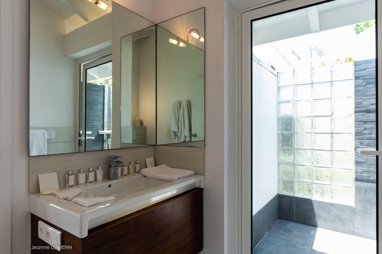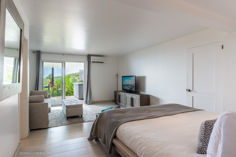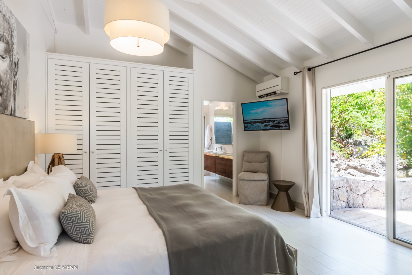 Bed: King Bed • En-Suite Bath with Outdoor Shower • Air Conditioning • Flat-Screen TV • Safe • Direct Access to Terrace and Pool • Desk
