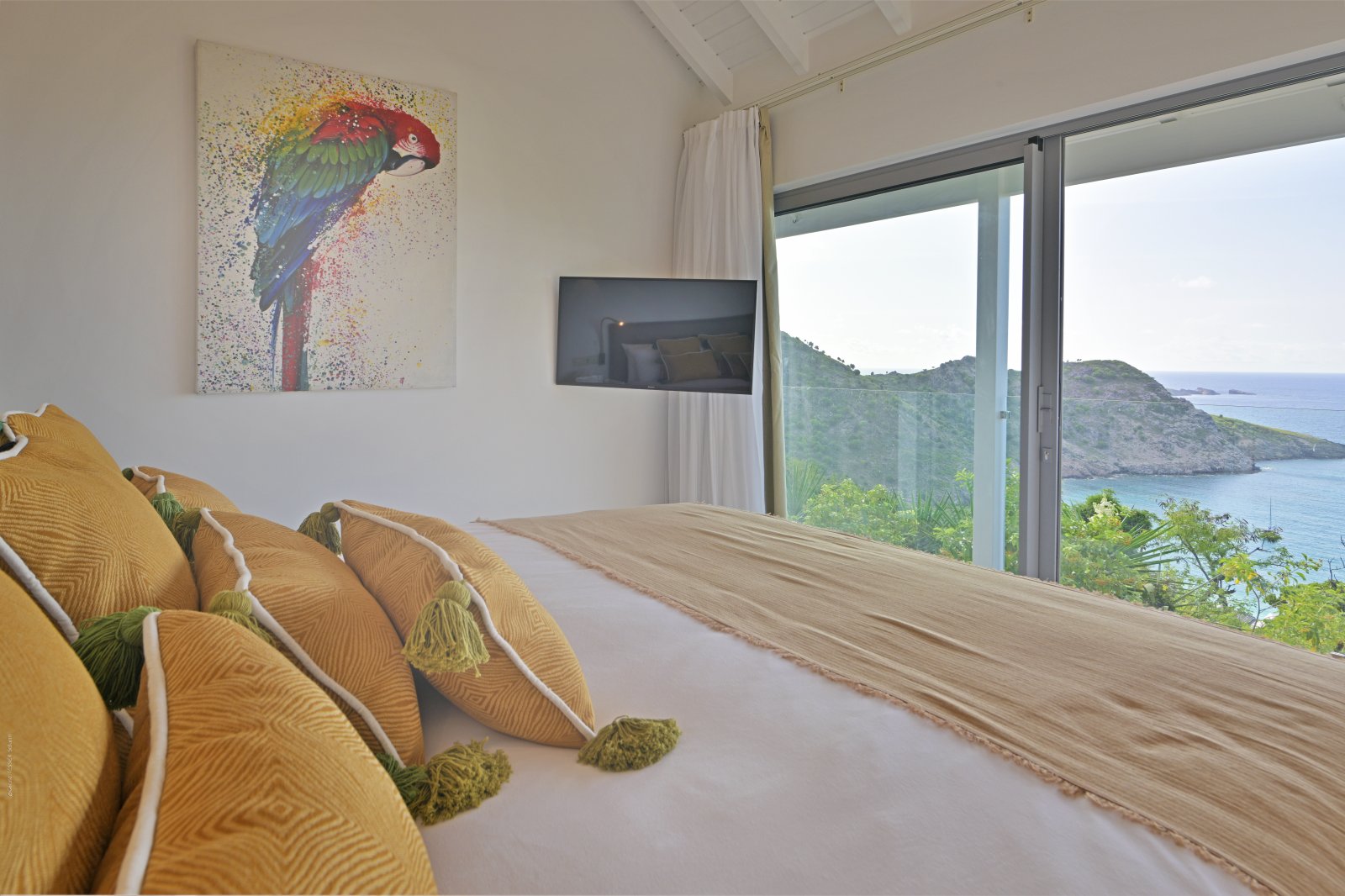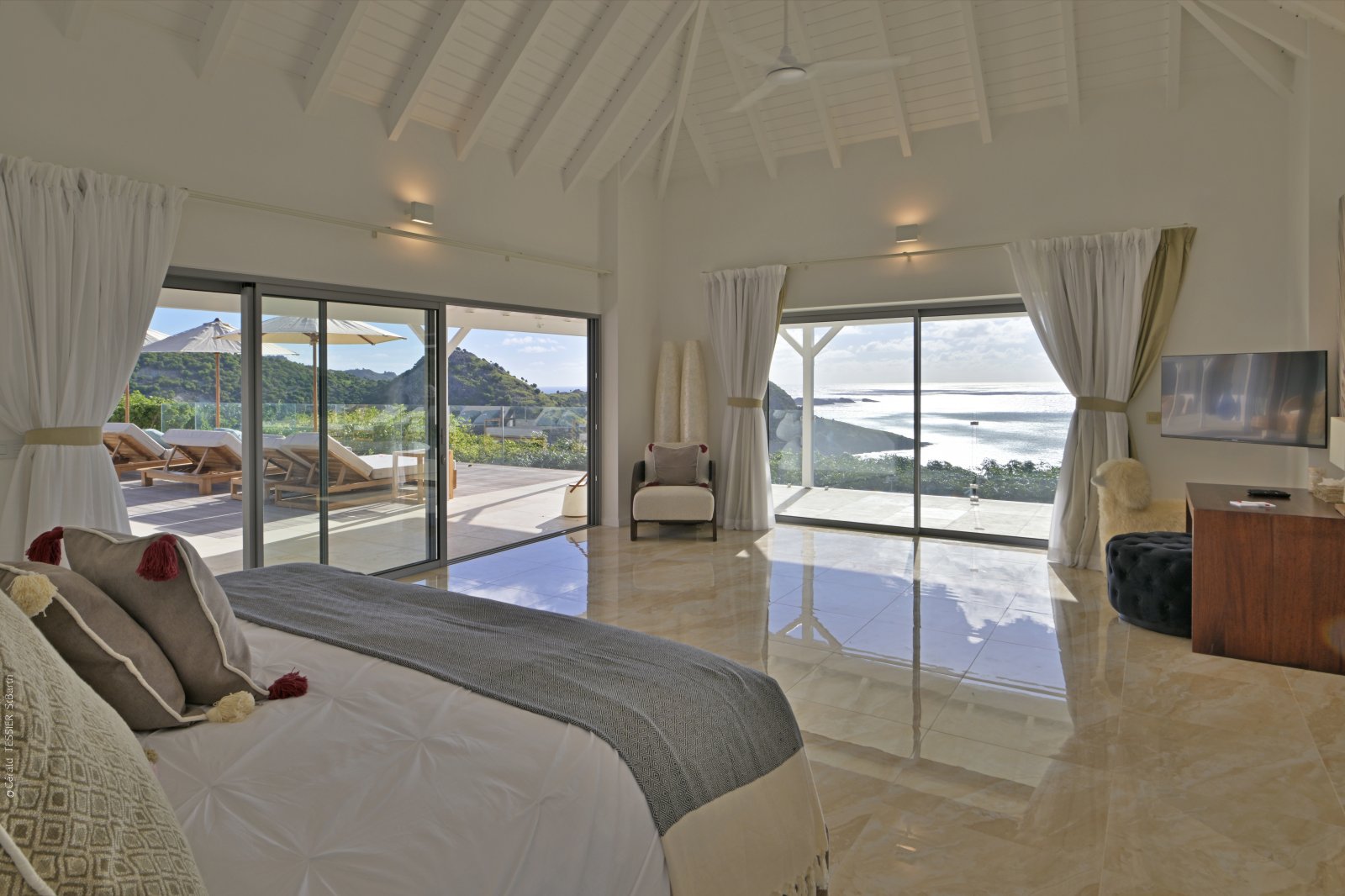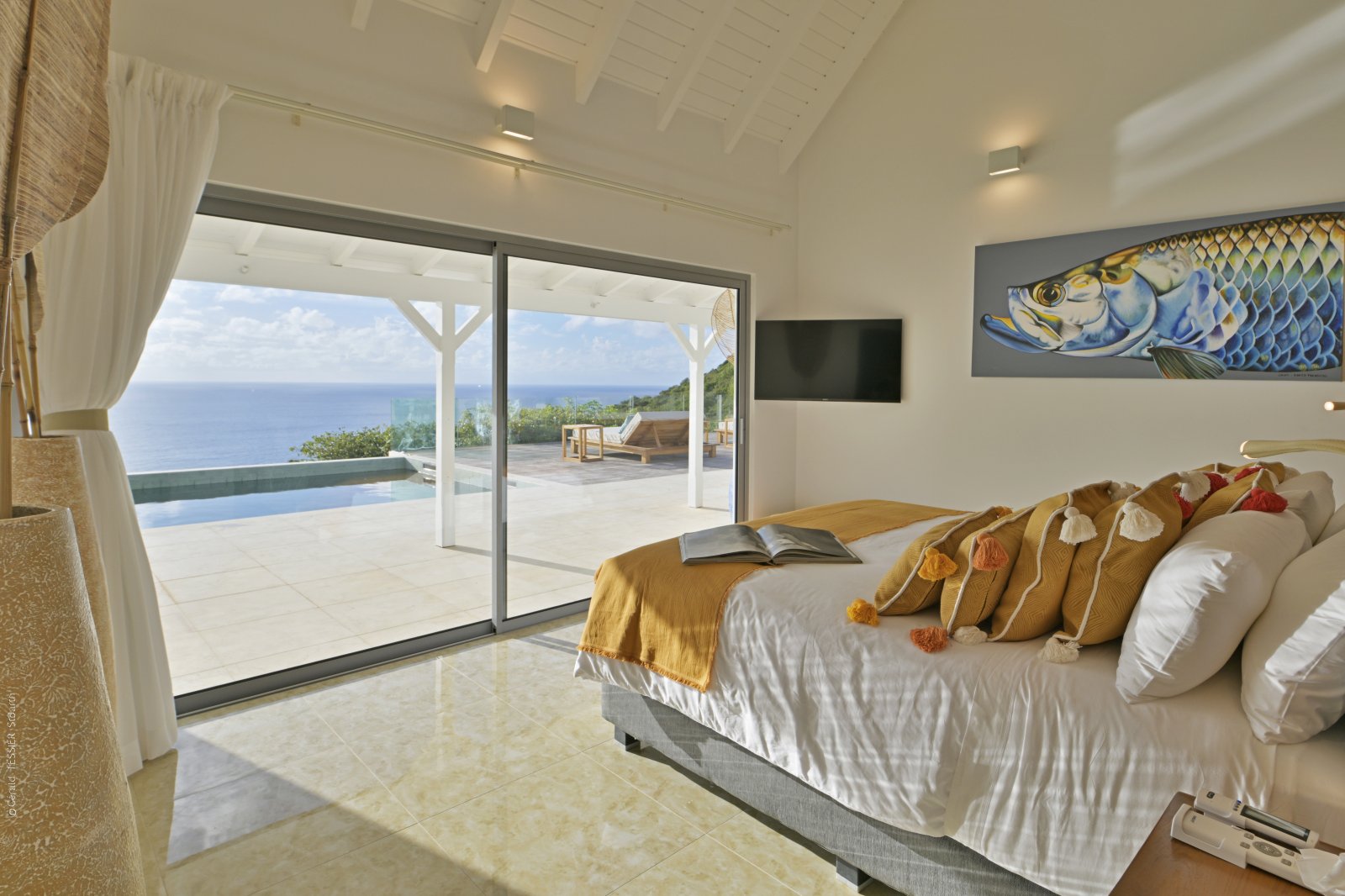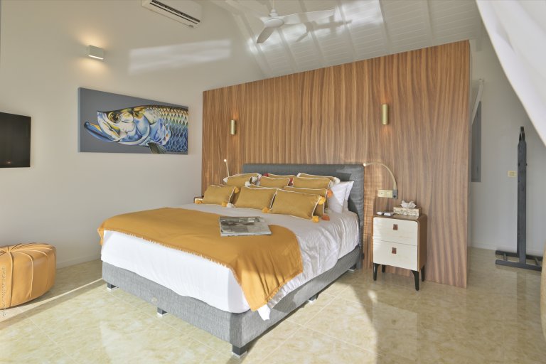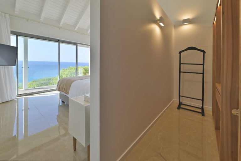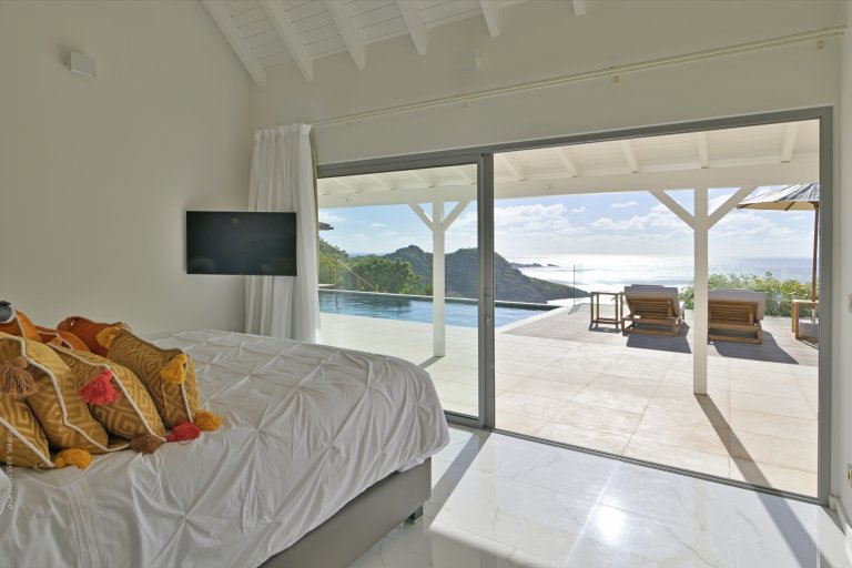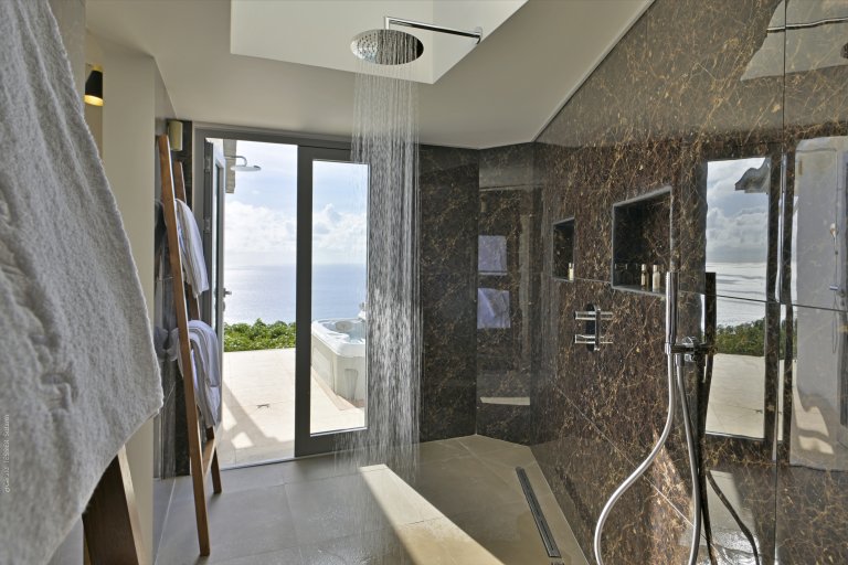 Three of the bedrooms are in the main house, arrayed around the pool. The fourth bedroom is in its own bungalow a few steps to one side. The primary bedroom is quite large and has a private terrace with a jacuzzi. The three remaining bedrooms are equal in size, and all four have sea views, ensuite bathrooms, dressing areas, and televisions.