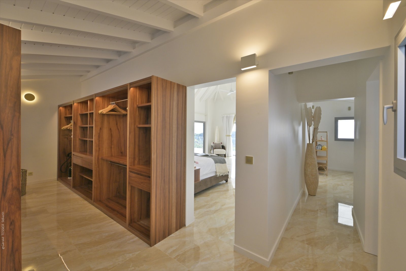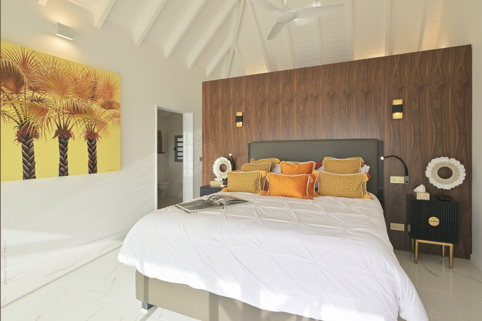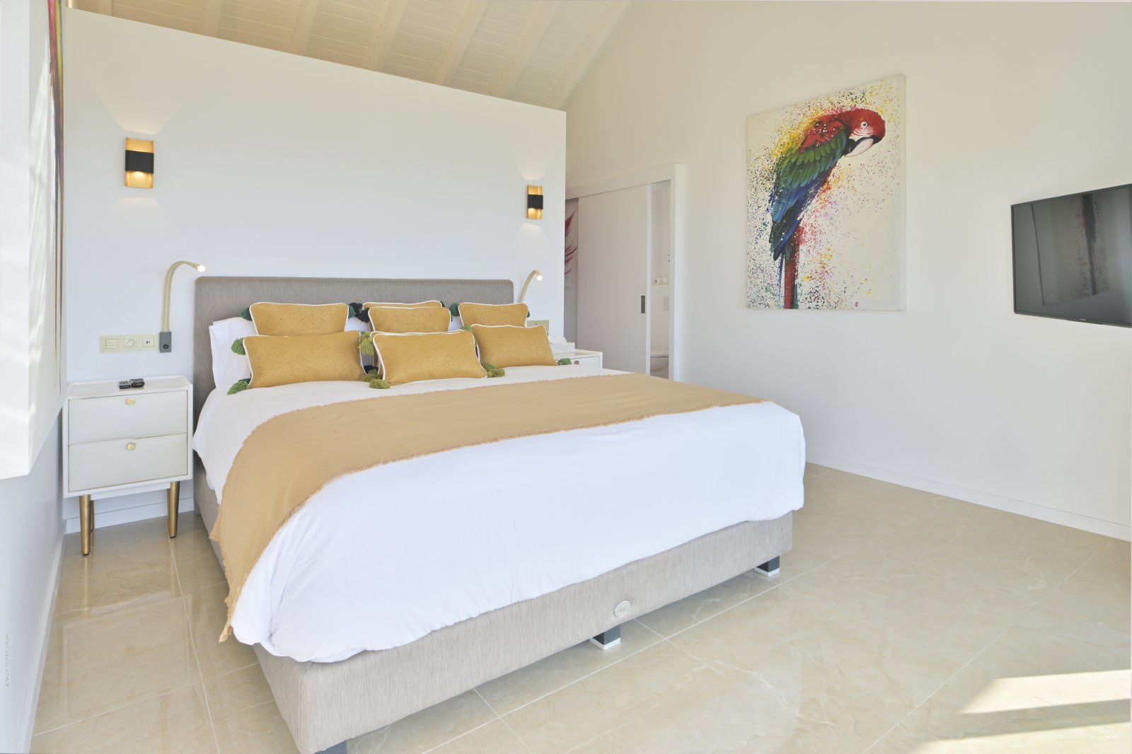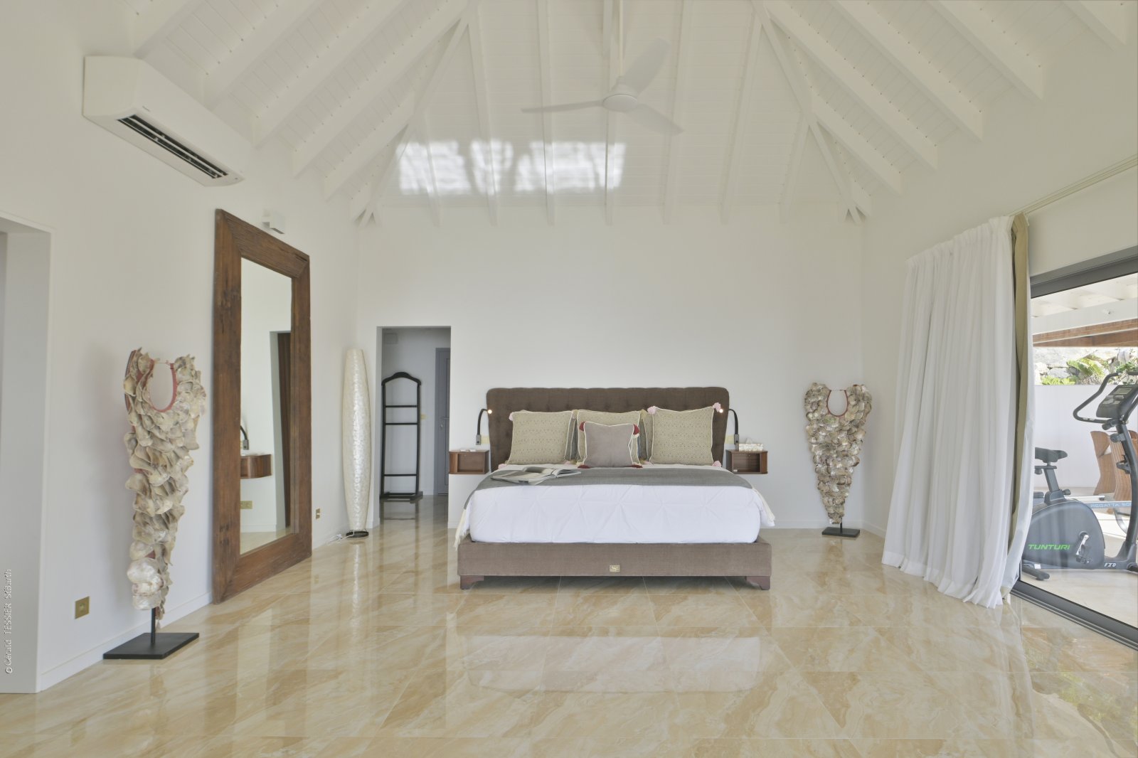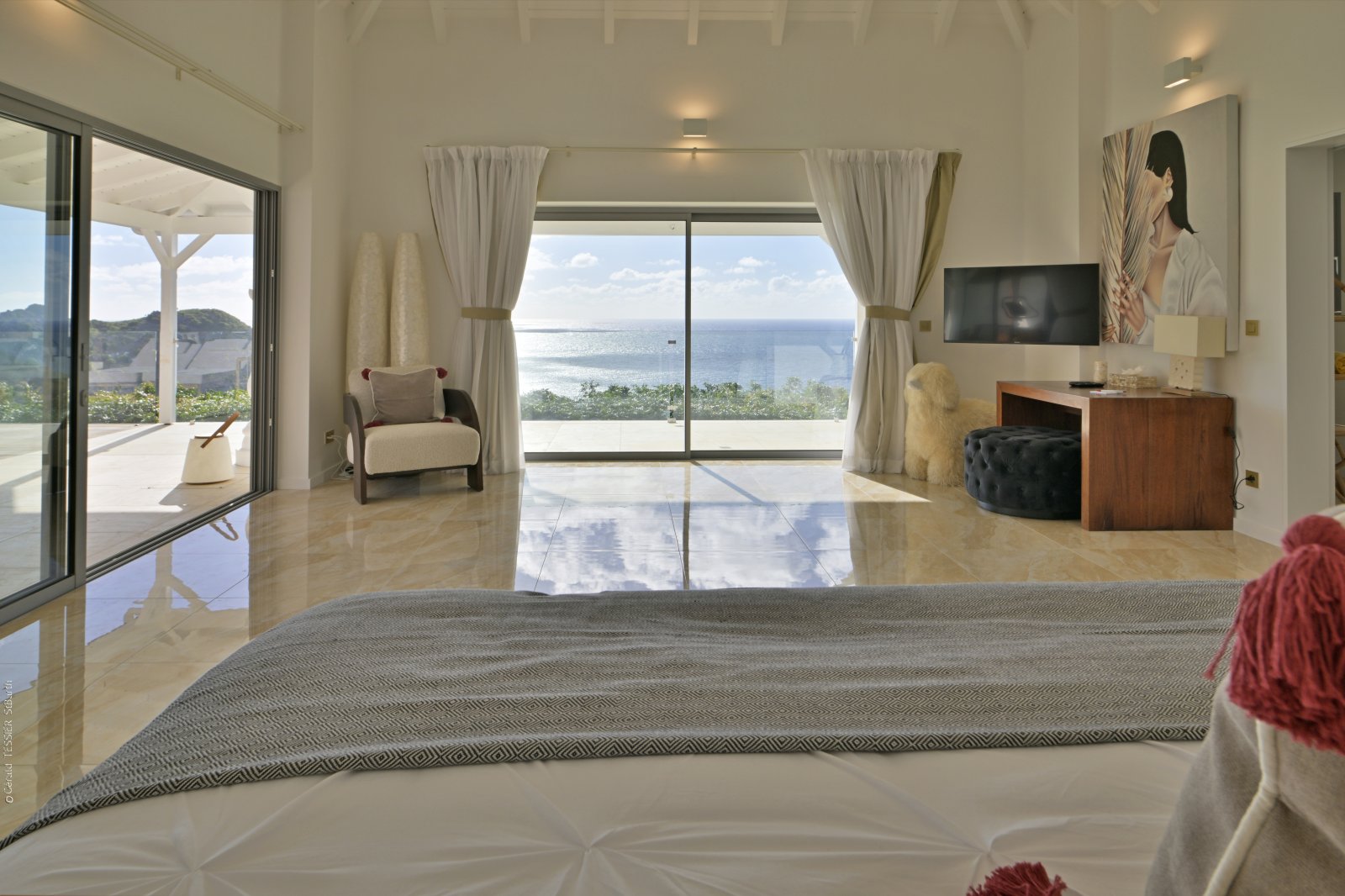 Three of the bedrooms are in the main house, arrayed around the pool. The fourth bedroom is in its own bungalow a few steps to one side. The primary bedroom is quite large and has a private terrace with a jacuzzi. The three remaining bedrooms are equal in size, and all four have sea views, ensuite bathrooms, dressing areas, and televisions.