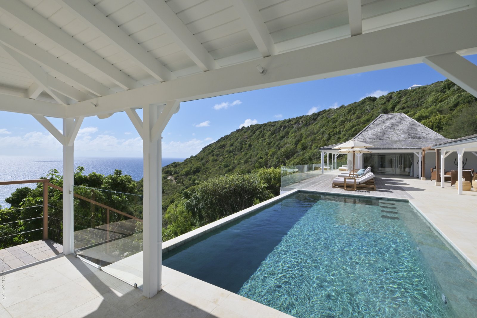 Inside, the villa is fully air-conditioned. At the same time, the outdoor spaces are a breezy extension of the living areas. There is a covered sitting area with the dining table, and the pool and terrace are warmed by the sun. The lounge chairs around the pool are a pleasant perch for enjoying the views.
