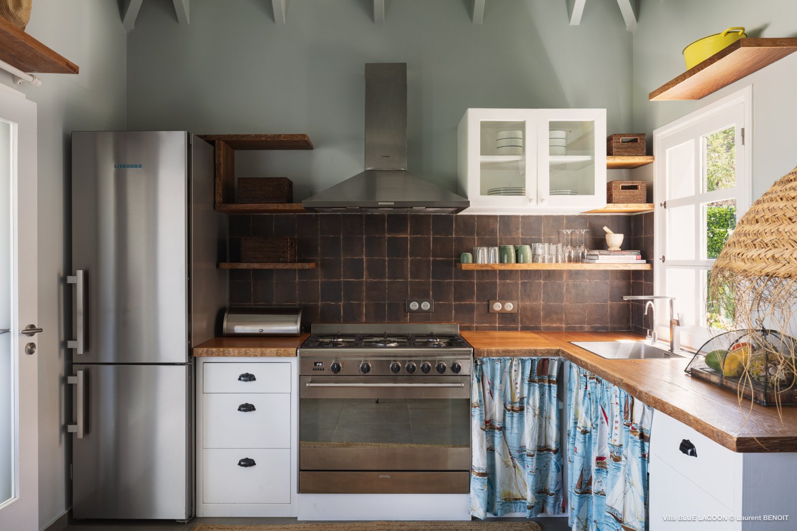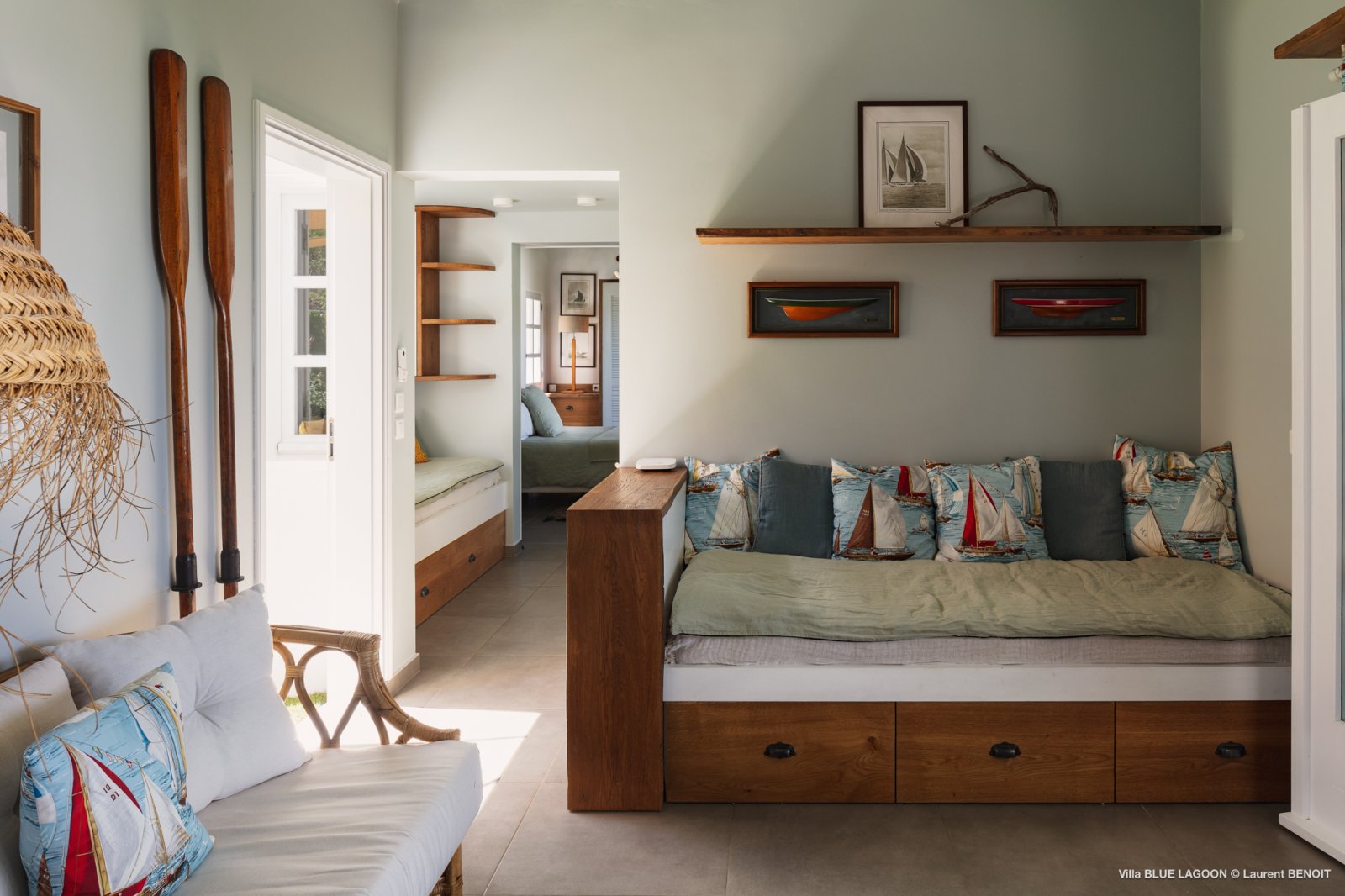 The open-plan living area includes a well-equipped kitchen and extends to a covered terrace with views over the turquoise water. Tasteful furnishings and thoughtful accents create a space that feels warm and effortless – a blend of island simplicity and subtle sophistication.