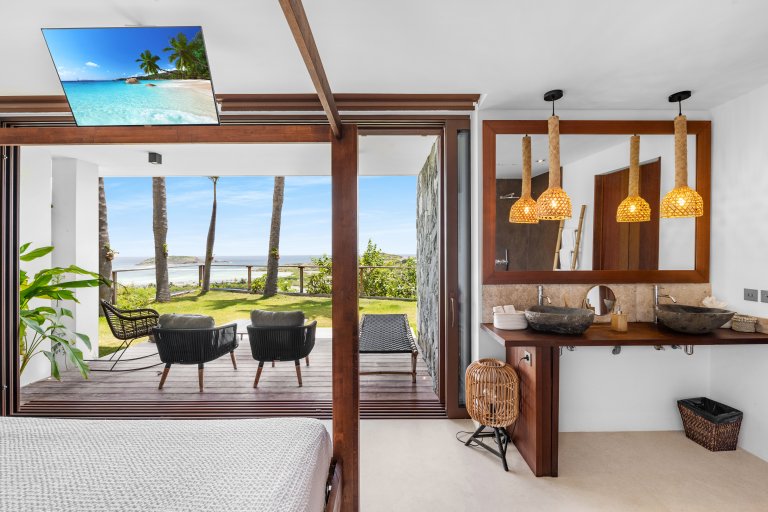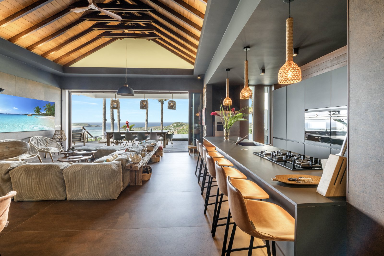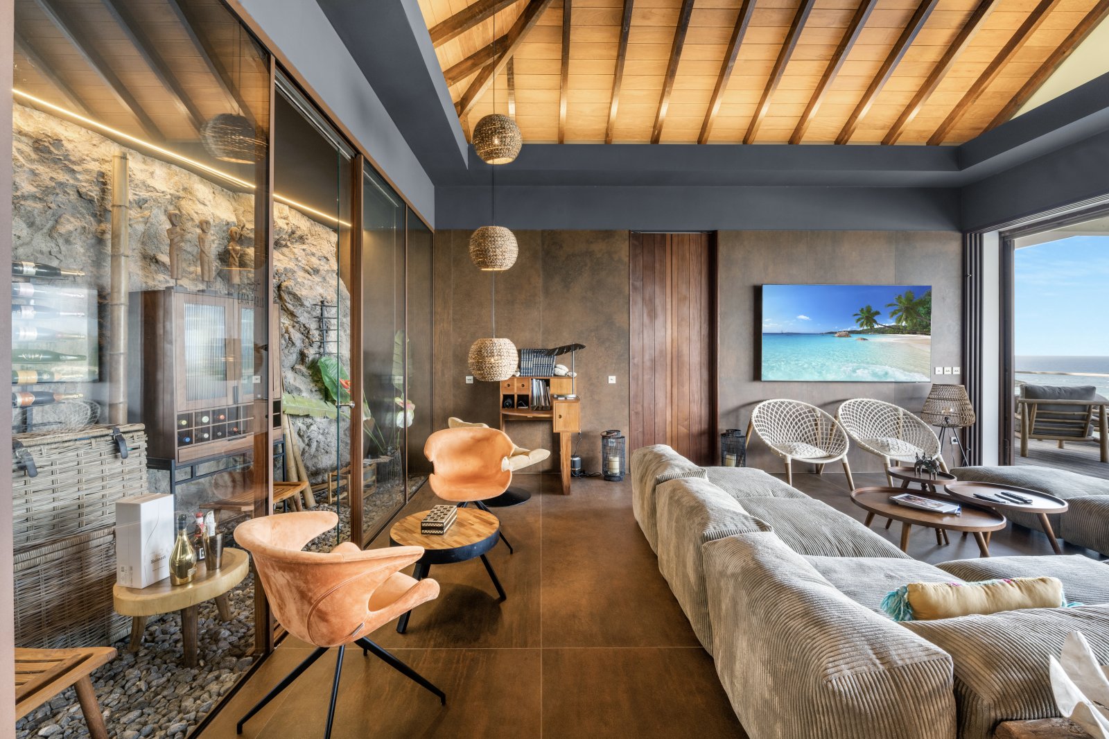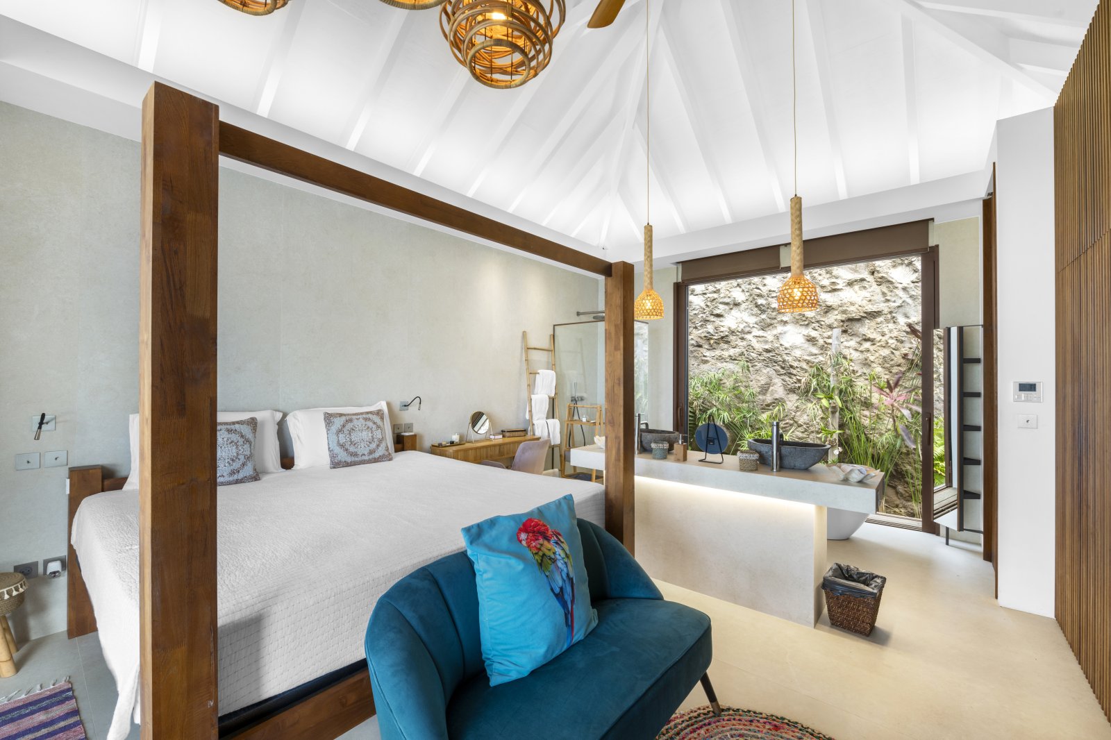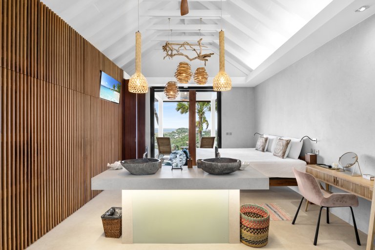 The newly built Casa Pablo (PBL) feels as if it’s integrated with nature - both with the bay of Grand Cul de Sac, which is stretched out beneath the swimming pool in front, and with the natural rock wall that rises up behind the house and is incorporated into the architecture and interior design of some of the bedrooms and the living room. Throughout, the luxury rental property is defined by its extensive and skillful use of wood and other natural materials, as well as some thoughtful art pieces.