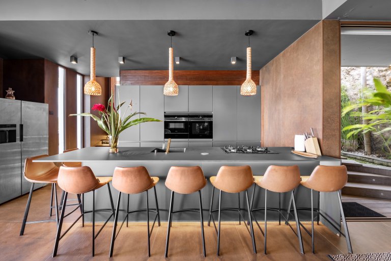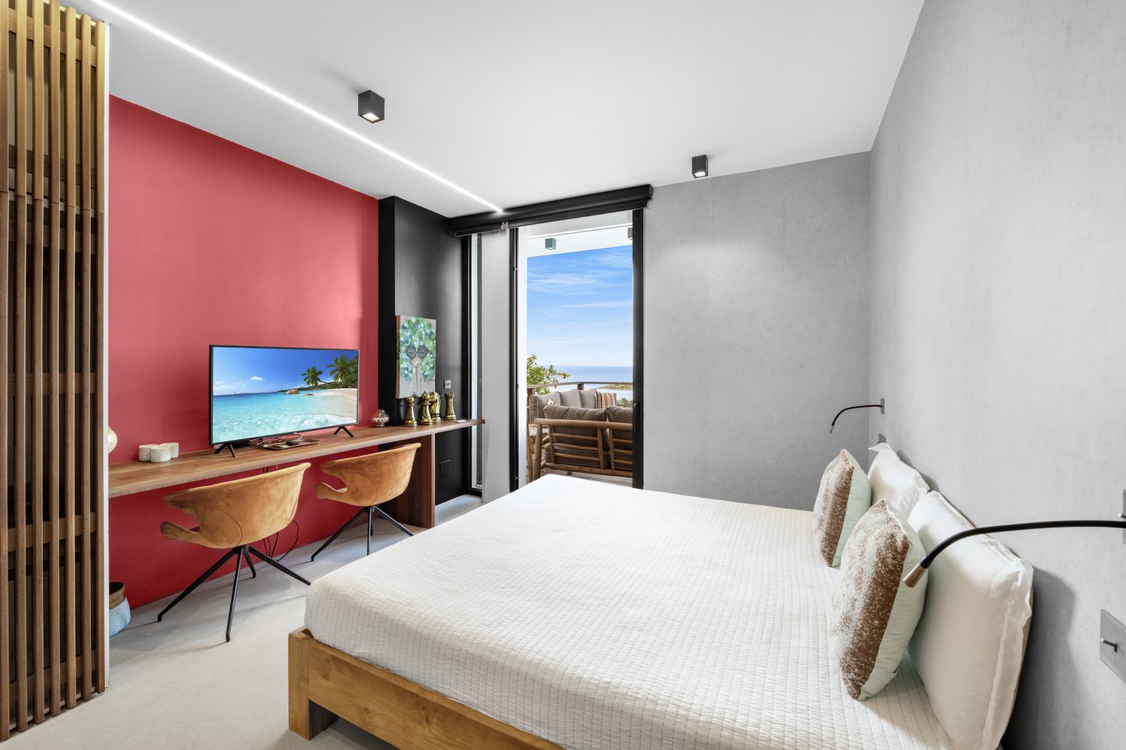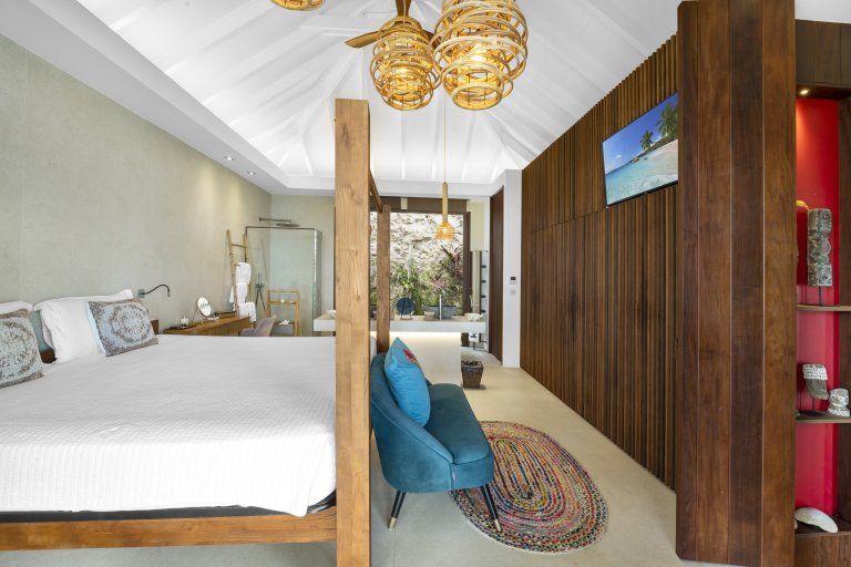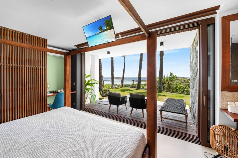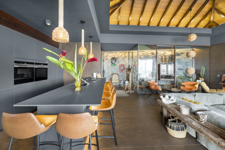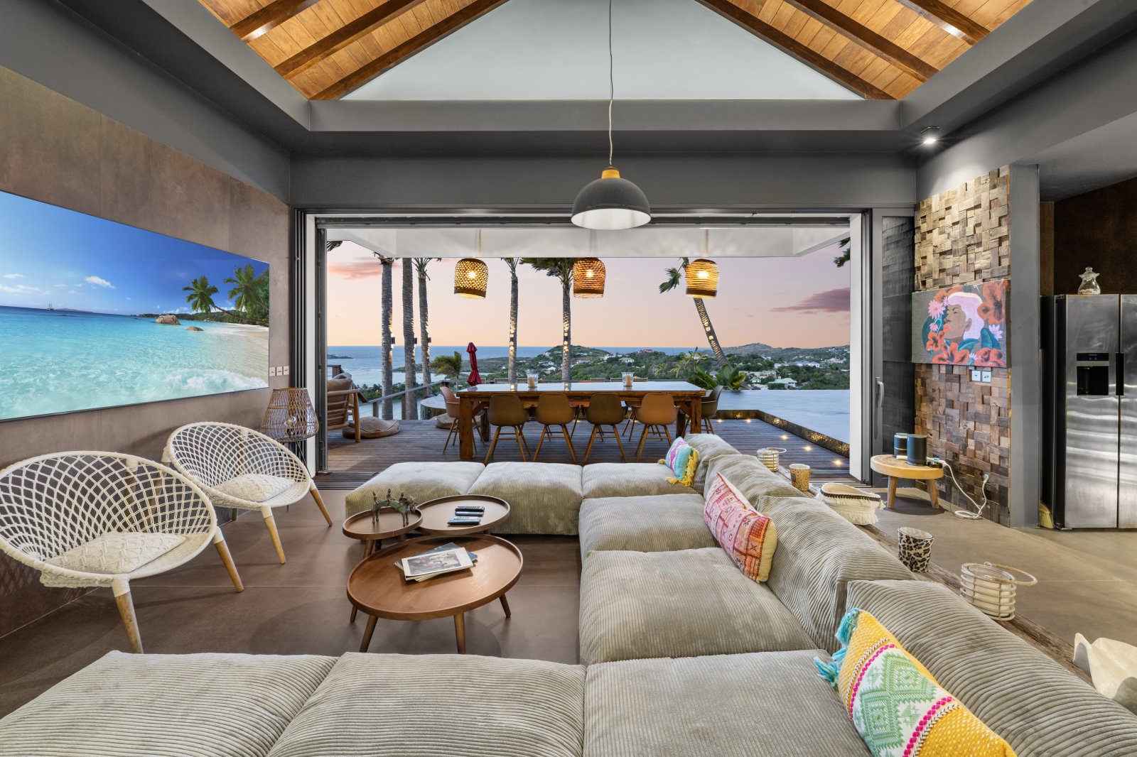 The newly built Casa Pablo (PBL) feels as if it’s integrated with nature - both with the bay of Grand Cul de Sac, which is stretched out beneath the swimming pool in front, and with the natural rock wall that rises up behind the house and is incorporated into the architecture and interior design of some of the bedrooms and the living room. Throughout, the luxury rental property is defined by its extensive and skillful use of wood and other natural materials, as well as some thoughtful art pieces.