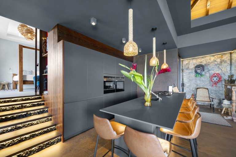 The living room is cozy, with a large smart TV with satellite channels. Nearby, the fully equipped kitchen is nicely tucked away and discreet. When you book Casa Pablo, you can enjoy meals around the kitchen island indoors, or outdoors on the covered terrace. (And if you want something extra special, the Sibarth concierge can arrange for a private chef to cook a gourmet meal, or for a sommelier to lead a wine tasting.)