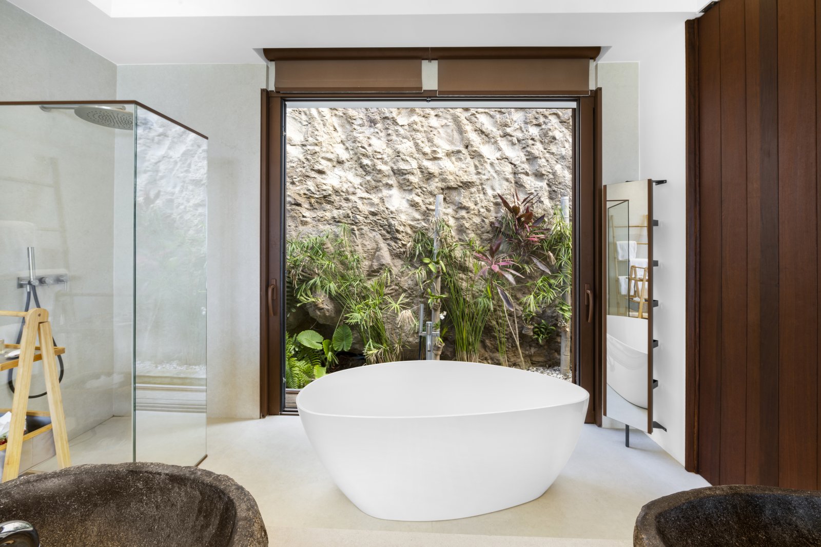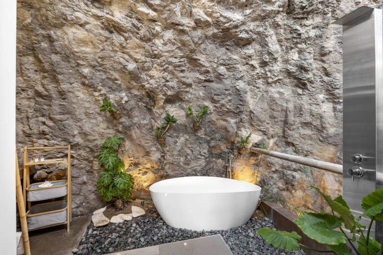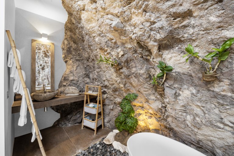 Two of the four bedrooms are on the same level as the common areas, one on each side of the living area. Each has an ensuite bathroom. One of them has a bathtub, and the other has an outdoor shower and bathtub integrated into the stone. The remaining two bedrooms are located one level below and are accessible from the parking area. These bedrooms share a bathroom.