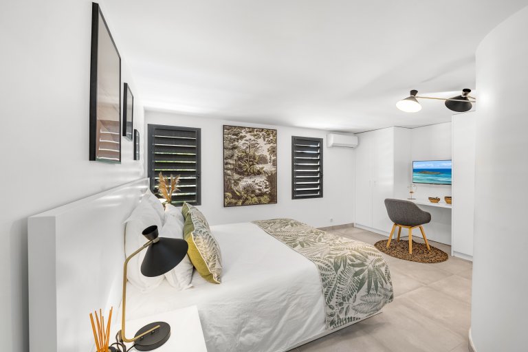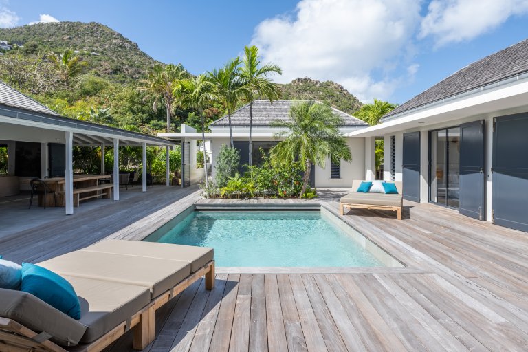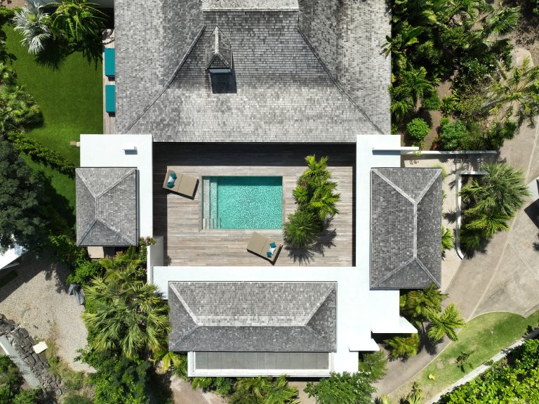 An inviting pool is the physical and emotional heart of the newly built Villa Crush (CRH). The centerpiece of the luxury rental property is a swimming pool that may not be all that large (eight meters long and four meters wide) but is undeniably appealing. Built around it is a cocoon of four elegantly appointed rooms, as well as plenty of outdoor space for lounging and entertaining.