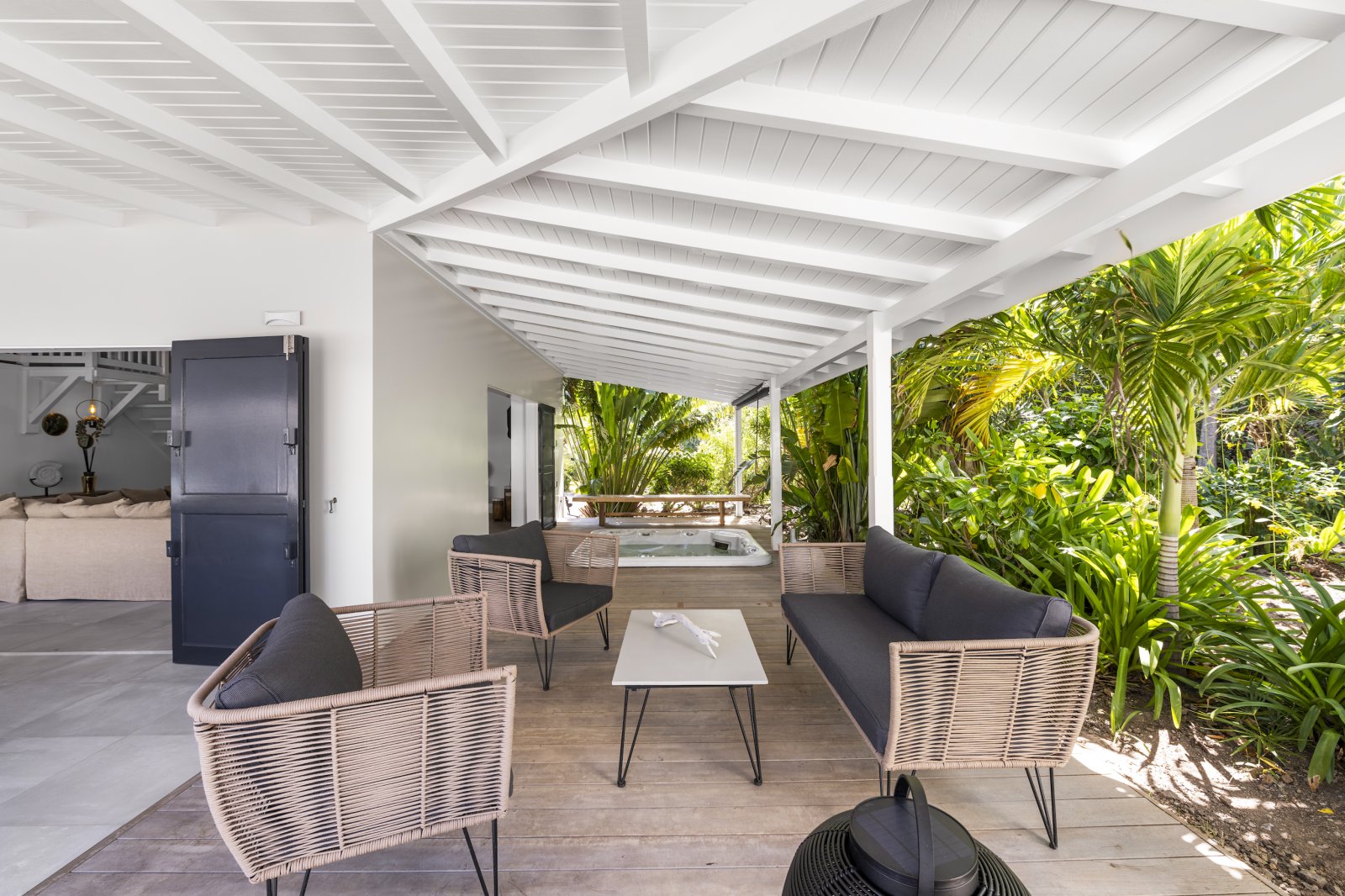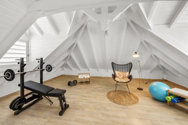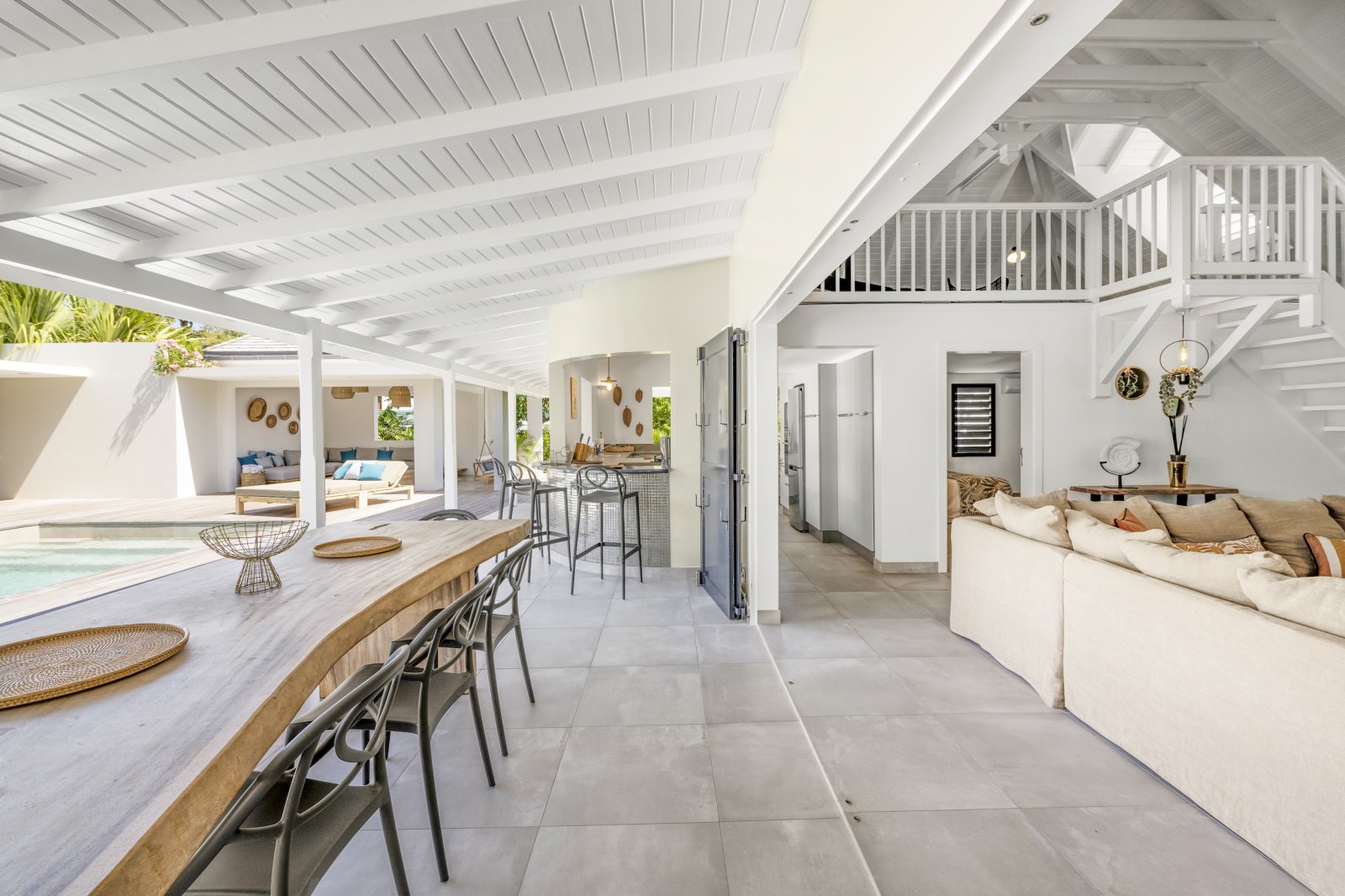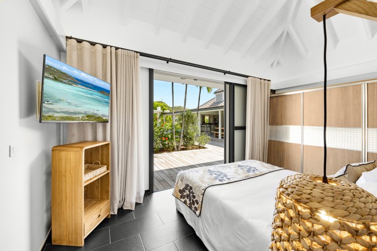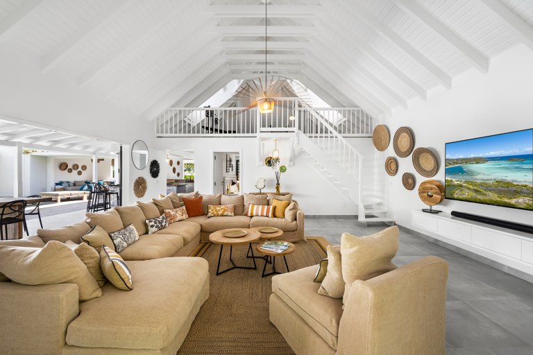 Overall, the feeling in Villa Crush is comfortable and easy living. It is a stylish cocoon in which life unfolds mostly outside. There is a living area with a Smart 4K television that is under a roof, but even that space is easily opened up to let the Caribbean breezes in. A mezzanine has a few exercise machines and is ideal for yoga, working out, or stretching. The large, convenient kitchen also opens to the outside and has an outdoor bar.