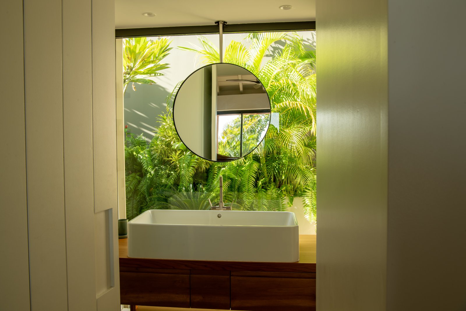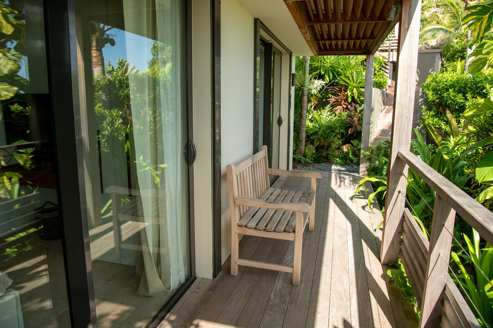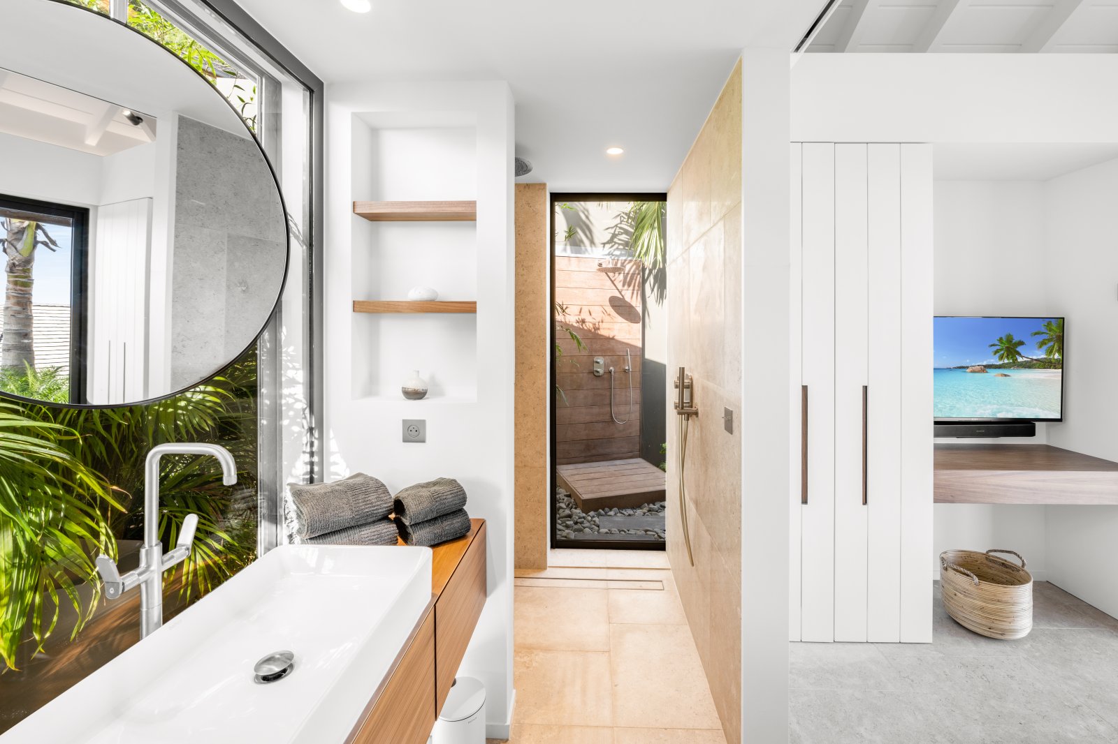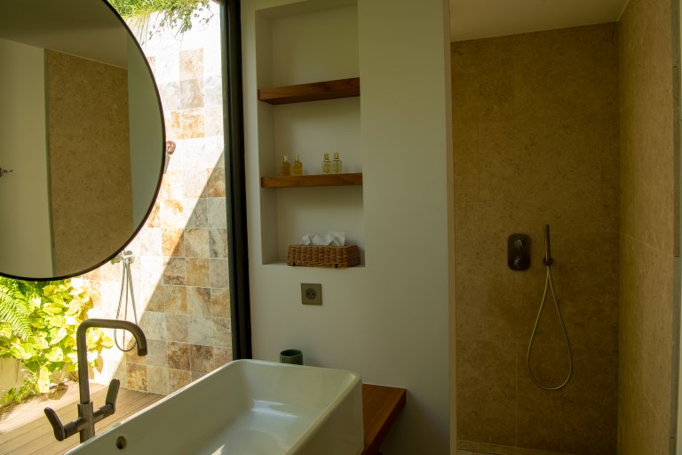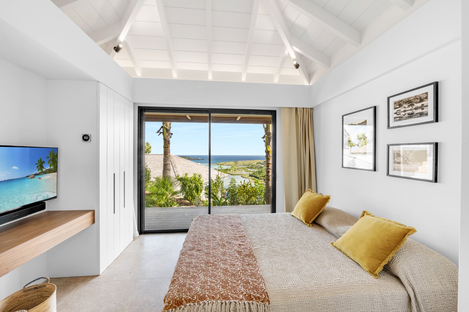 All three bedrooms are air-conditioned and have ensuite bathrooms, outdoor showers, and TVs. The upstairs bedroom has a European king-size bed, while the two remaining bedrooms have queen beds. All three have good natural light and luminosity.