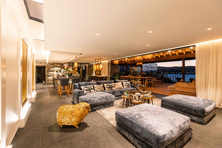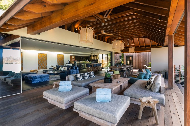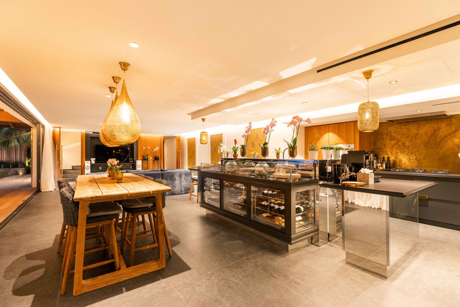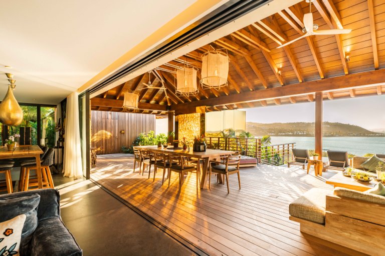The main living space combines the kitchen, an indoor dining table, and a comfortable TV corner, all within a space that can be air-conditioned or opened wide to the breeze. The kitchen is centered around a large island with breakfast bar and includes a wine fridge, making it both stylish and practical. Seamlessly connected in front, a covered outdoor dining area and lounge extend the flow, creating a natural transition between interior comfort and open-air living.
