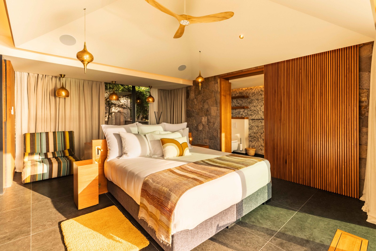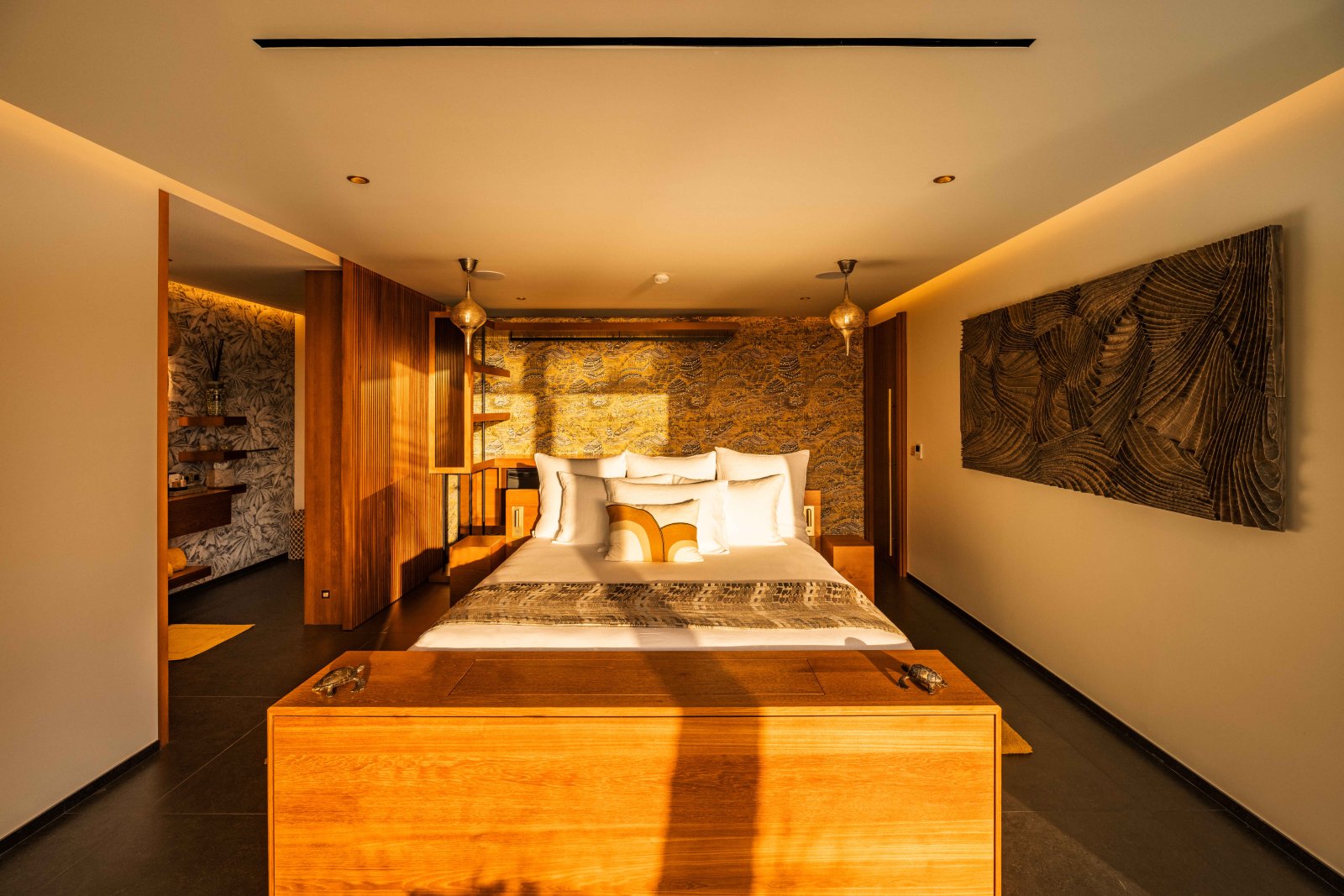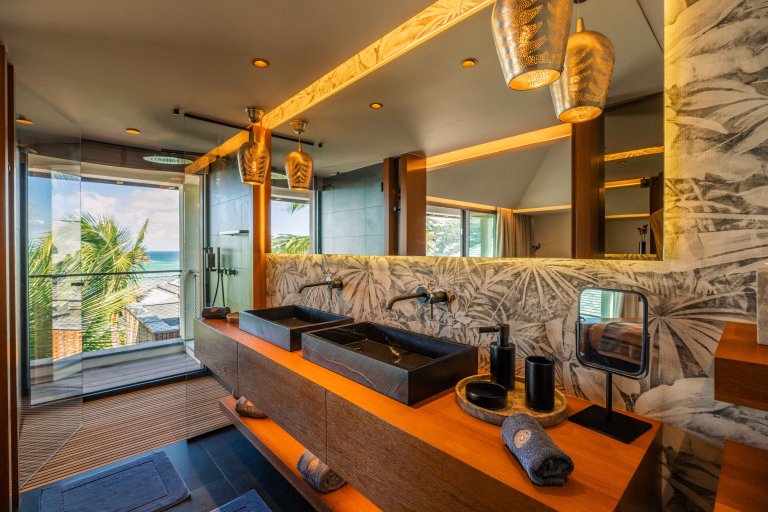 The four bedrooms are arranged to maximize privacy and ease. On the main level, three suites – two to the right of the pool and one to the left – each offer an ensuite bathroom and direct outdoor access. Upstairs, a fourth bedroom enjoys its own ensuite bathroom and a private balcony with elevated views.