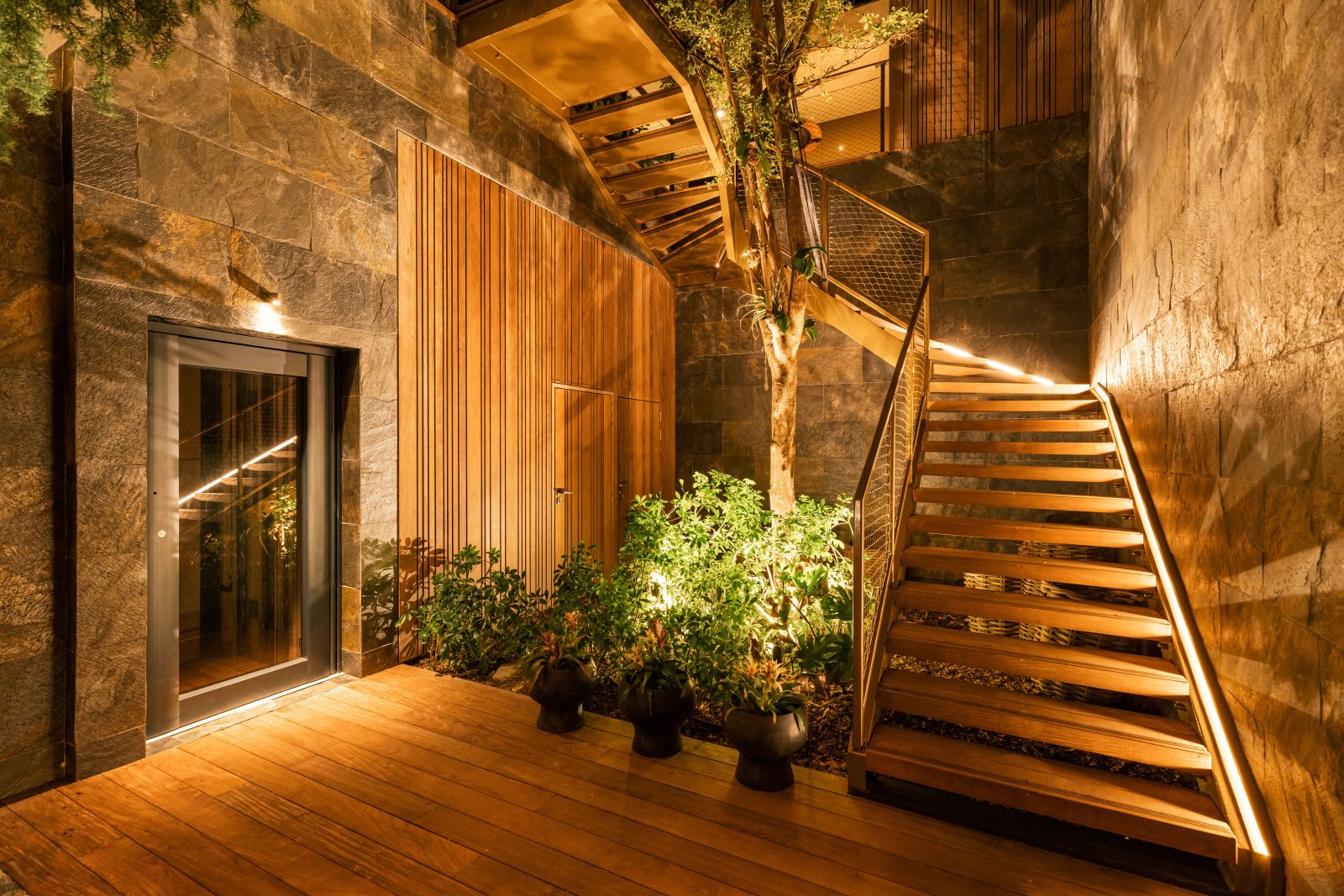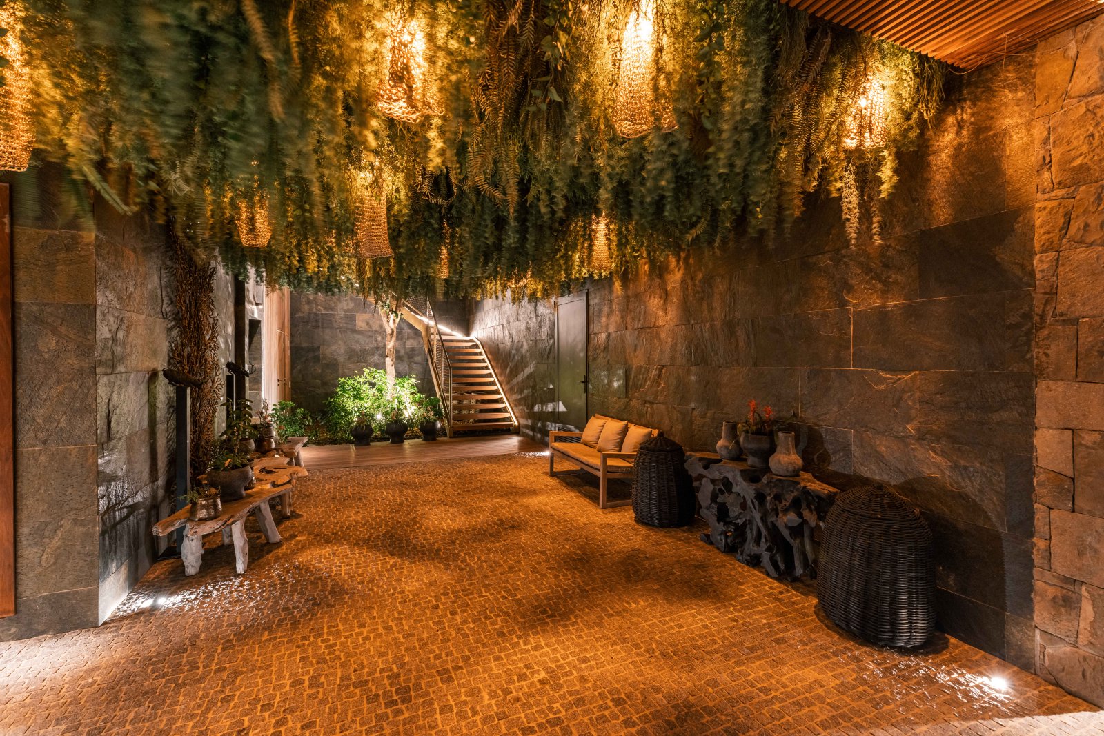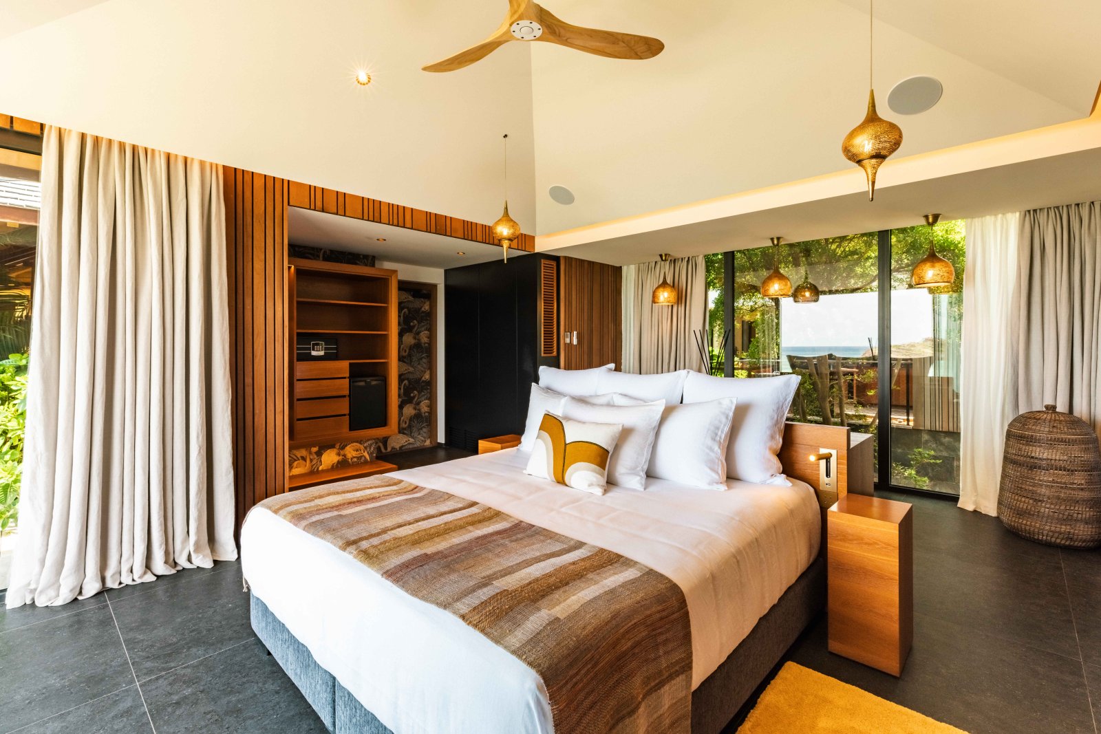 The four bedrooms are arranged to maximize privacy and ease. On the main level, three suites – two to the right of the pool and one to the left – each offer an ensuite bathroom and direct outdoor access. Upstairs, a fourth bedroom enjoys its own ensuite bathroom and a private balcony with elevated views.