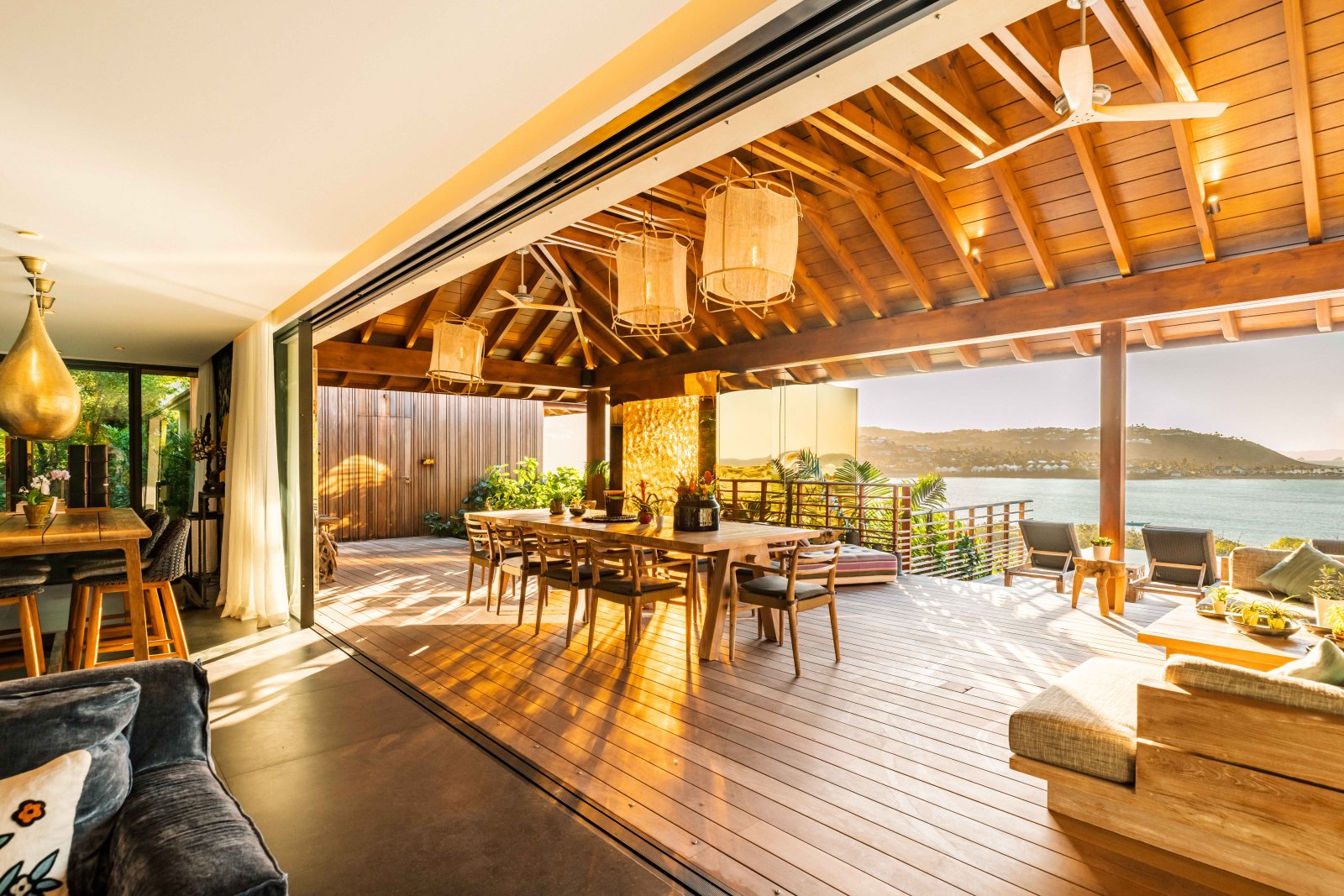 Beyond lies the villa’s focal point: a broad terrace with a heated infinity pool, sun loungers, and shaded spaces for relaxing. From here, the panorama stretches across the lagoon, its colors shifting from bright turquoise by day to softer tones in the evening.