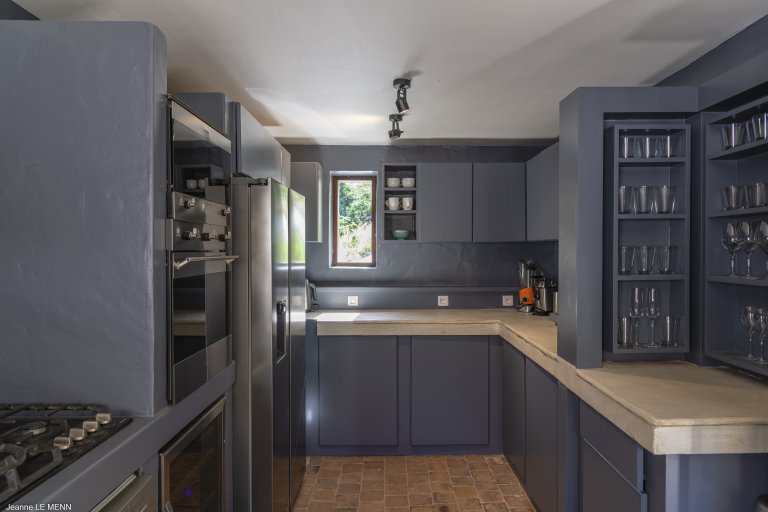 The kitchen occupies its own bungalow with easy access to the dining area and outdoor spaces. The swimming pool is tucked away in the back, while on the front terrace, there is a jacuzzi.