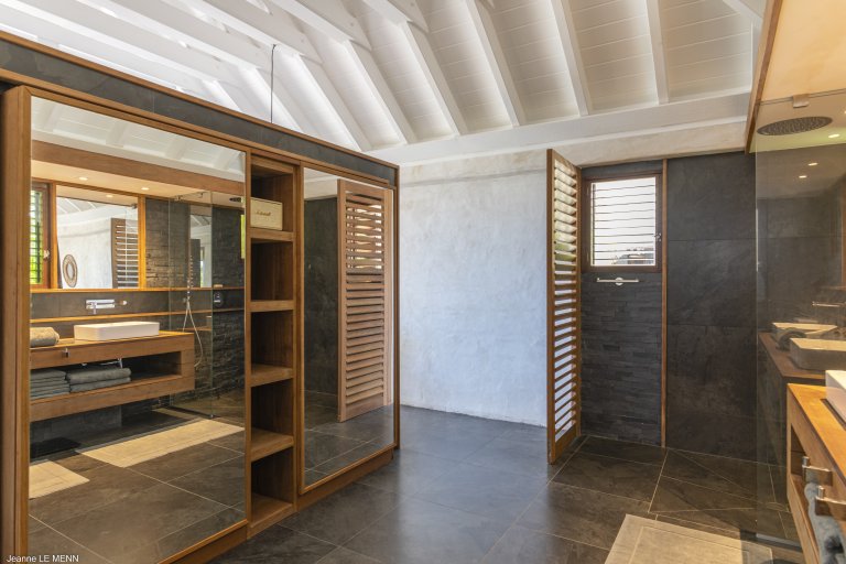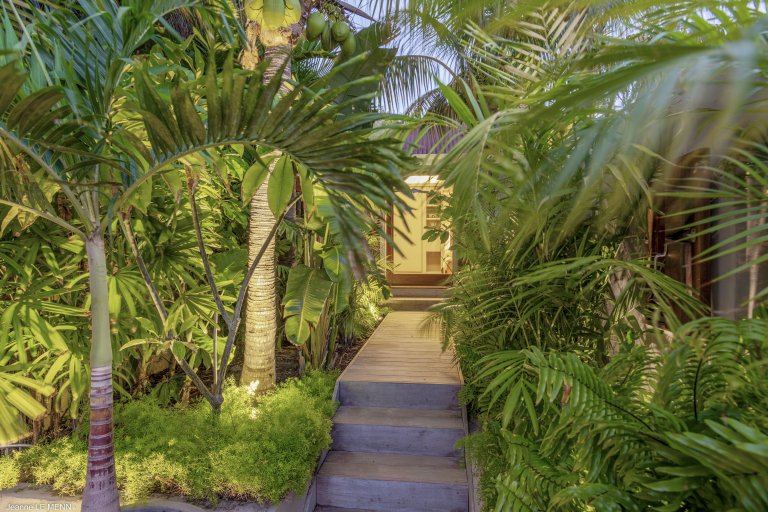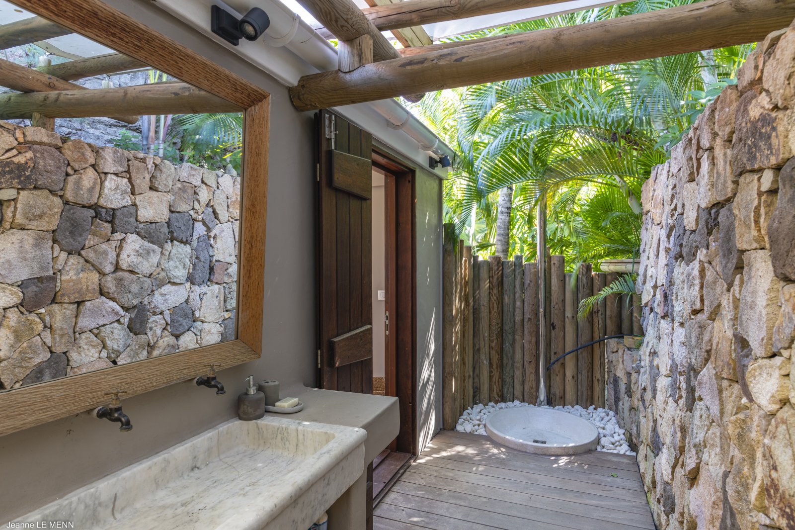Two of the bedrooms are to one side of the living area. Each has a private entrance, although one can also be accessed directly from the living room. The third bedroom is in its own bungalow, down a few steps and on the opposite side of the property. Each bedroom has an ensuite bathroom, one of which is mostly outdoors and surrounded by plants.