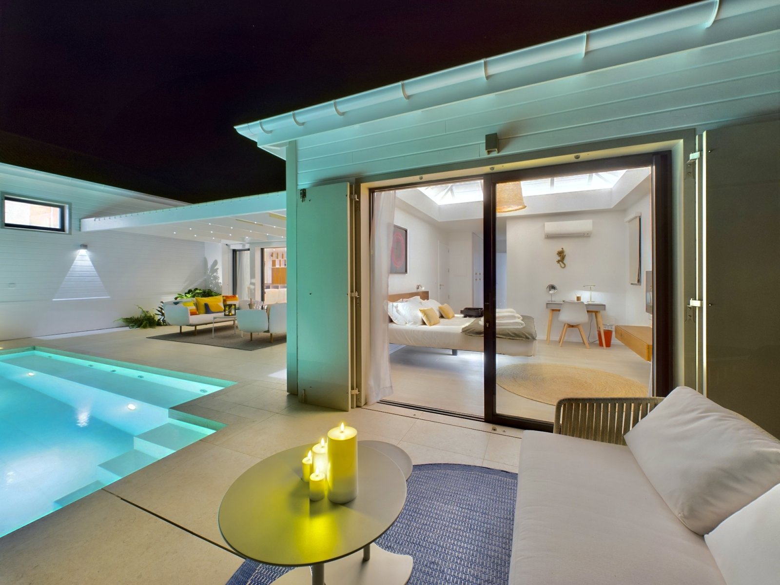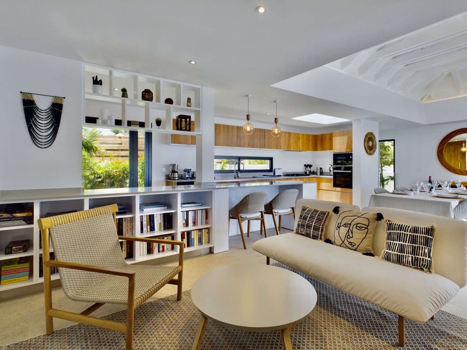Guests arrive at the house by way of the garden, and then they enter the large open-plan living room on the main floor of the villa. This space blends seamlessly into the fully equipped kitchen and onto the terrace, which has covered and sunny areas, as well as a heated infinity pool. While the villa’s architecture and design are understated, its views of the lagoon and the ocean are impressive.