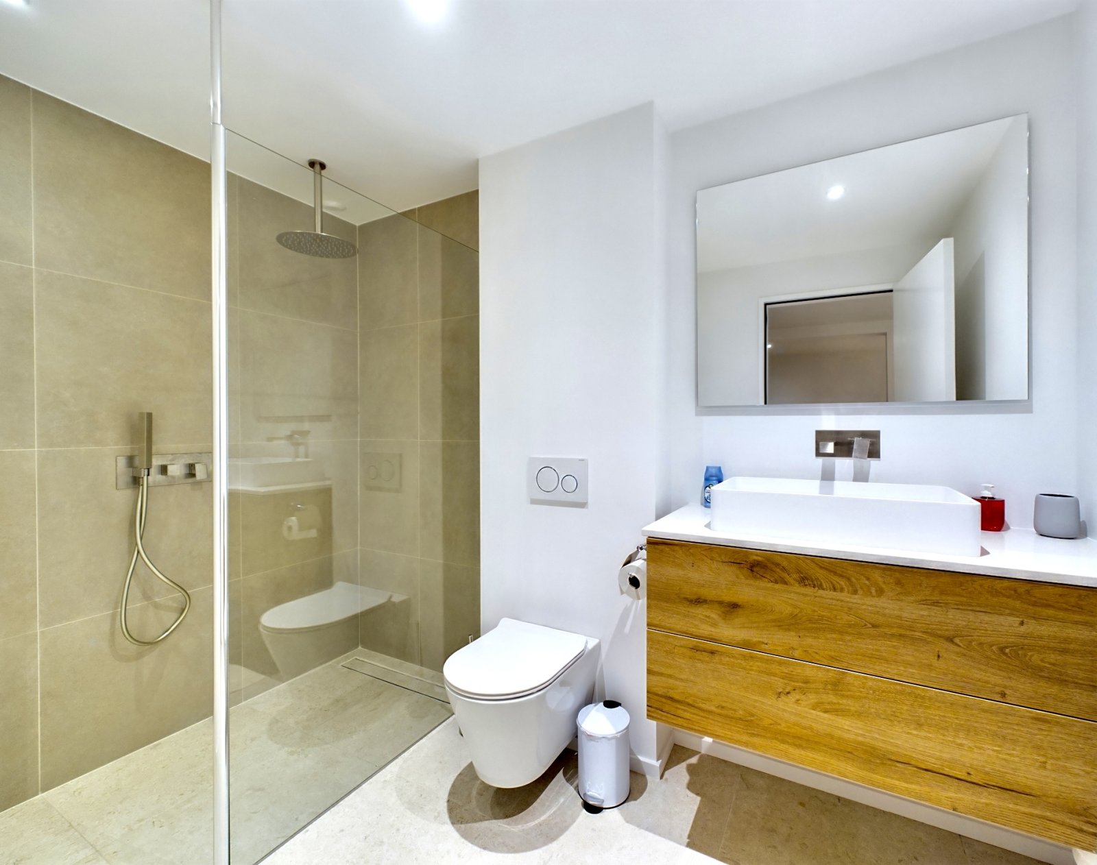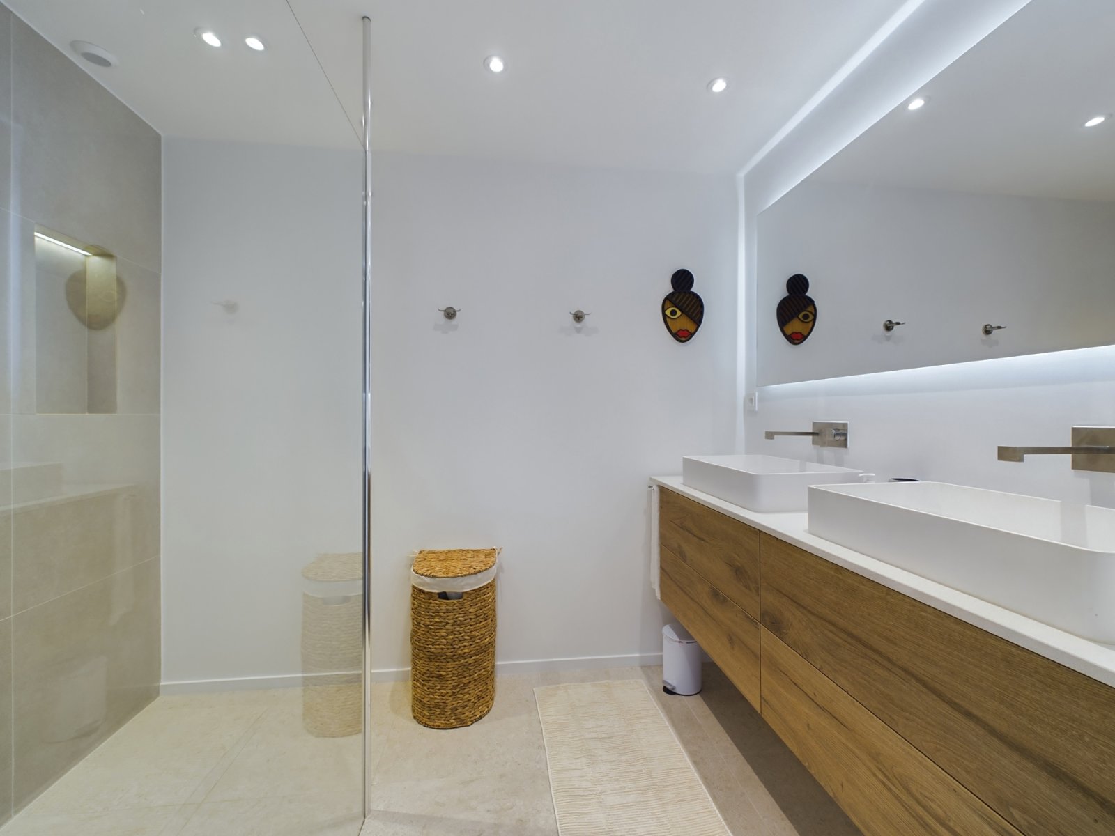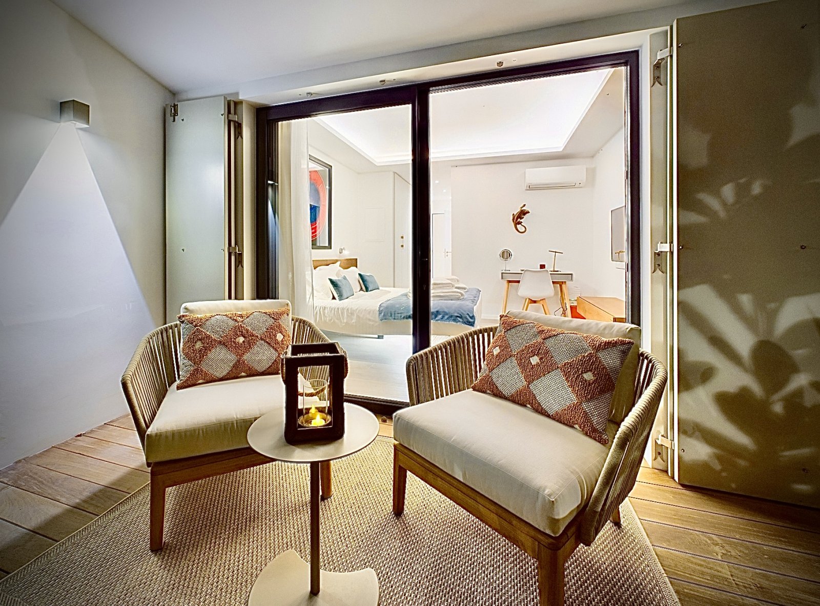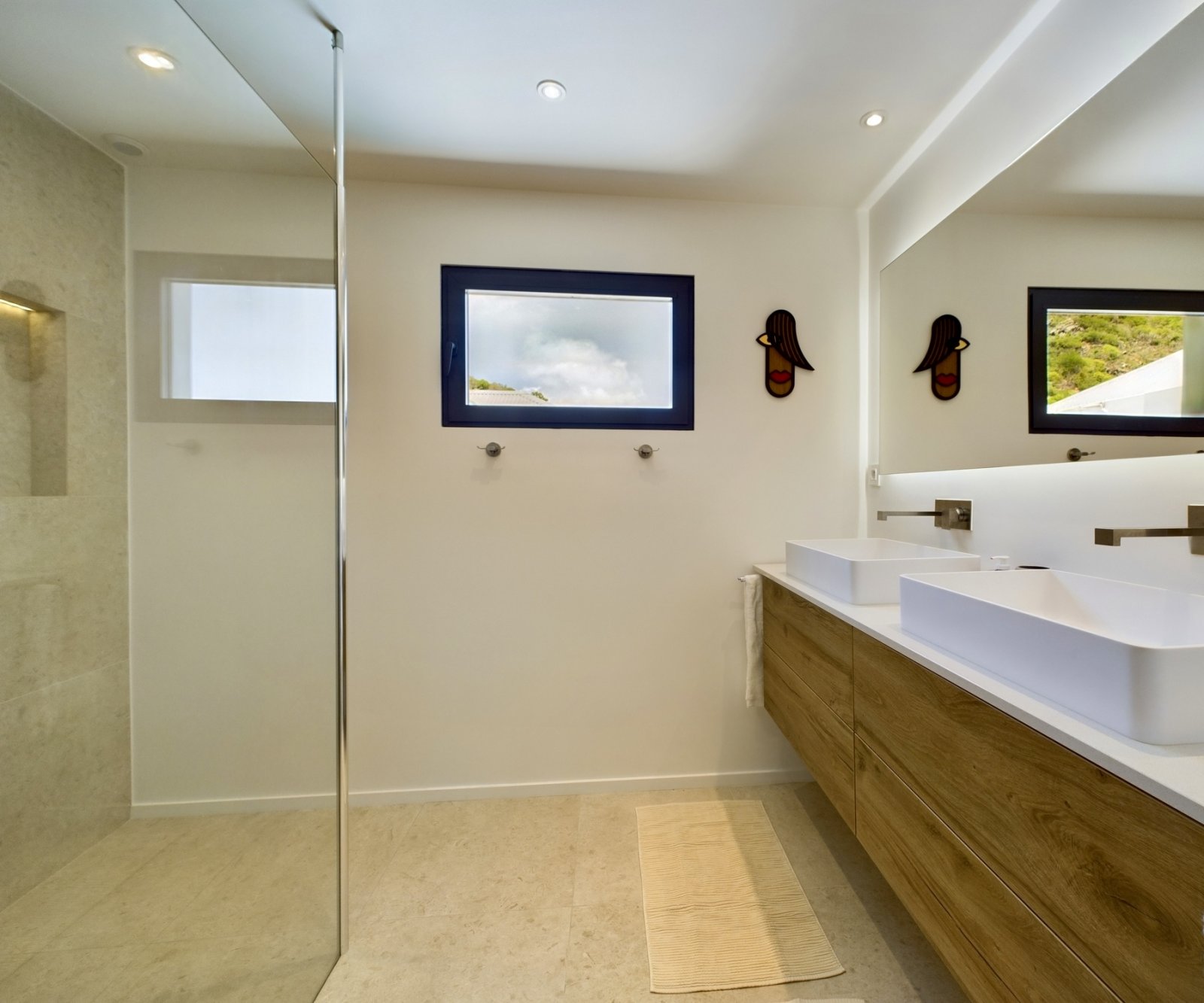 The two main bedrooms are similar in size and located on opposite sides of the living area. Each one has a king-size bed, an ensuite bathroom with a shower, a Smart TV, a dressing area, a sea view, and a small outdoor living space. One of them is a few steps above the main area, while the third bedroom is a full flight of stairs below. This room has the same amenities, except for a partial ocean view and an outdoor space that faces the garden.