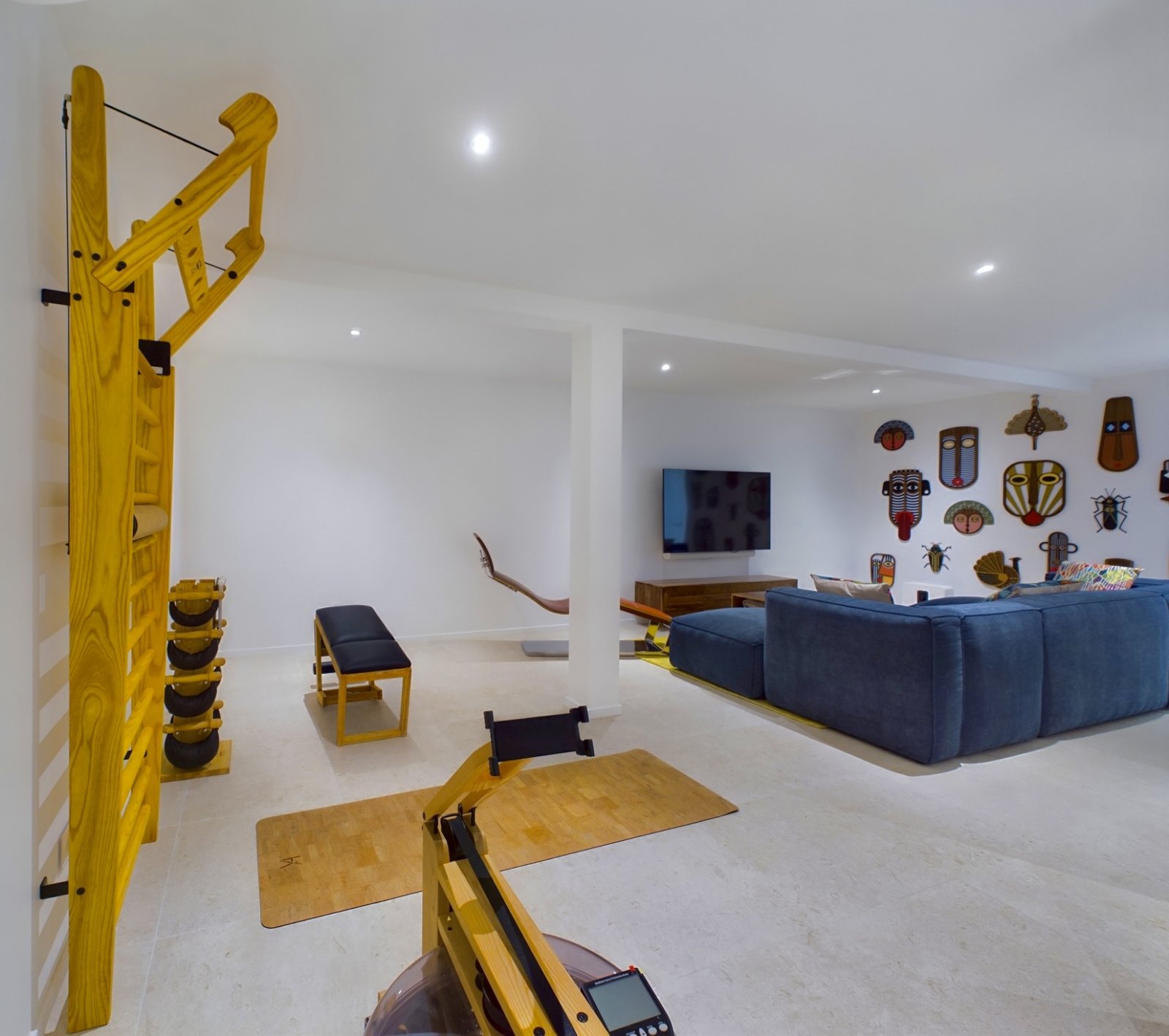Downstairs, there is also a family room with large couches facing a television, a fitness room, and an additional bathroom. The entire villa is fully air-conditioned.