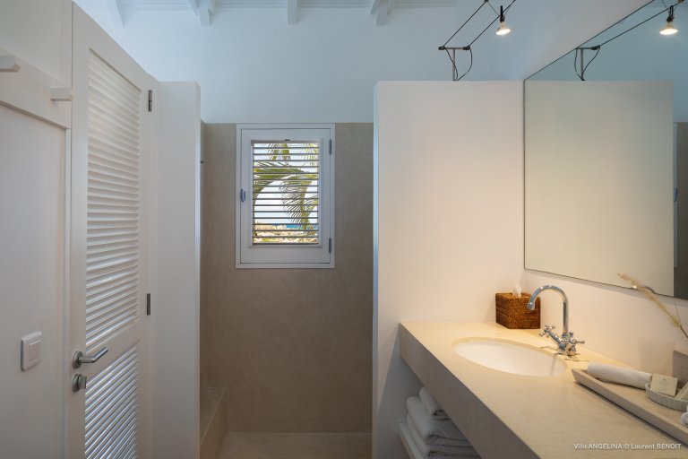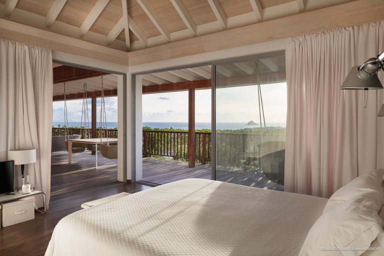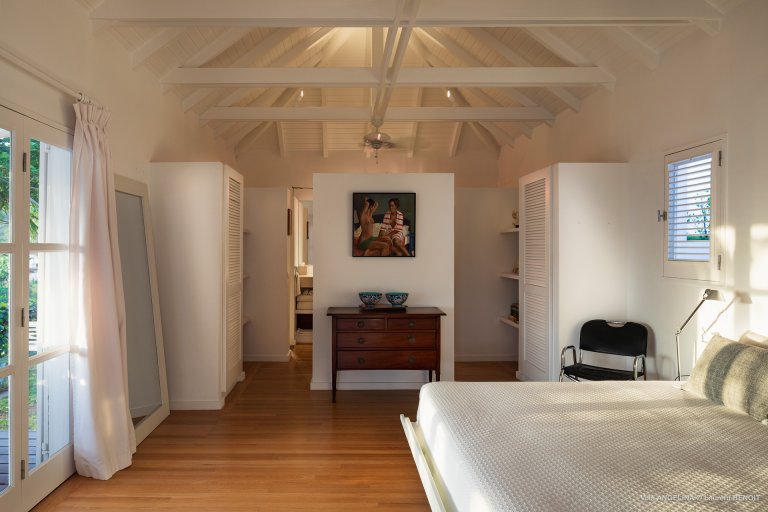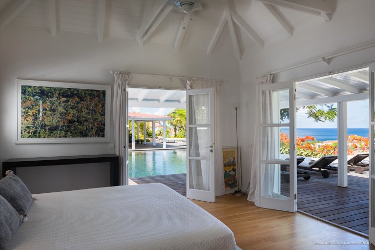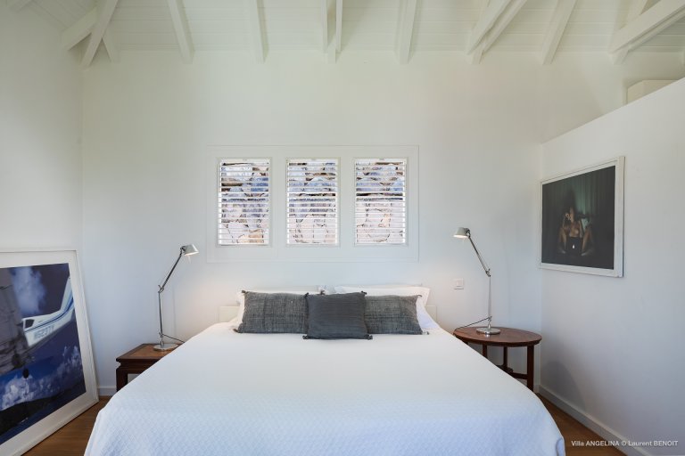 Across the terrace from the living area is Villa Angelina's primary bedroom, with a king bed and luxurious ensuite bath with a rain-head shower and dual vanities. Across the lawn you find the second bedroom, also with a king bed and offering a wonderful view of the harbor all the way to the lighthouse. Blond-wood floors and a walk-in closet add to this bedroom's charm. The third bedroom is similarly appointed. Walk up the stairs to the highest level and you will discover Villa Angelina's piece de resistance, The Loft. A fifth bedroom is situated in an independent bungalow and has its own terrace with a plunge pool and an outside kitchenette.