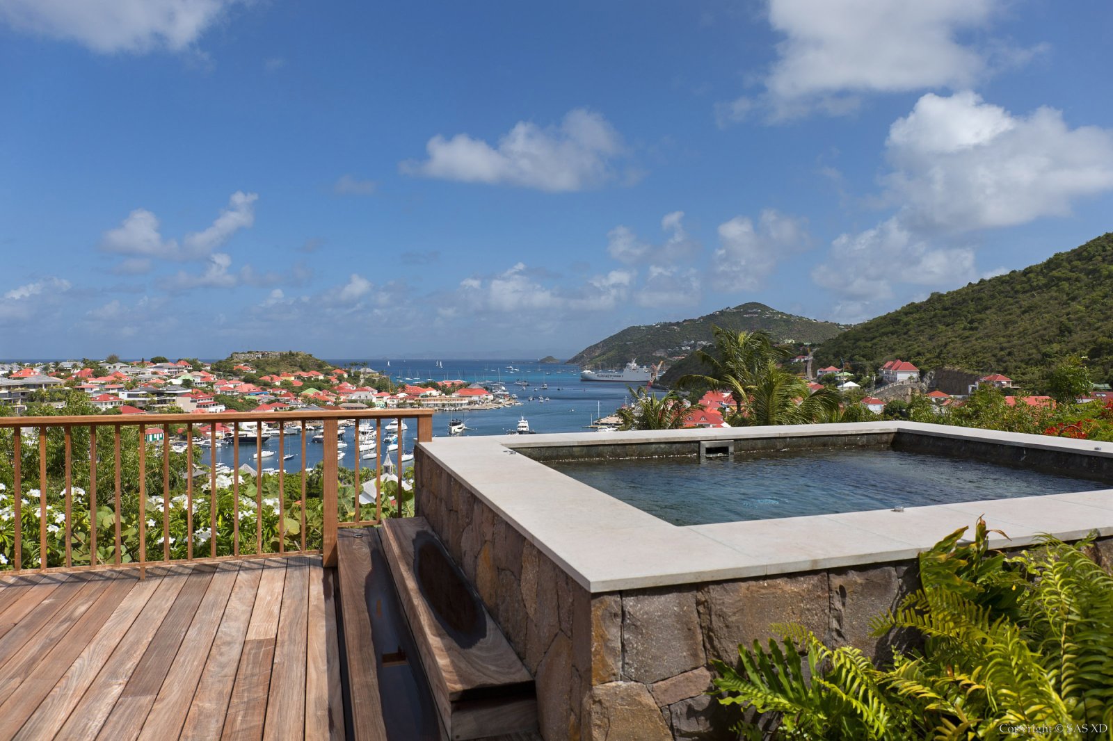 Just a short walk from Gustavia, Villa Angelina (ANG) offers a pleasant and relaxing ambience on a terraced hillside with beautifully landscaped gardens. Constructed as a series of separate bungalows on different levels, complete with a pool on one level and a magnificently tiled plunge pool on another, Villa Angelina offers privacy as well as a great space for entertaining. You enter Villa Angelina to find a welcoming layout that blends this home's indoor and outdoor spaces perfectly. An air conditioned living area with an HDTV looks out over the covered hardwood terrace, green lawn and sun deck around the pool. Comfortable sofas offer plentiful seating both inside and out. Up a few steps are the indoor and outdoor dining areas, along with the fully equipped and convenient kitchen. The rare ambience of this space, especially when the lights of the harbor are illuminated, has brought success to many a party and art exhibition.