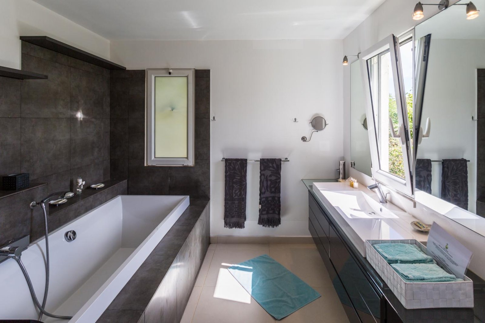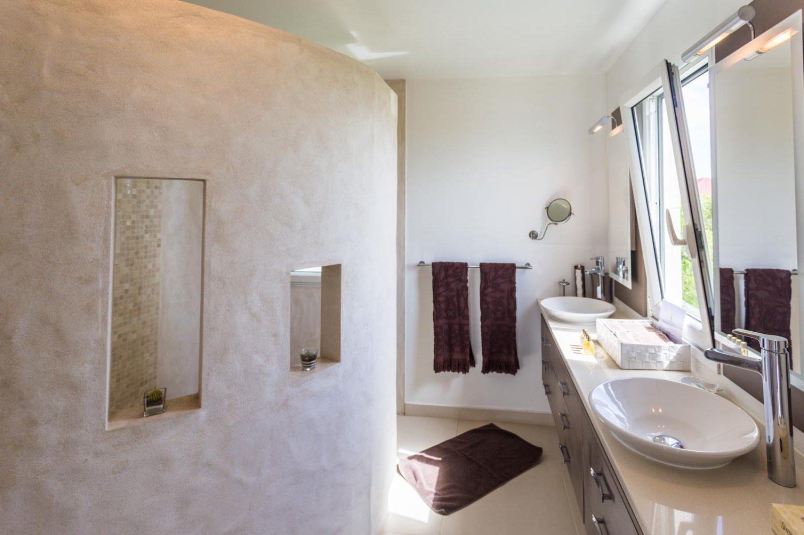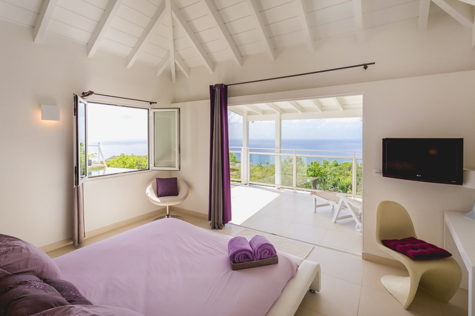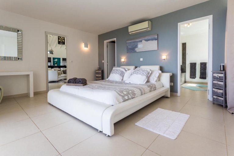 A well-equipped kitchen and a spacious living room opens onto a covered terrace, offering a lovely dining area. The bedrooms are off to the sides of the main living area. The terrace, with its pool and sundeck invites you to take a swim, relax, sunbathe, and later admire the fabulous sunset view.