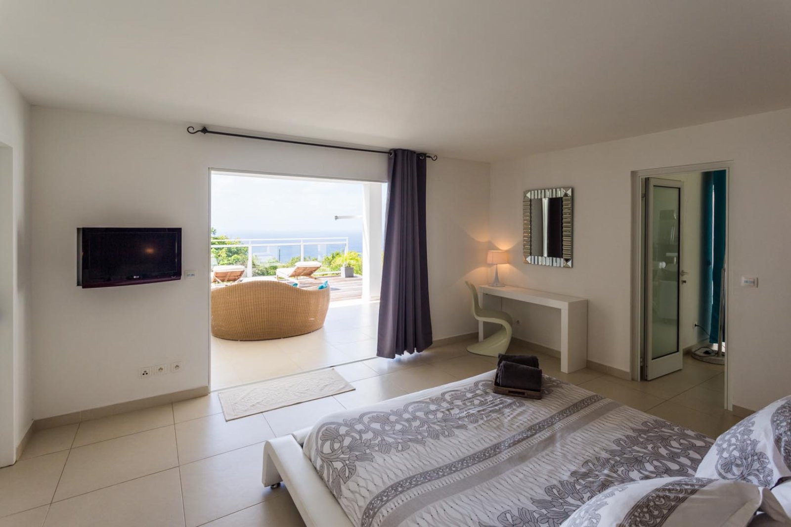 Bed: King Bed • En-Suite Bath with Shower and Bathtub • Flat-Screen, Satellite TV • DVD Player • Dressing Room • Safe • Desk • Additional Seating • Direct Access to Terrace and Pool • Ocean View