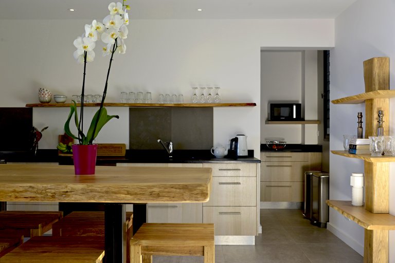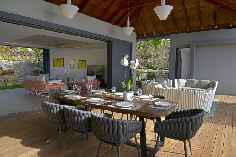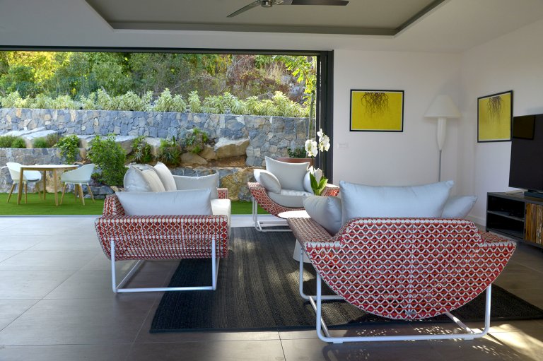 There is also outdoor space on two sides. In the back, there is a grassy garden area (great for children playing) with a seating area and a grill. In front, with the best view to the sea, the main outdoor space by the heated pool extends out to the front, where you can find a large dining table and a seating area. The roof and vaulted ceiling of the indoor living area extends over this terrace, giving parts of it protection from the sun and the sporadic tropical rain, and unifying the design of the entire villa.
