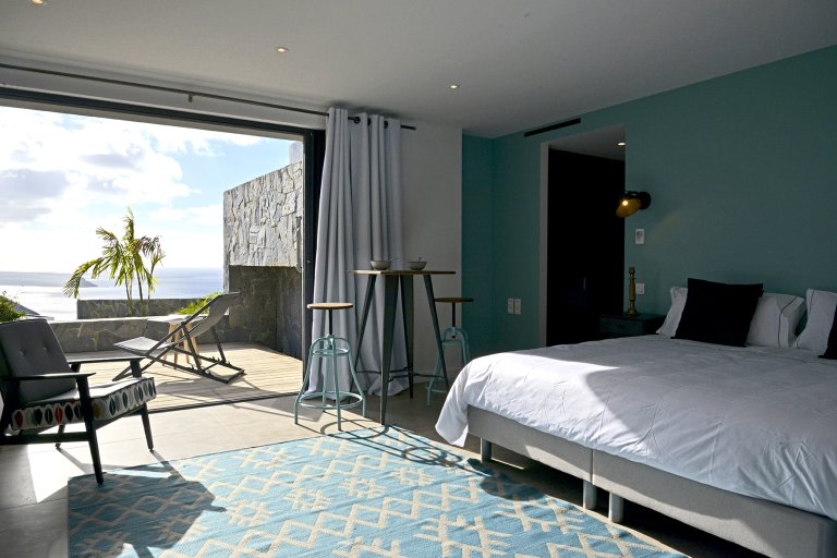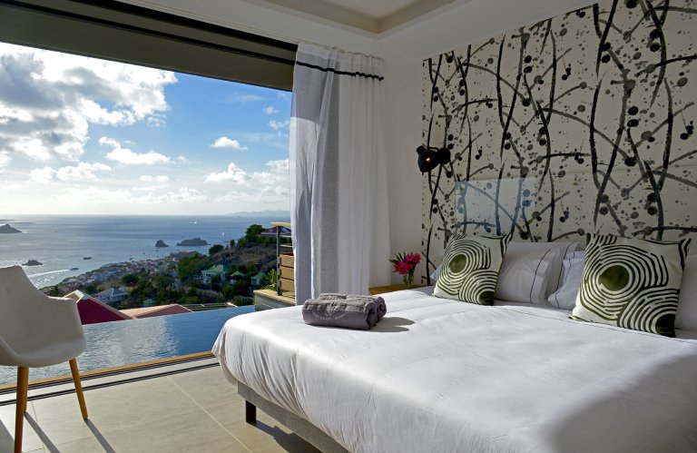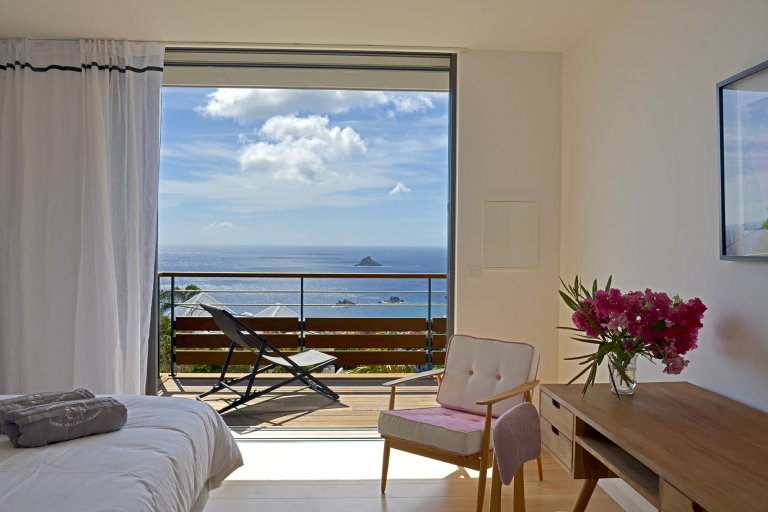 Just a few minutes up the Lurin hillside from Gustavia, the newly built four-bedroom vacation home has full-wall windows overlooking blue skies and bluer seas. The vistas at sunset are particularly stunning.