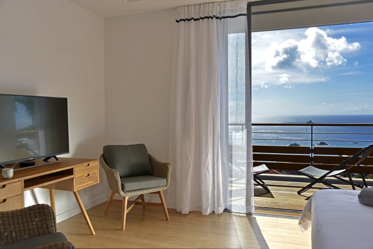 Bed: 2 Twin Beds w/Option as King Bed • En-Suite Bath with Walk-In Shower and Hair Dryer • High Definition TV • Air Conditioning • Ceiling Fan • Additional Seating • Safe • Direct Access to Private Terrace • Ocean View