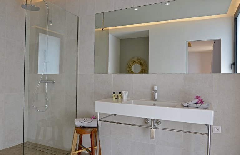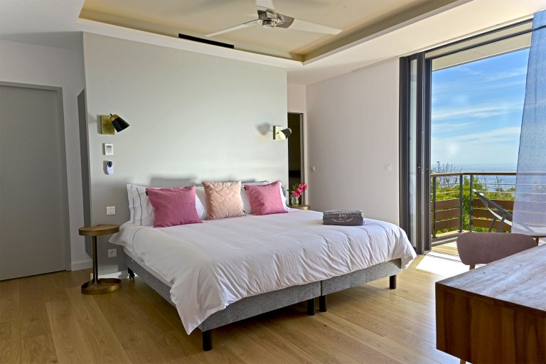 Each of the four sunny, ensuite bedrooms have ocean views. Three of them are on either side of the pool, and the fourth is on the lower level. Each has a king-size bed that can be separated into two twins.
