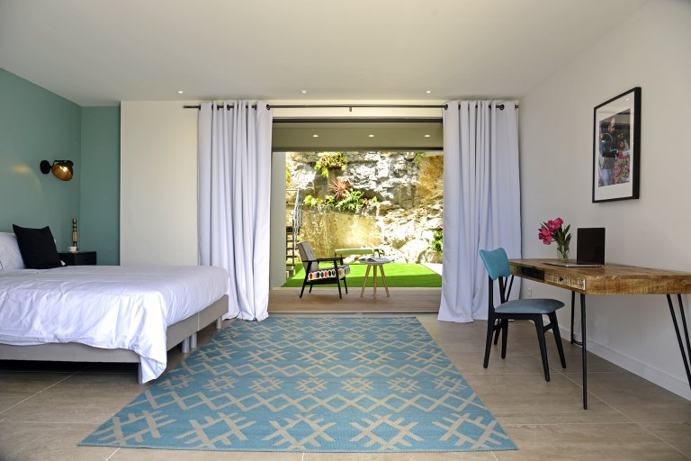 The name of Villa Edunia (EDA) is a tribute to Brazilian-American contemporary artist Eduardo Kac, a multidisciplinal talent who is particularly well known for his works that integrate biotechnology, politics, and aesthetics. That name and idea are most clearly reflected in the artfully modern botanical prints in the wallpaper and cushions, but also in the way that the luxury rental property is integrated into its natural environment.