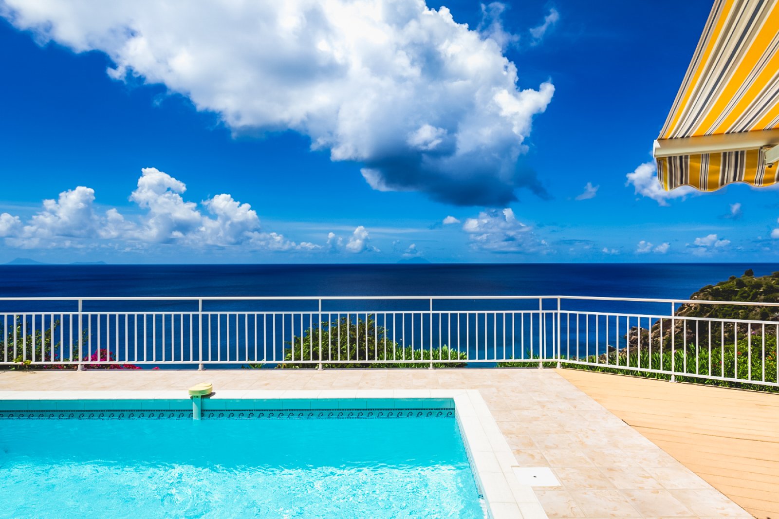 Outdoor living is one of Grand Galet’s charms, as there are terraces on both levels, and the terrace on the main level is comfortable size, sunny and endlessly appealing in an uncomplicated way. A dining table that seats six and a seating area splashed with lime-green cushions are tucked in beneath a festive yellow-and-black-striped awning, enticing you to settle in and enjoy the company of whoever was lucky enough to have been invited along. Out in front of those convivial gathering places, a swimming pool and a line of sunny yellow-cushioned chaises stretch along the edge of the terrace, with nothing more than a white iron fence separating them from the sky and the sea below.